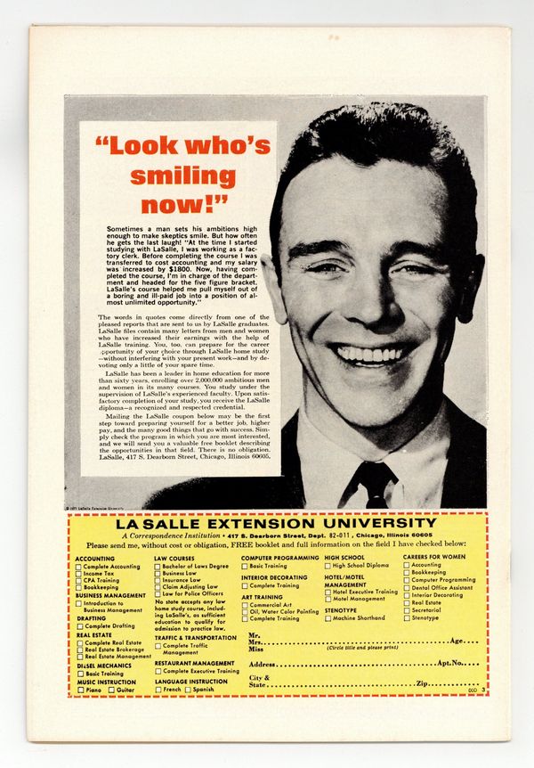 Starts Feb 2 Cover art by Murphy Anderson. One Bridegroom Too Many!, script by John Broome, pencils by Carmine Infantino, inks by Joe Giella; Reverse Flash impersonates Barry Allen with the intent of marrying Iris West; luckily, Barry marries Iris in the end; Craig "Mr. Silver Age" Schutt has called this the greatest Silver Age wedding of all time. Lost--A Free Education! public service announcement starring Binky, script by Jack Schiff, art by Bob Oksner. Caps Hobby Hints strip by Henry Boltinoff. 80 pg. Giant Justice League ad. Batman Magic Photo Kit ad. Plastic Man ad. Letter from noted letter hack Guy H. Lillian III. Caps Hobby Hints strip by Henry Boltinoff. G.I. Joe Club ad. Back cover model kit ad featuring Captain Kidd, The Frog, Forgotten Prisoner of Castelmare, and The Green Beret. 36 Pages, Full Color. Cover price $0.12.
