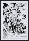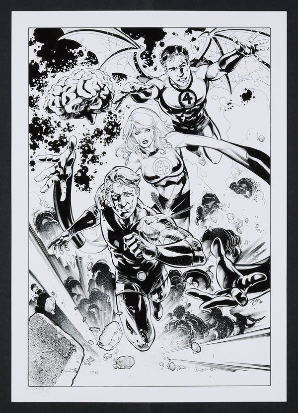 A stunning, cover-worthy piece from Cifuentes that looks to the classic What If? #6 from 1977 for inspiration. In that issue, The Watcher looked in on a world where the Cosmic Rays that gave the FF their powers were influenced by the team's personalities- Pilot Ben Grimm sprouts wings, gearhead Johnny Storm becomes a robot, the ever-patient and understand Sue Storm gains stretching and shape shifting powers, and genius Reed becomes a powerful telepathic brain! Cifuentes renders this altered team beautifully with loads of detail and flourish- the Kirby Krackle surrounding BrainReed especially. Signed by the artist. Ink over printed blue line pencils on art board. 11 3/4" x 16 1/2".