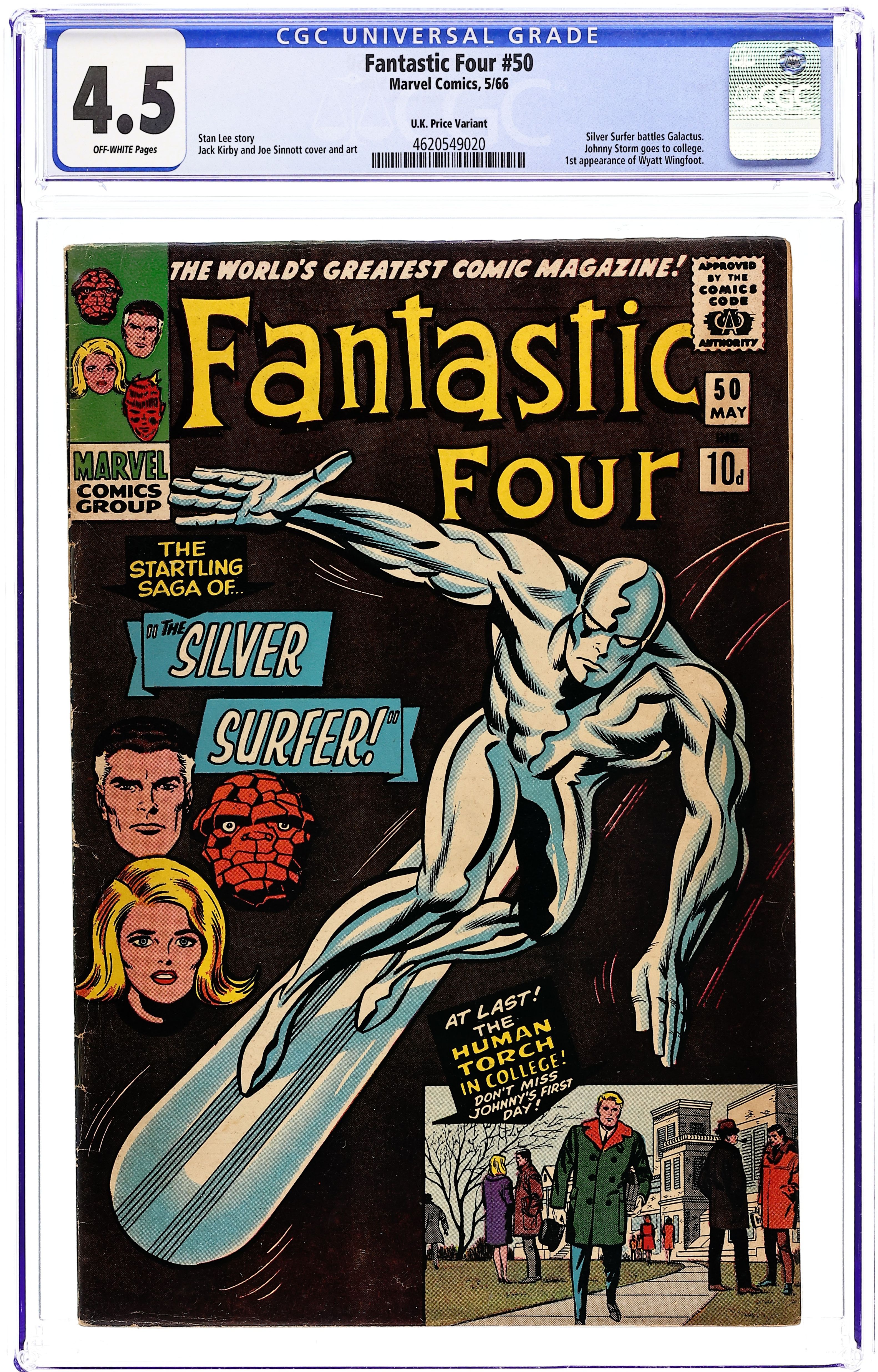 Starts Jul 4 UK edition. Identical to US edition but has 10d cover price. Cover pencils by Jack Kirby, inks by Joe Sinnott. Galactus battles the Silver Surfer in the conclusion of the Galactus Trilogy, The Startling Saga of the Silver Surfer!, script by Stan Lee, pencils by Jack Kirby, inks by Joe Sinnott; With the aid of the Silver Surfer, the Fantastic Four force Galactus to leave Earth; Johnny Storm begins to attend Metro College and meets Wyatt Wingfoot. Watcher and Inhumans appearances. First appearance of Wyatt Wingfoot. Letter to the editor from comics writer Gerry Conway. 10d. 32 pgs.