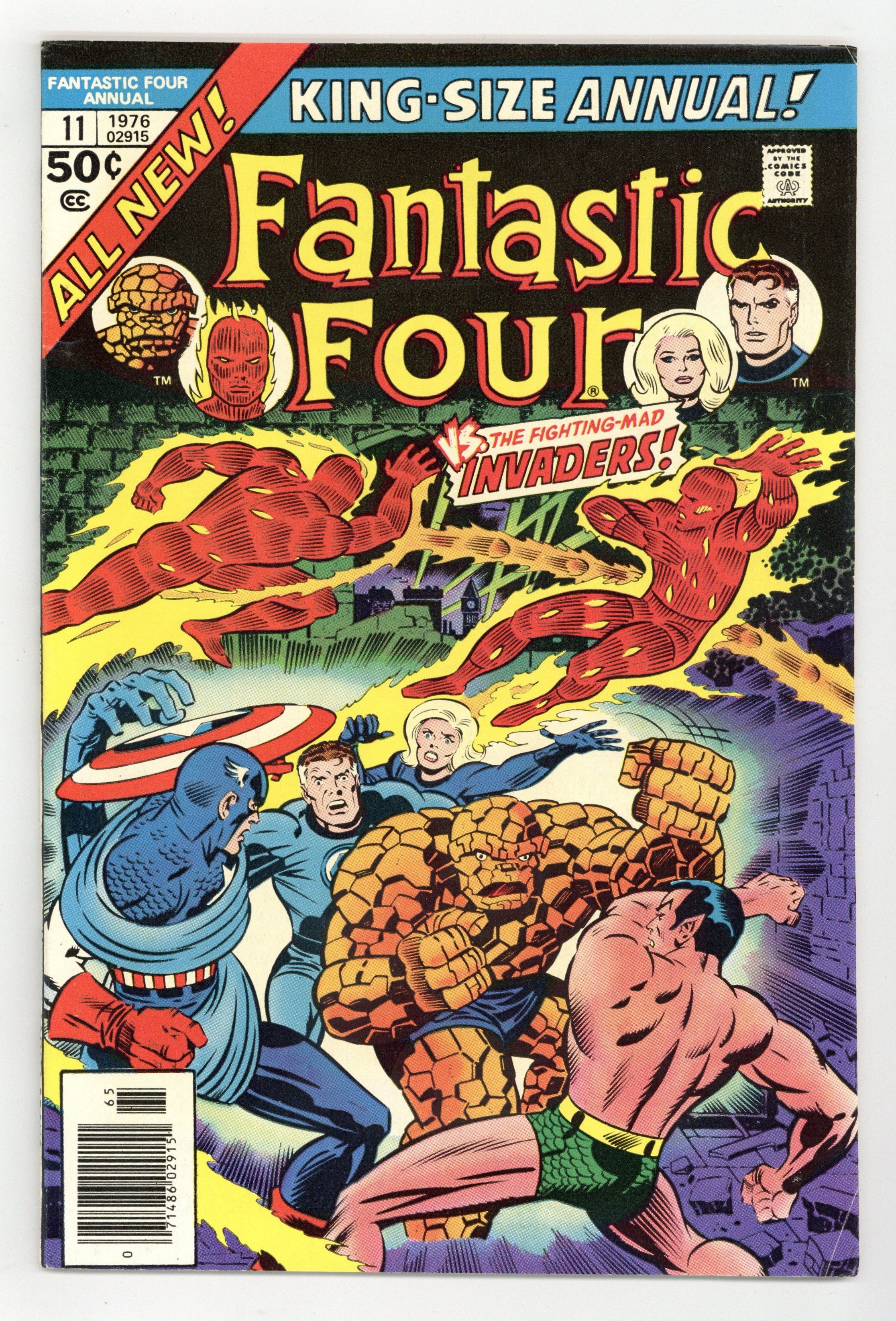 Starts May 11 "And Then the Invaders!" Guest-starring the Invaders. New story by Roy Thomas. Pencils by John Buscema. Inks by Sam Grainger. Cover by Jack Kirby and Joe Sinnott. While the FF are participating in a routine training session, a platoon of nazi soldiers suddenly appears in the Baxter Building! Reed's time machine says the soldiers came forward from the year 1946! But hold on, didn't World War II end in 1945? Something has gone terribly wrong 30 years in the past, so the Fantastic Four travel back in time to change the course of history! After linking up with the Invaders, the fabulous foursome along with Captain America, Bucky, the Original Human Torch, Toro, and the Sub-Mariner invade Castle Cherbelle in occupied France to destroy the Third Reich's V-2 program! But Baron Zemo isn't going down without a fight! An awesome story! Cameo appearance by the Watcher. (Note: Elements of the story continue in Marvel Two-in-One Annual 1.) 52 pages Cover price $0.50.