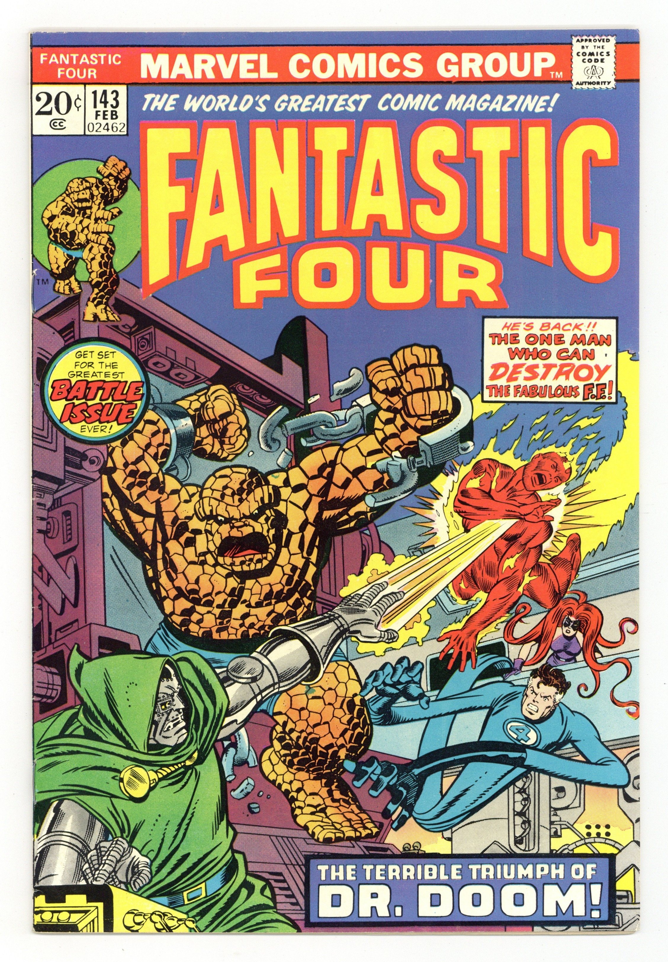 Starts Apr 20 52-page giant issue. "The Alien, the Ally, and Armageddon!" Part 4 of 4. Script by Archie Goodwin. Pencils by John Buscema. Inks by Joe Sinnott. Cover by John Buscema and Joe Sinnott. The Over-Mind is in supreme control! And with Mr. Fantastic by his side, he's set to conquer the Earth! However, Sue, Ben, and Johnny are not giving up! The Thing and Torch bravely attack the Over-Mind one more time, but are defeated again. When the Invisible Girl sees her friends fall, she knows she must find other super-heroes to help! But the Avengers aren't home, and there's no sign of Spider-Man or Daredevil or Prince Namor or even the Hulk! Is anyone else available? Unfortunately, no super-heroes, but what about a super-villain? And one from Latveria no less? Desperate times call for desperate measures...and in stunning fashion Doctor Doom joins the Fantastic Four to battle the near omnipotent Over-Mind! Can Victor Von Doom and his long-time adversaries turn the tide against the Over-Mind? Or will they need help from a stranger? A bronze age classic! Cameo appearances by Jarvis, Agatha Harkness, Franklin, the Watcher, and the Stranger. (Notes: Doctor Doom appears next in Sub-Mariner 47. The Over-Mind returns years later in Defenders 112 and 113. This issue was reprinted in Marvel ?s Greatest Comics 96. The letters page includes a letter from comics editor and writer Bob Rozakis.) 52 pages Cover price $0.25.