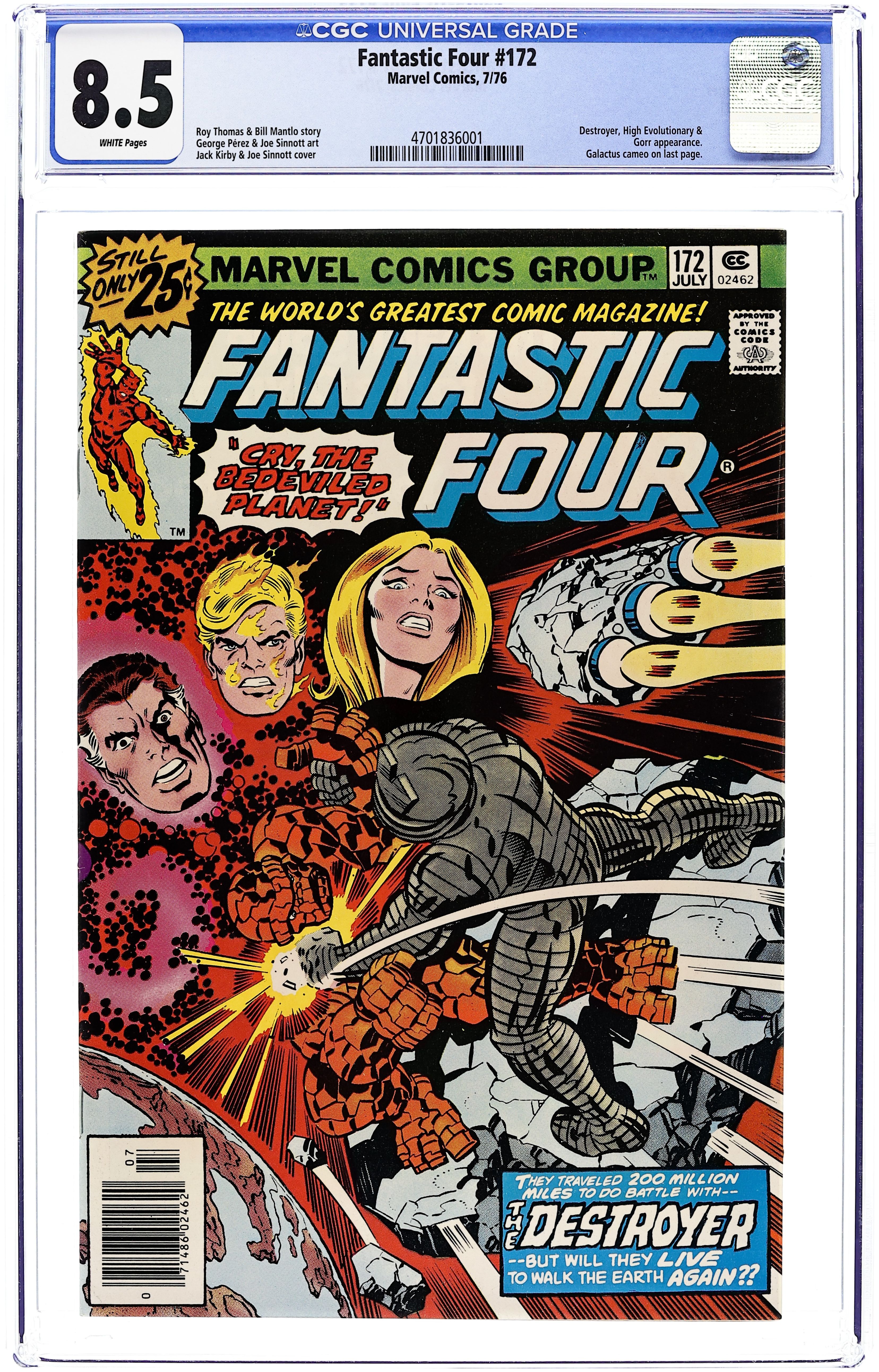 Starts May 4 "Cry, The Bedeviled Plant!" Part 2 of 5. Plot by Roy Thomas. Script by Bill Mantlo. Pencils by George Perez. Inks by Joe Sinnott. Cover by Jack Kirby and Joe Sinnott. After being tricked into boarding Gorr's spaceship, the Fantastic Four reluctantly agree to protect Counter-Earth from the Ravager of Worlds! But the FF may be too late since Galactus' herald, the Destroyer, has already engaged the High Evolutionary on his command asteroid. Nevertheless, the Thing springs into action against the armored herald! Can Ben beat the Destroyer before Galactus becomes aware of Counter-Earth? Flashback cameos by Adam Warlock and the Hulk to recap the events of Incredible Hulk 178. (Notes: Both Galactus and the Destroyer previously appeared in Thor 228. A 30-cent cover price variant exists for this issue.) 36 pages Cover price $0.25.