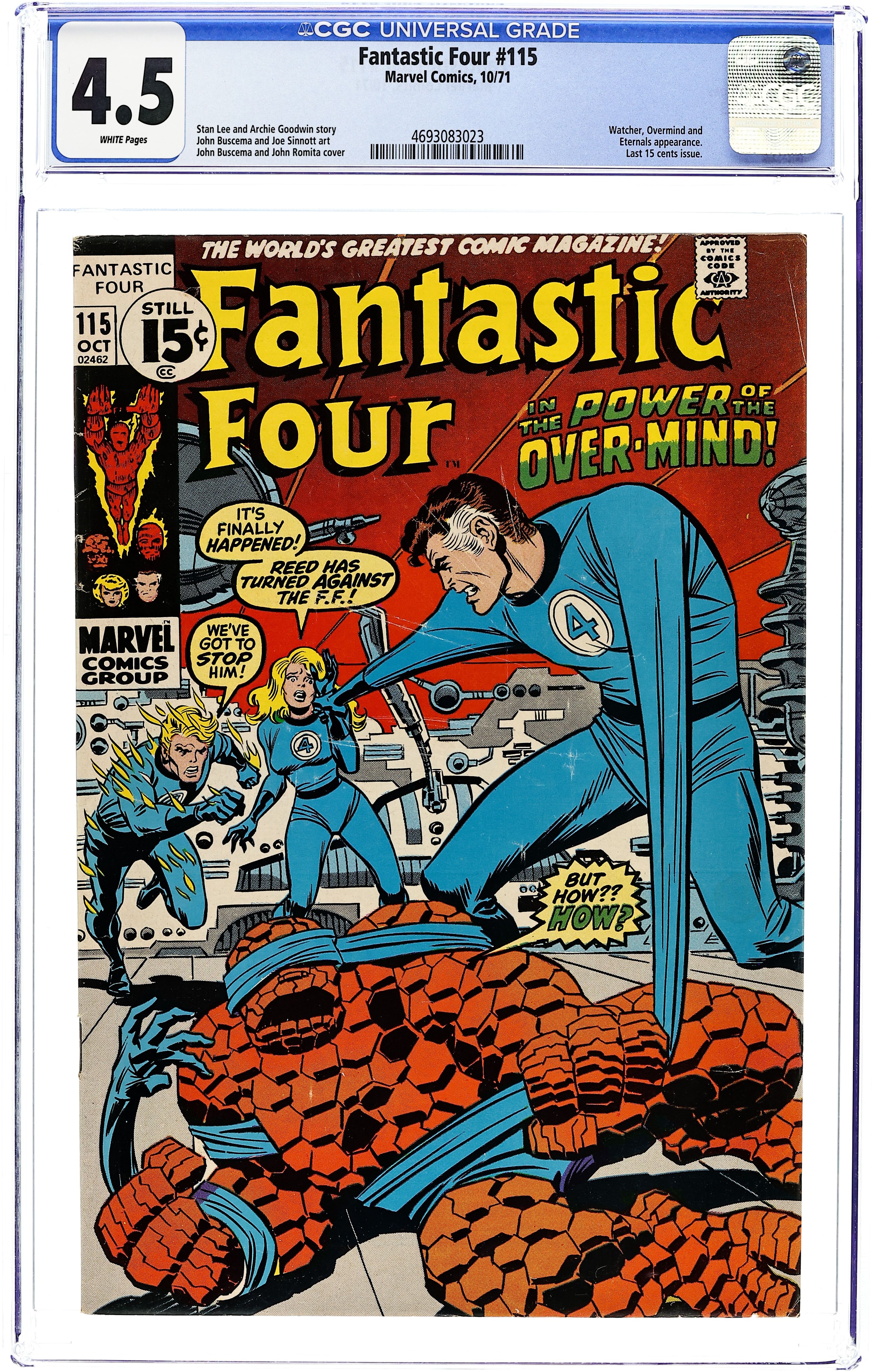 Starts Apr 27 "The Secret of the Eternals" Part 3 of 4. Plot by Stan Lee. Script by Archie Goodwin. Pencils by John Buscema. Inks by Joe Sinnott. Cover by John Buscema, Frank Giacoia, and John Romita (touch-ups). The Watcher tells the FF the incredible origin of the Over-Mind! But Reed, Sue, Ben, and Johnny don't remember fighting the Eternals' powerful warlord last issue. Did the foursome somehow forget? When Mr. Fantastic starts to put two and two together, the Over-Mind strikes! And now a possessed Reed Richards attacks his teammates and embarks on a mission of conquest for the Over-Mind! Last 15¢ issue. (Note: This issue includes a full-page ad for the first issue of Marvel Feature (1st series) starring the Defenders.) 36 pages Cover price $0.15.