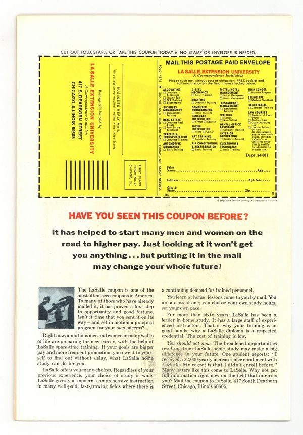 Starts Apr 27 Cover art by Gray Morrow. "Man-Thing!", script by Gerry Conway, pencils by Howard Chaykin, inks by Gray Morrow; The Man-Thing discovers an infant being abandoned in the swamp, prompting it to seek retribution for the heinous act. "The Spell of the Sea Witch!" starring Iron Man, Thor and Captain America, script by Allyn Brodsky, pencils by Jack Katz (as "Jay Hawk"), inks by Bill Everett (as "Black Bill"). "There Is Something Strange About Mister Jones!", art by Don Heck; A thug hears a man say that he has a fortune in his locker. He attacks him and tries to make him lead him there. His victim is Davy Jones, and he shows the thief his locker by drowning him. 36 pgs., full color. Cover price $0.20.