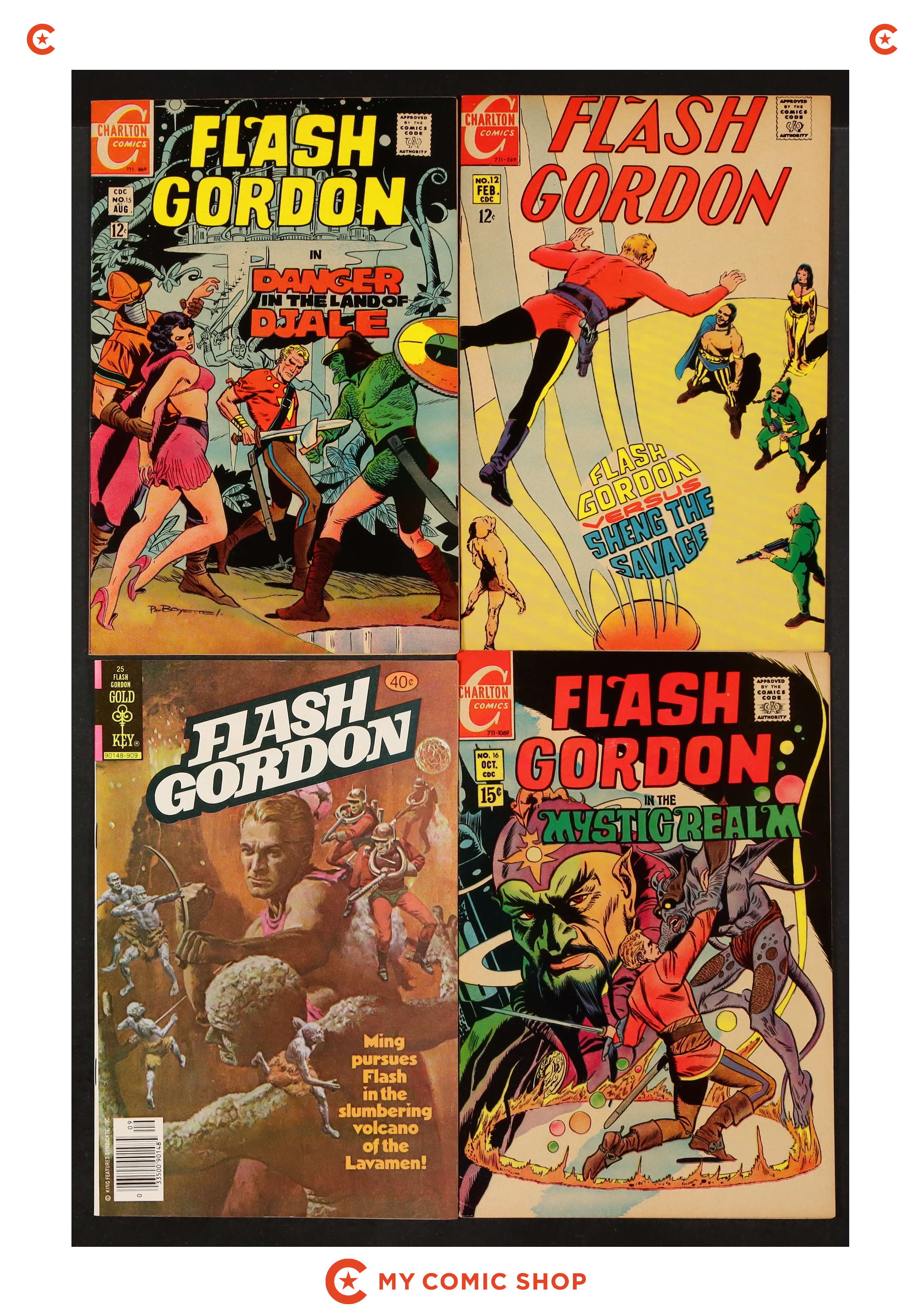 Issues 12, 15, 16, 25 of Flash Gordon (1966 King/Charlton/Gold Key). Most will grade in the FN/VF range.