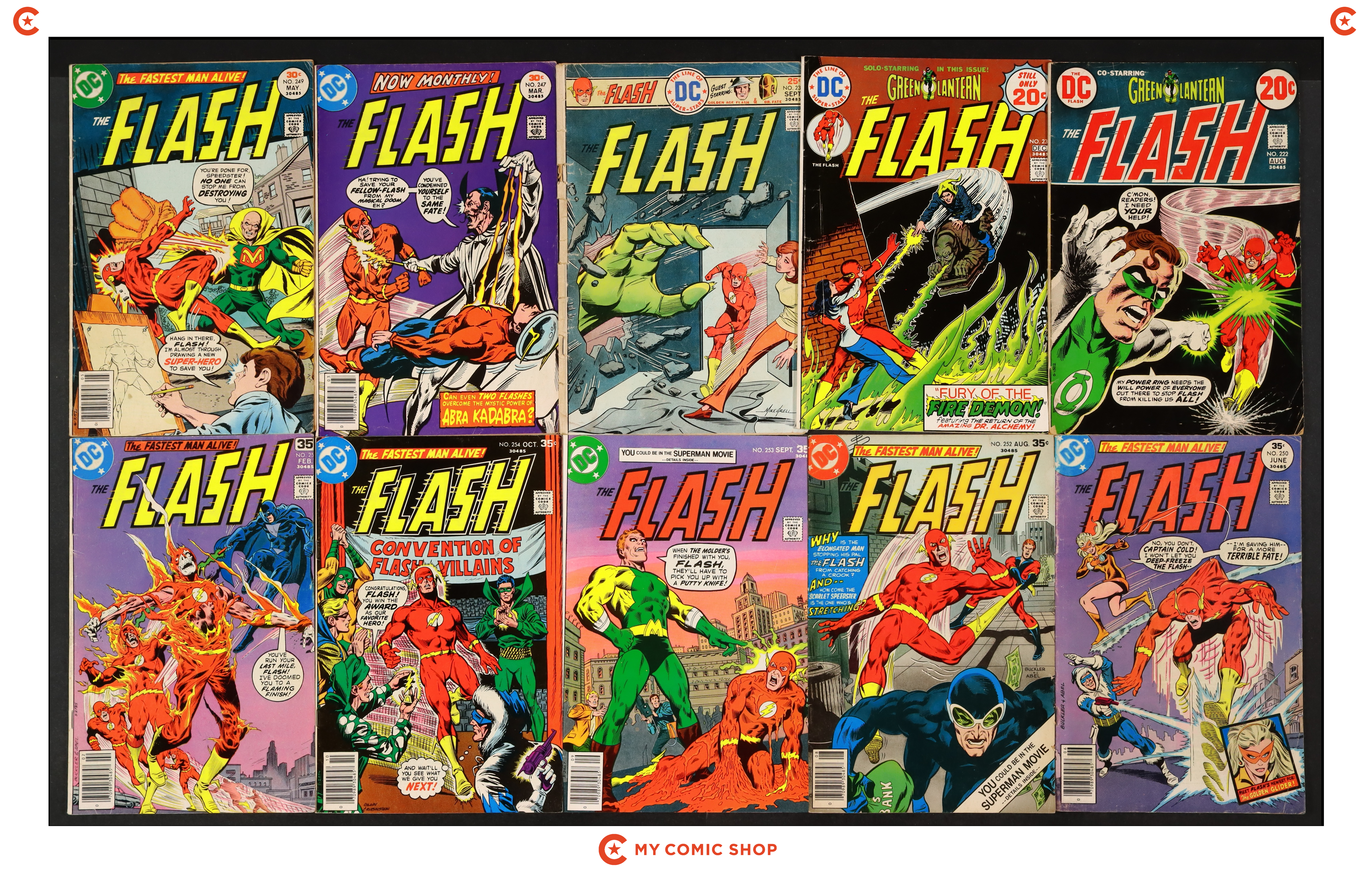 Issues 222, 230, 236, 247, 249, 250, 252-254, 258 of Flash (1959 1st Series DC). Most will grade in the GD- to VG+ range.