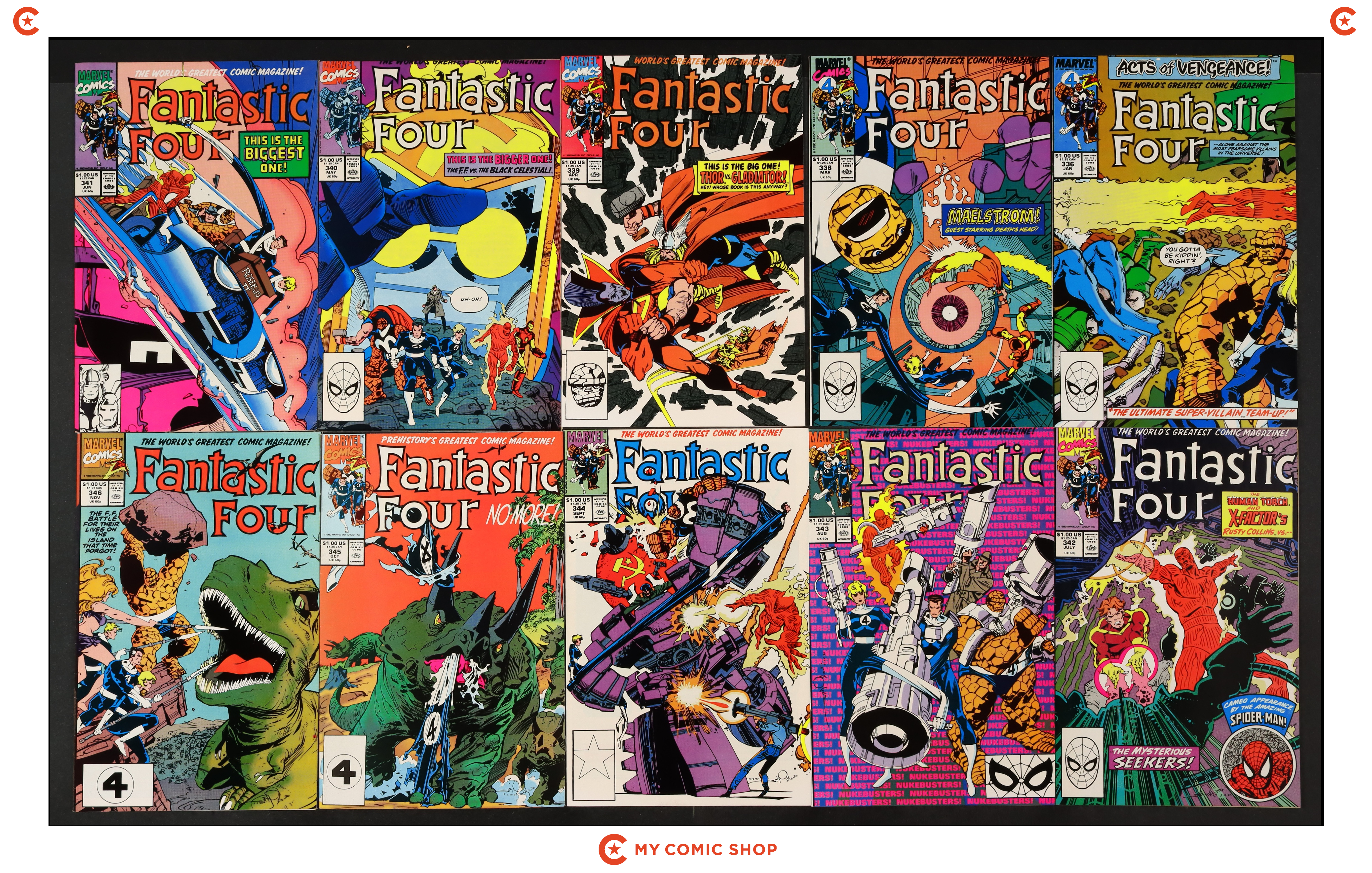 Issues 326D, 327, 328, 329, 330, 331, 332, 333, 334, 335, 336D, 338D, 339D, 340, 341D, 342, 343, 344, 345D, and 346 of Fantastic Four (1961 1st Series). Most will grade in the FN to VF range.