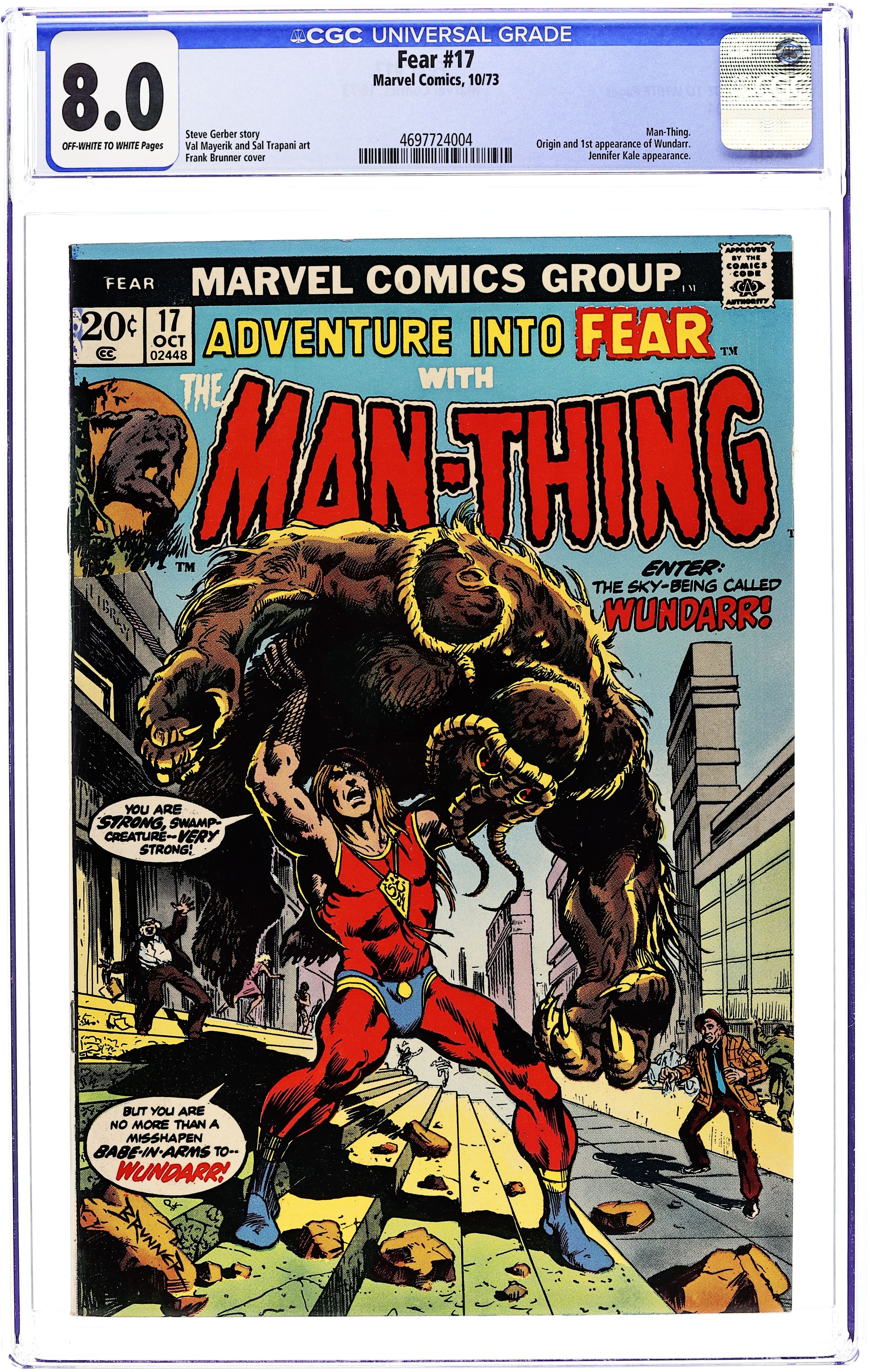 Starts Apr 27 Cover art by Frank Brunner. "It Came Out of the Sky!", script by Steve Gerber, pencils by Val Mayerik, inks by Sal Trapani; The Man-Thing stumbles across an alien ship that has crashed in the swamp; Inside is Wundarr, an alien from another planet which was doomed to explode. Wundarr's parents, wanting their son to survive sent him into space in a rocket, hoping their boy would find a new home; That home turned out to be Earth, but when Wundarr crash landed, he was not found for many years and grew to adulthood without any sort of education; Freed by the Man-Thing, the now infantile adult of Wundarr begins to explore this strange new world, and his super-human abilities; Wundarr's curiosity and inability to understand his own actions prompts the Man-Thing to believe he is being attacked, and the two end up in a battle which takes them into the town of Citrusville, where the two combat each other; Wundarr, making his first appearance, is a take-off on Superman; His next appearance is in Marvel Two-In-One #2. 36 pgs., full color. Cover price $0.20.