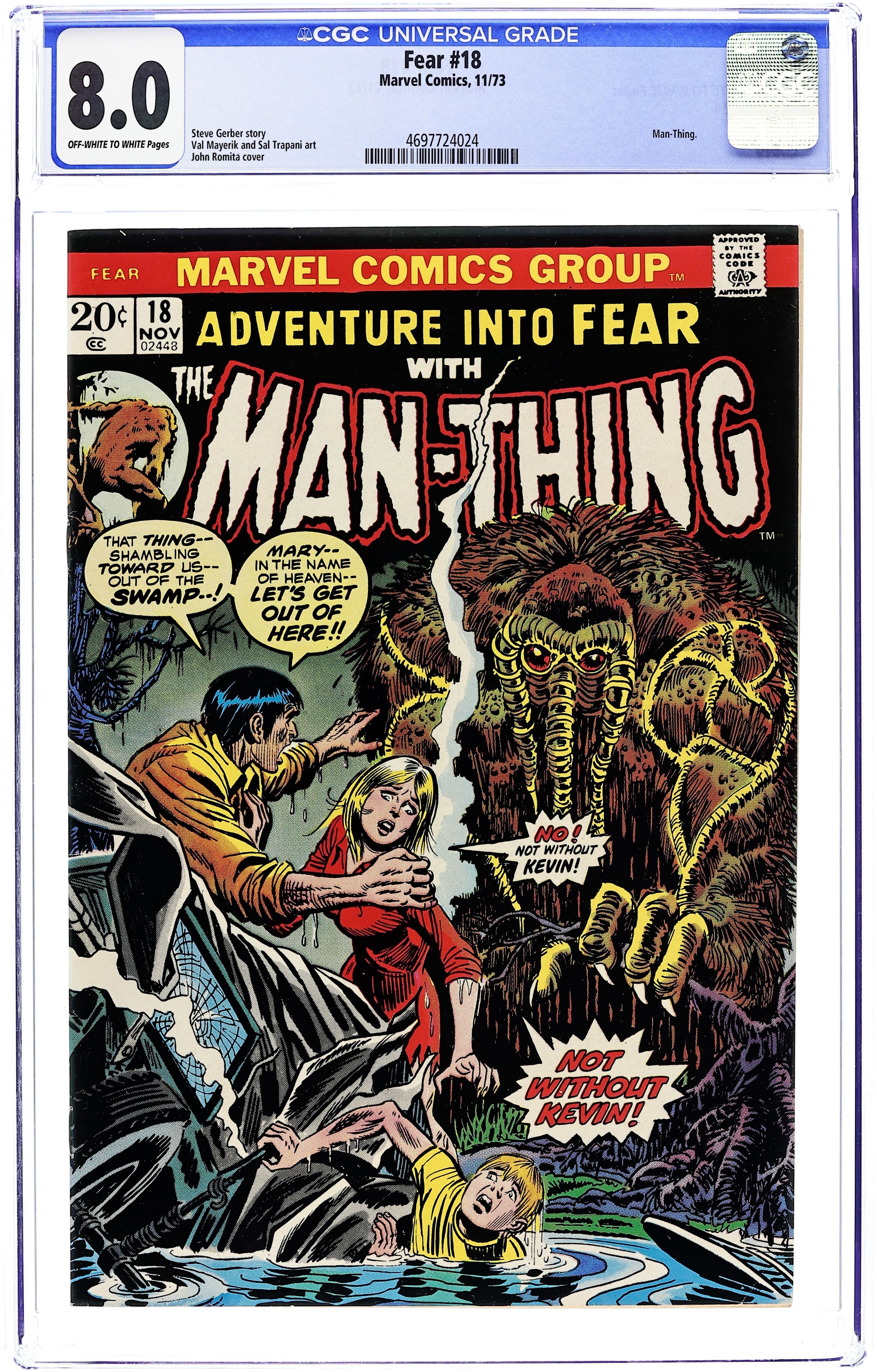Starts May 4 Cover art by John Romita. "A Question of Survival!", script by Steve Gerber, pencils by Val Mayerik, inks by Sal Trapani; Ralph Sorrell is on his way home after having a few too many drinks, causing him to get into a car crash with a passenger bus; Both vehicles crash into the nearby swamp; The entire accident is viewed by the Man-Thing, who silently watches the events unfold; Most people on the bus die, while Ralph survives; Among the few survivors from the bus are Mary Brown, soldier Jim Arsdale, student Holden Crane, and a young boy named Kevin Kennerman; When Kevin is pinned in the wreckage of the bus, Holden refuses to help; Holden claims being "against life," causing friction among the survivors; The Man-Thing arrives, lifts up the wreckage, and frees the boy to the shock and awe of the other survivors. 36 pgs., full color. Cover price $0.20.