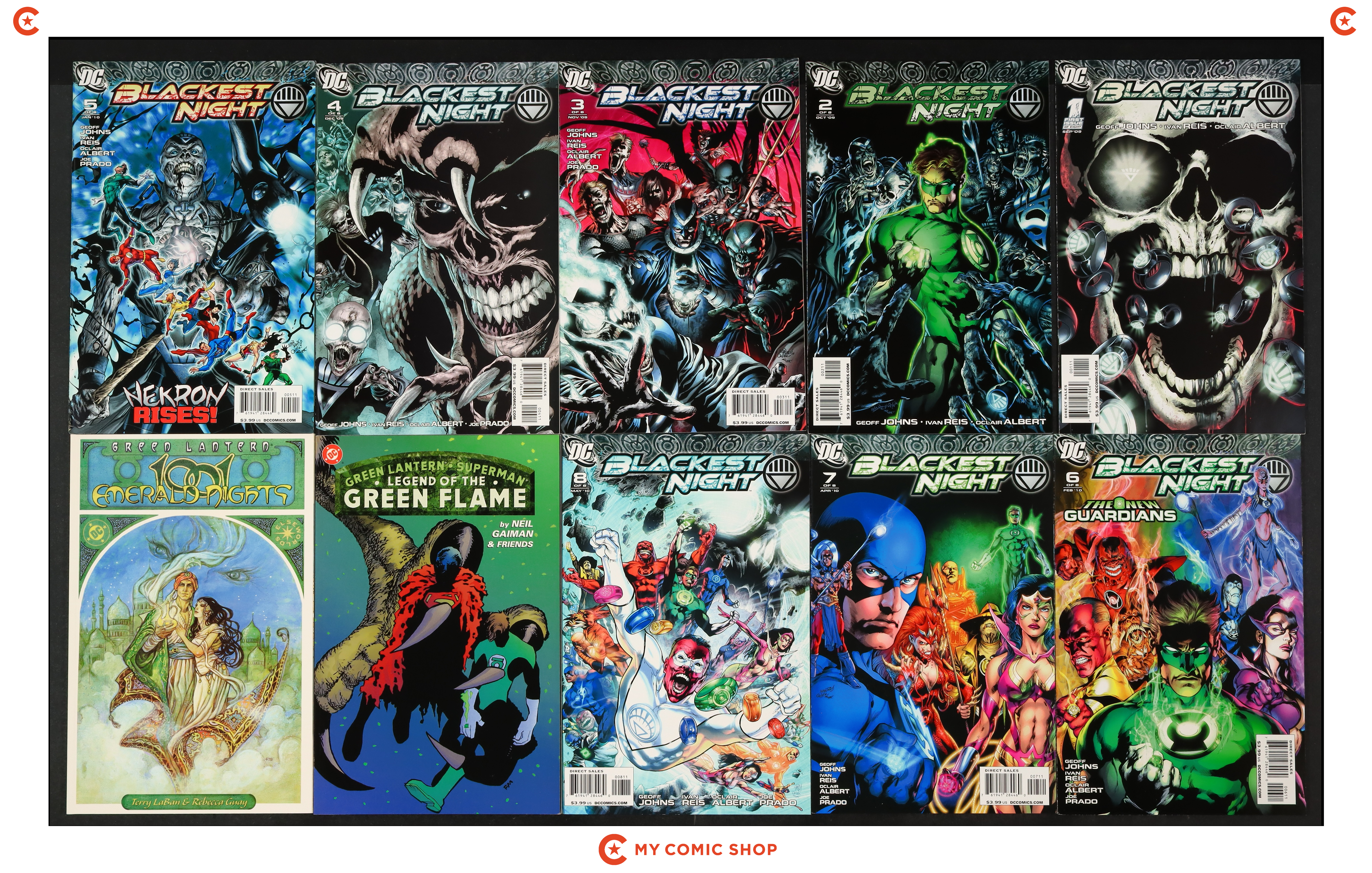 Issues 1A-8A of Blackest Night (2009); Green Lantern Superman Legend of the Green Flame (2000) 1; and Green Lantern 1001 Emerald Nights GN (2001 DC) 1-1ST. Most will grade in the VF to NM- range.