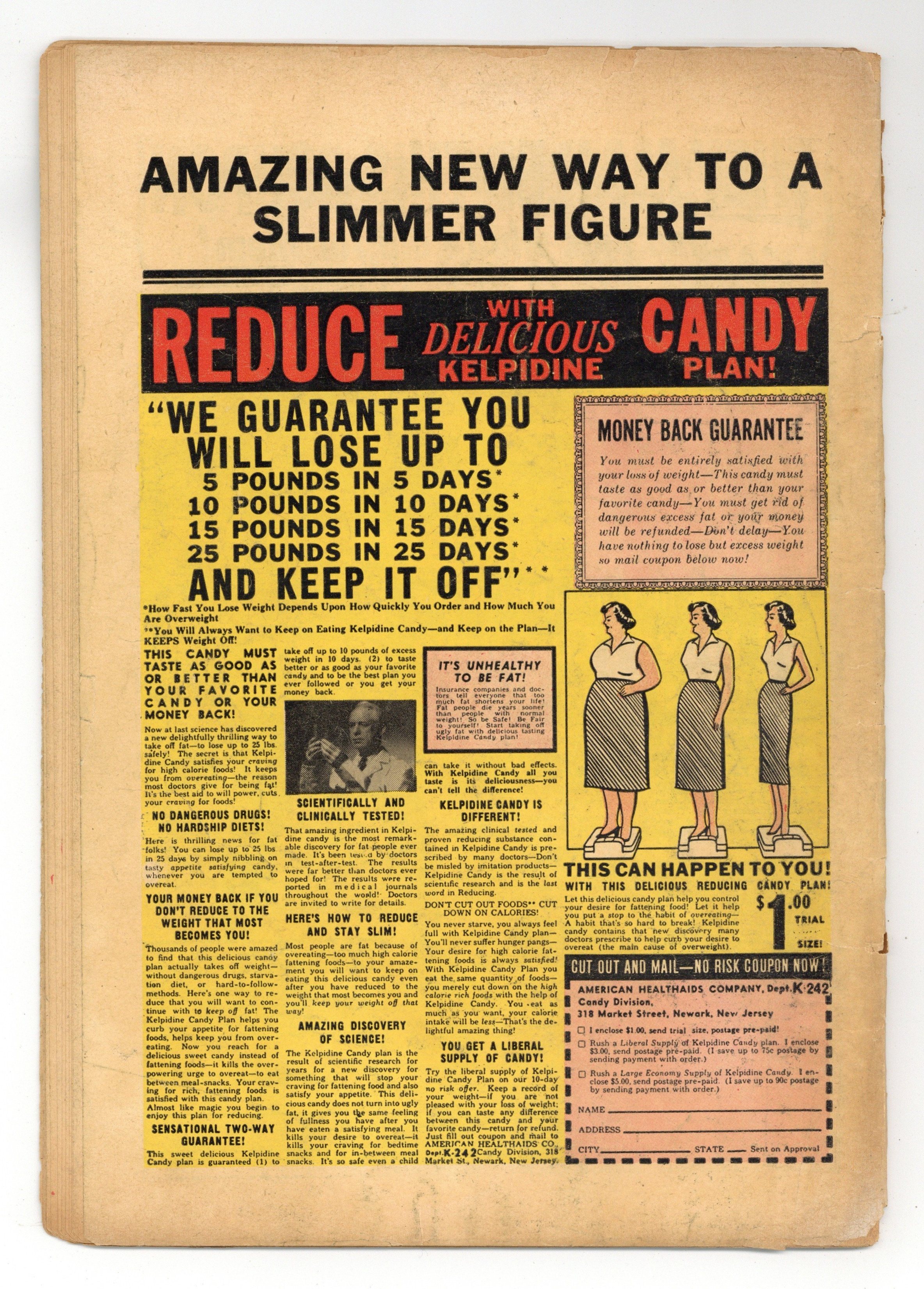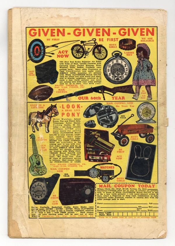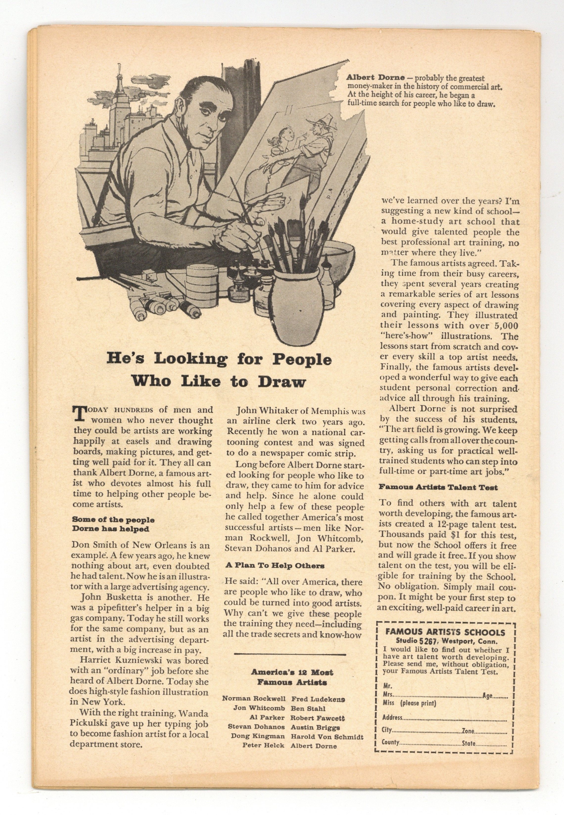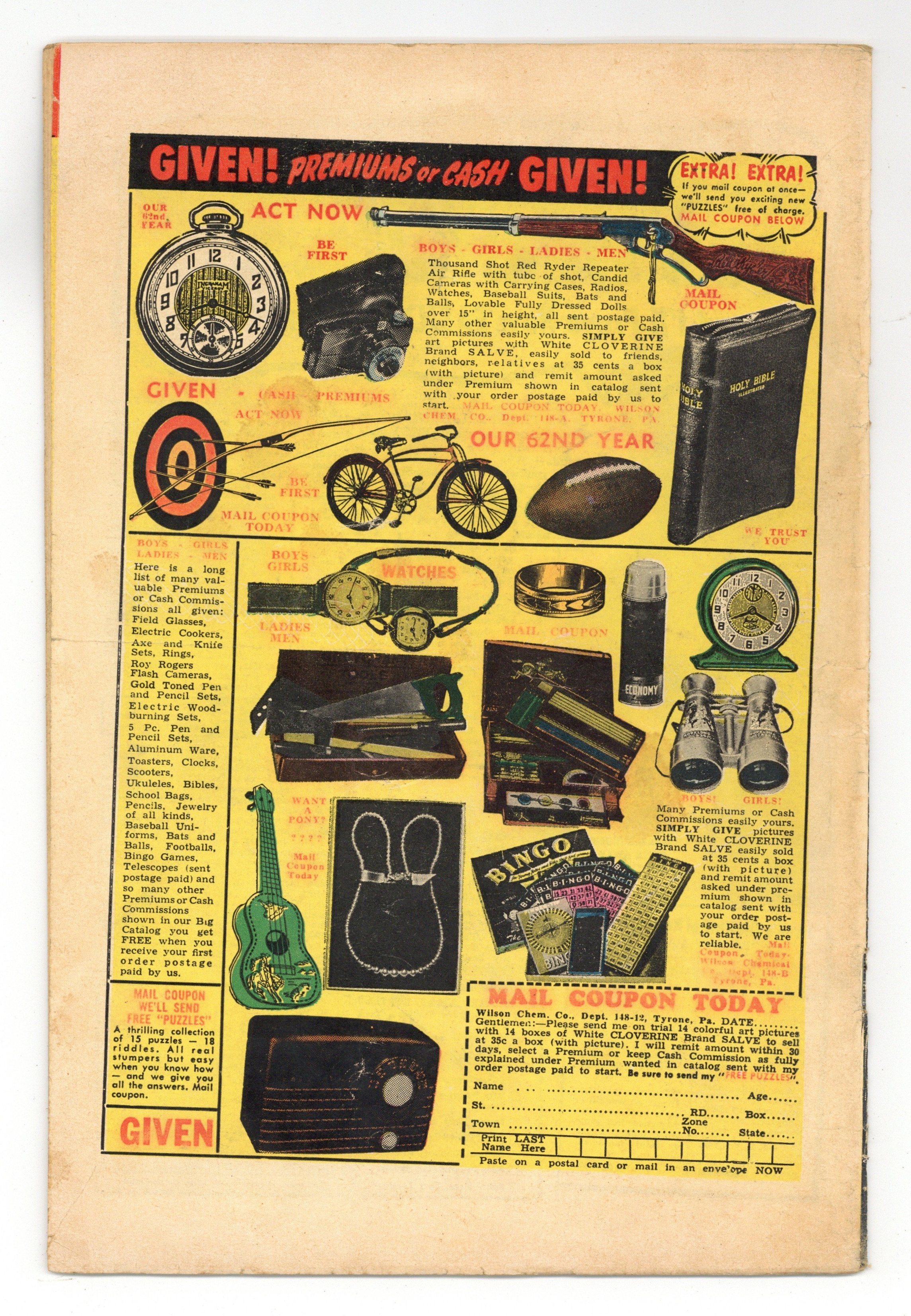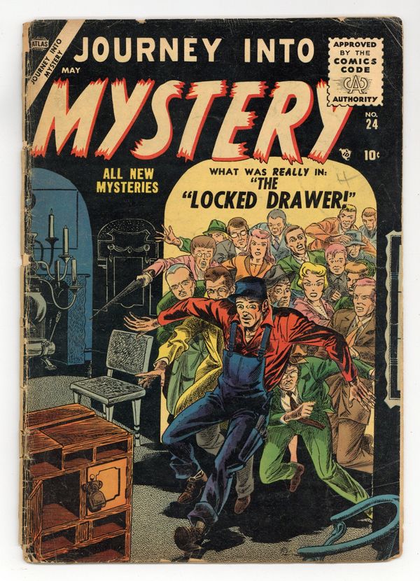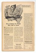 Starts Mar 9 Cover pencils by Sol Brodsky. "The Locked Drawer!", art by Bill Benulis; A couple buy a dresser that used to belong to a witch and the bottom drawer does not open; They are curious because of a story the furniture dealer told them about the witch keeping all of her secrets in the bottom drawer, and so they attempt to open it, without success. "High Pressure Man!", art by John Tartaglione; A desperate publicity man is trying to use gimmicks to garner attention, but with his new client, the schemes don't work out; First he tells the man to enter the lion cage at the zoo but the beasts appear uninterested so he enters to attempt a rescue, but he ends up needing to be rescued by his client from the animals; Second he tells the client to enter a burning building and he will enter to rescue him but he is overcome by smoke and the client has to carry him out. "The Stone Bird," art by Angelo Torres; A farmer is plagued by a gargoyle that nightly devours his chickens. "The Journey" text story, art by Carl Burgos. "The Long Night," pencils by Paul Reinman; A man believes that his relatives are just waiting for him to die so they can get his money and that he hates them; When he is under the impression he has died, he finds himself in an afterlife where he is stopped from boarding a beautiful boat taking people to the promised land. "The Eager Beaver!", art by Mort Lawrence; A man who always wants to be first in line for public events in order to photographed by the newspapers regrets when he signs up to be the first man launched to Mars. 36 pgs., full color. Cover price $0.10.