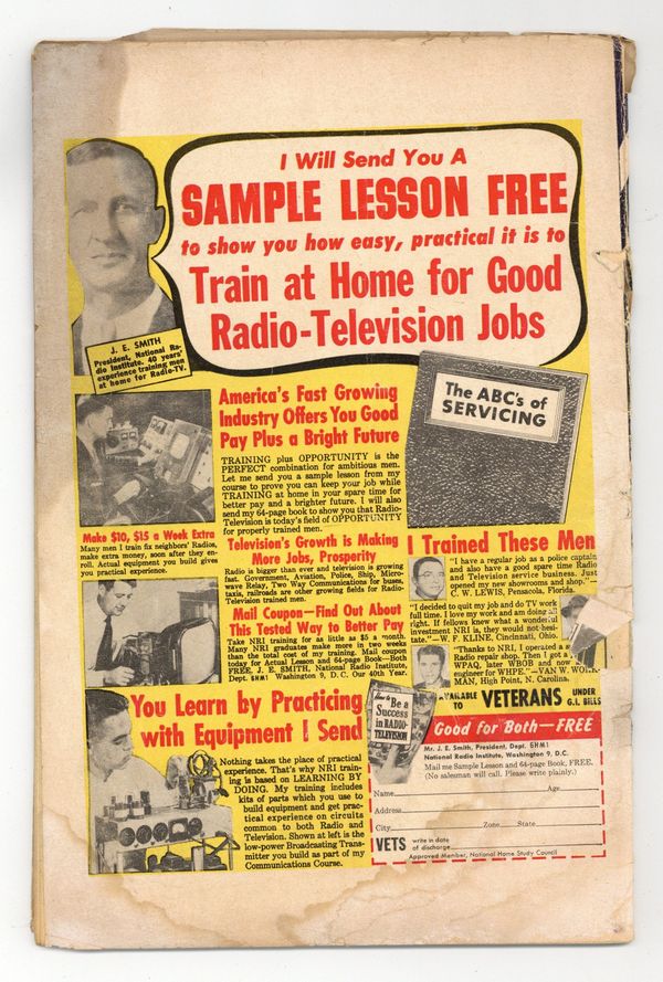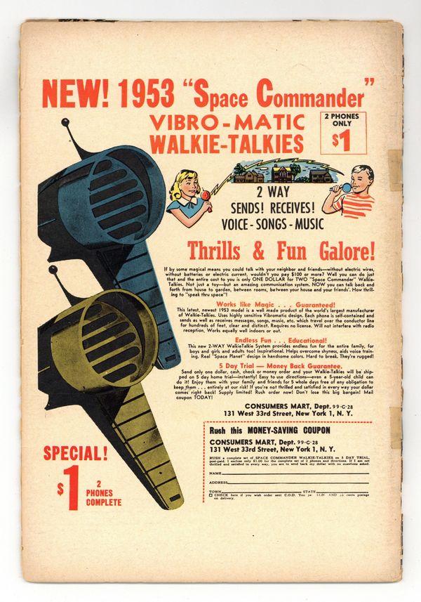 Starts Mar 2 Cover by Joe Maneely. "Mission On Earth," pencils by Art Peddy; A fantasy writer is visited by aliens who wish him to teach them human emotions so that they can observe humans undetected. "Strange Pursuit" text story. "Haunted House," pencils by Larry Woromay; A man takes a bet to spend the night in a haunted house and ends up the ghost which haunts the house. "The Man Who Watched," art by John Forte; An East German plots to murder his business partner and then get help from an Allied soldier stationed just across the border, but the soldier is actually a statue and does not respond to his plea. "The Blaster," script by Paul S. Newman, art by Seymour Moskowitz; Martian gun-runners arm select humans with advanced weaponry hoping that they will battle amongst themselves and leave them as easy pickings for an invasion force. "The Human Germ," art by Mort Lawrence. 36 pgs., full color. $0.10. Cover price $0.10.