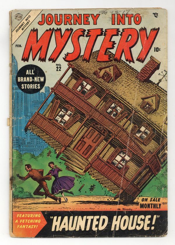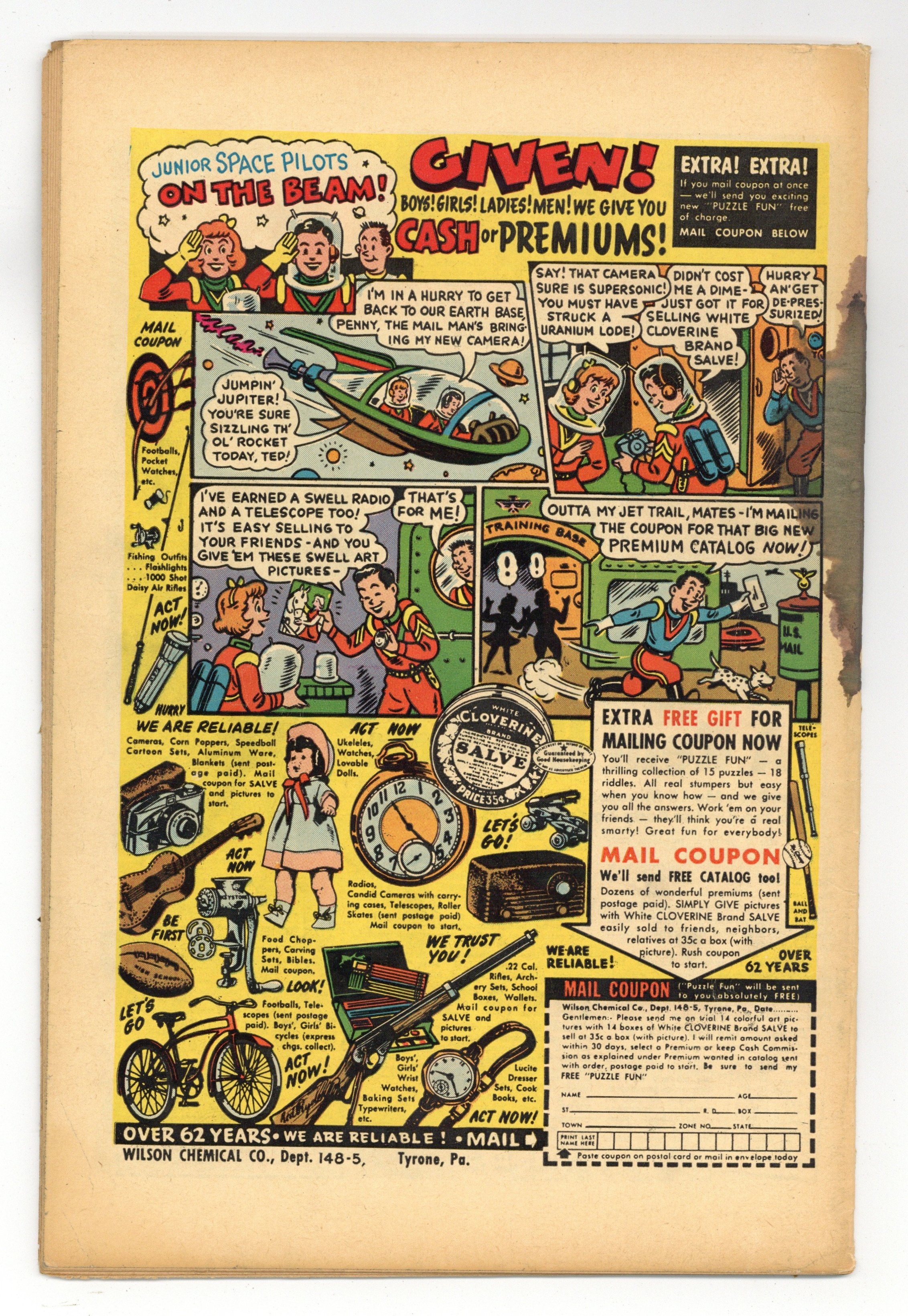 Starts Mar 9 Cover by Joe Maneely. "City of Giants," art by John Forte; A man invents a gas that makes people 30 feet tall; While everyone is giant-sized, he goes around looting the town. "The Doctor Wears a Mask," art by Alfonso Greene; Sociologists investigate a totally harmonious town, and find that the people were shamed into better behavior by their persecution of a stranger who turned out to be an alien with a mirror face. "The World-Destroyers!," art by Matt Fox; Aliens make the mistake of stealing an Egyptian solar ship from the museum when they need a boat to make last minute adjustments to a bomb set to detonate in the ocean. "The Little Green Man," art by Sol Brodsky; A jade Buddha begins to possess its owner until the man even begins to resemble the fat statue. His wife frees the man by smashing the statue. "Morgan's Mad Machine!," art by Ed Winiarski; Two swindlers get taken by a conman who tries to sell them a gold-making machine. "Sdrawkcab," art by John Tartaglione; An extraordiinary child excels at sports and school, but does it all backwards. "The Room With Two Billion Cards!," art by Sidney Check. 36 pgs., full color. $0.10. Cover price $0.10.