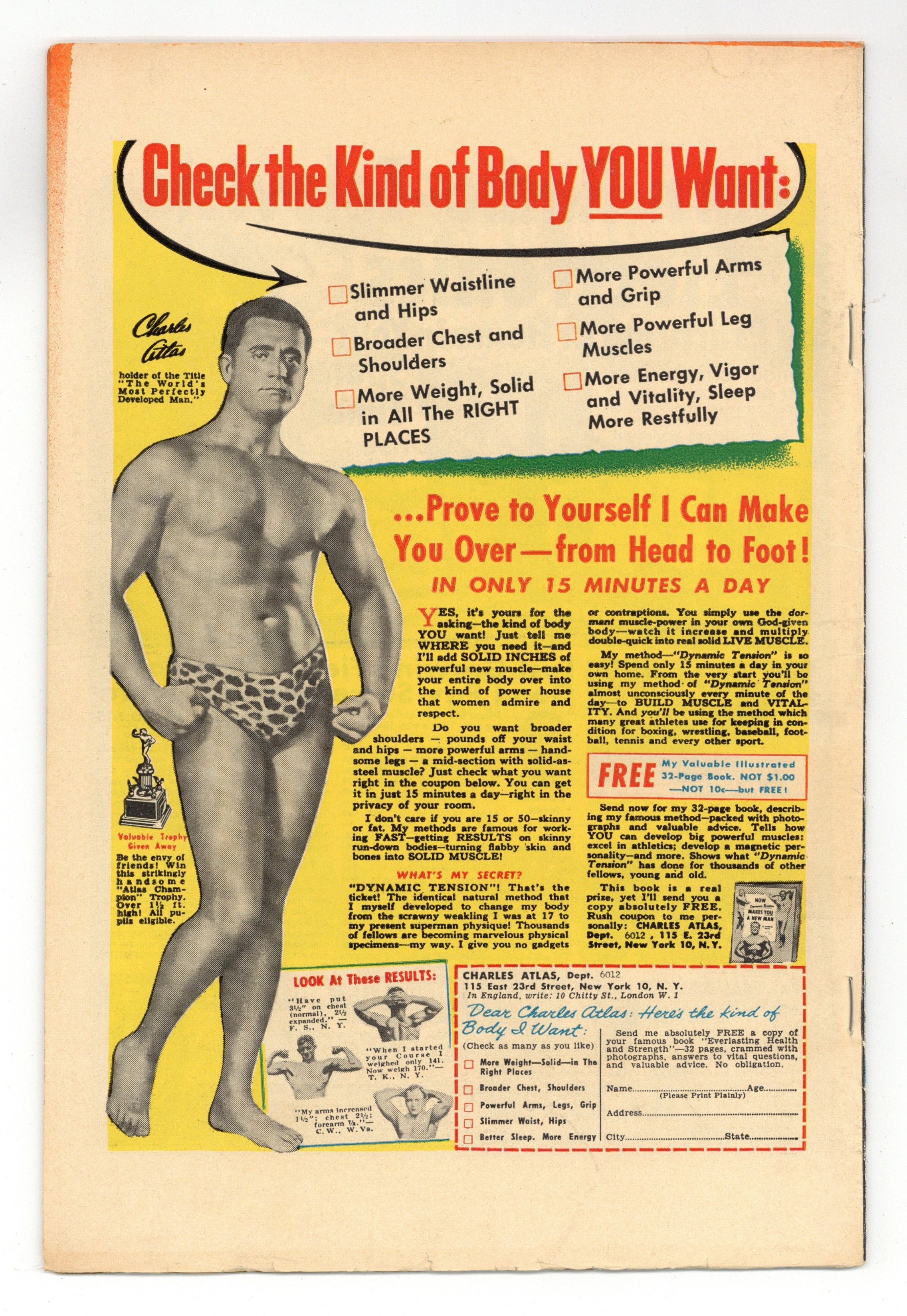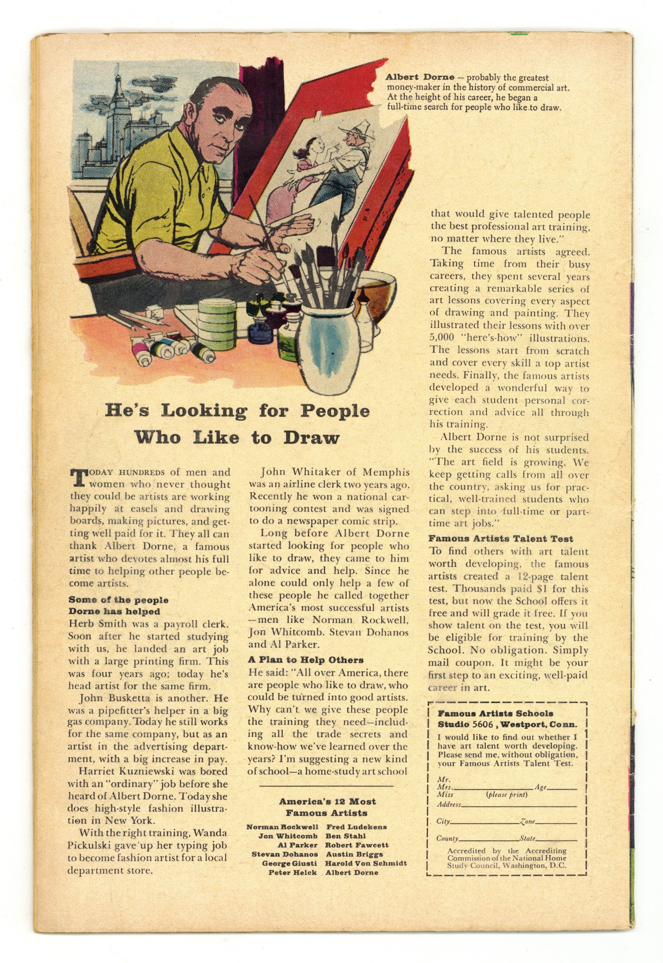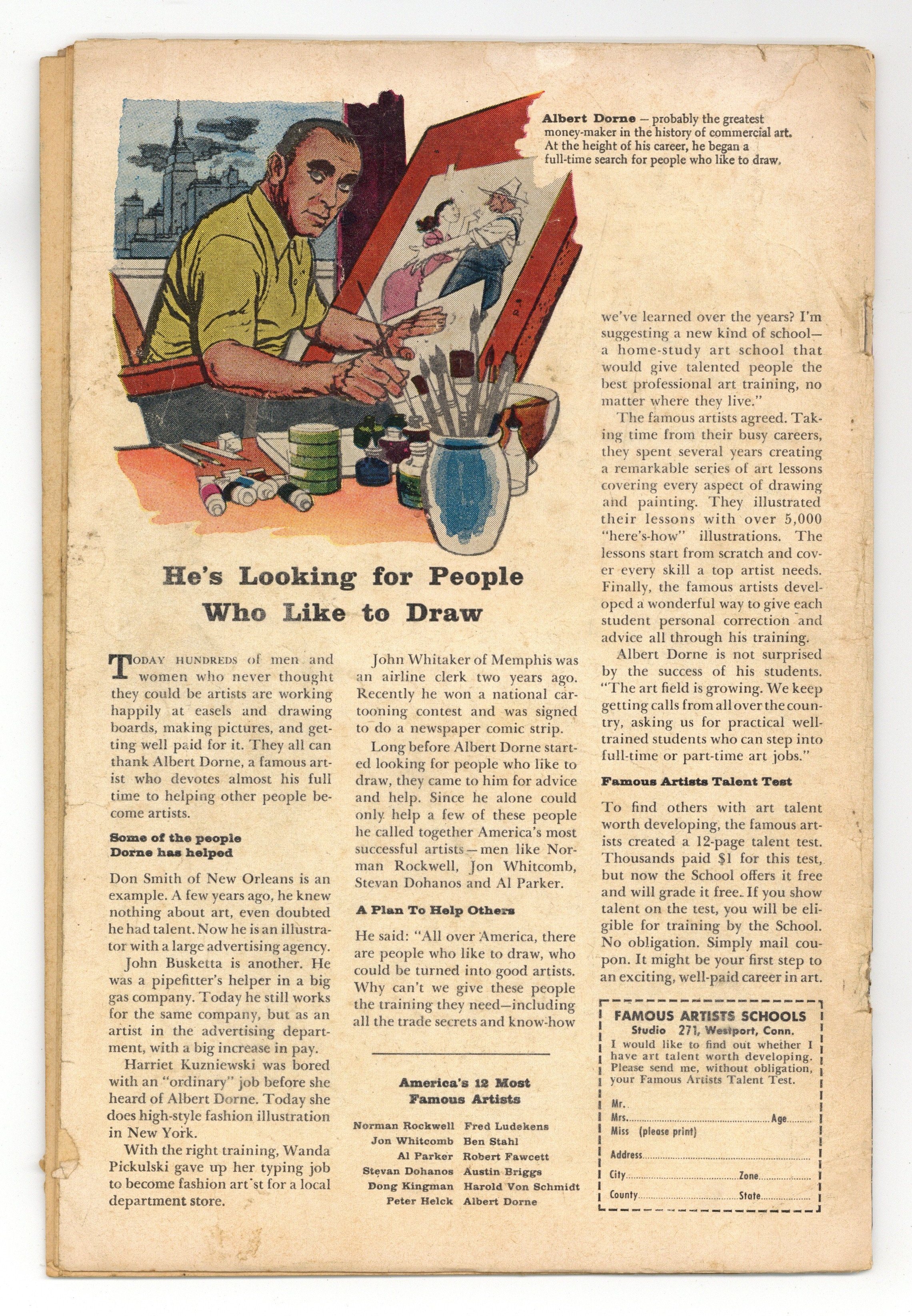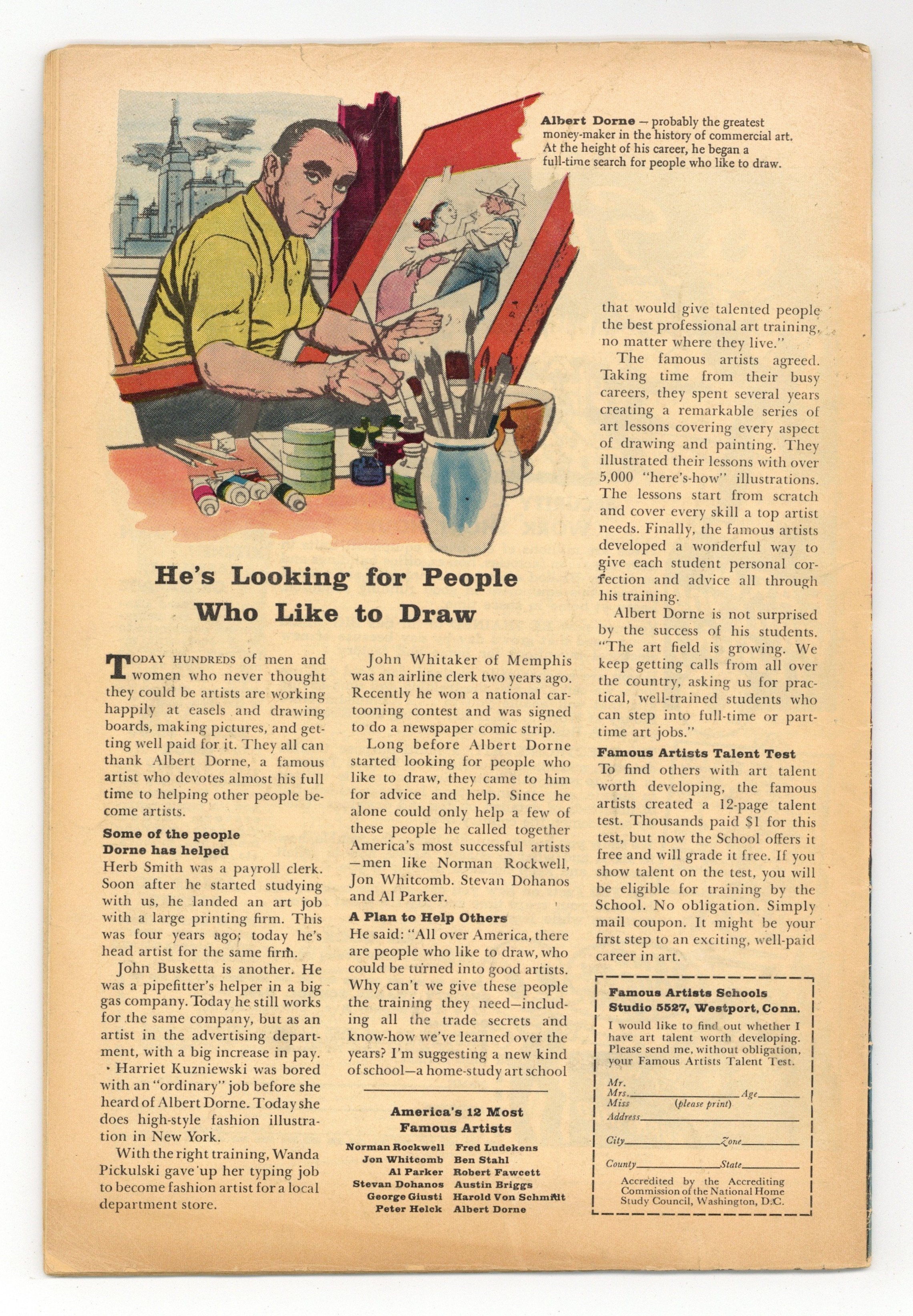 Starts Mar 9 Cover by Bill Everett. "The Menace of the Green Men," script by Carl Wessler, pencils by Al Williamson, inks by Ralph Mayo; Light images of aliens from space become the fall guy of a crook in a series of planned robberies. "While the City Sleeps," art by Doug Wildey; A midget who poses as a ventriloquist's doll in order to pull off heists has a chemist friend who works on suspended animation pills as a hobby. "The Strange Power of Henry Grey," art by Ed Winiarski; A man finds he has the power to project his spirit across distance; He uses this ability to do evil to people as he is a hateful person. "The Taboo," script by Carl Wessler, art by Tony DiPreta; When a sailor upstages a native witch doctor, the witch doctor maroons the sailor on a small island surrounded by sharks. "The Heat's On" text story, art by Gene Colan and Don Heck. "The Outcast," inks by Vince Colletta; A telepath who works for the police department is shunned by others because of his ability until he saves a trapped boy. "The Haunted Halls," art by Frank Bolle; When a man enters a castle, he becomes the resident ghost. 36 pgs., full color. $0.10. Cover price $0.10.