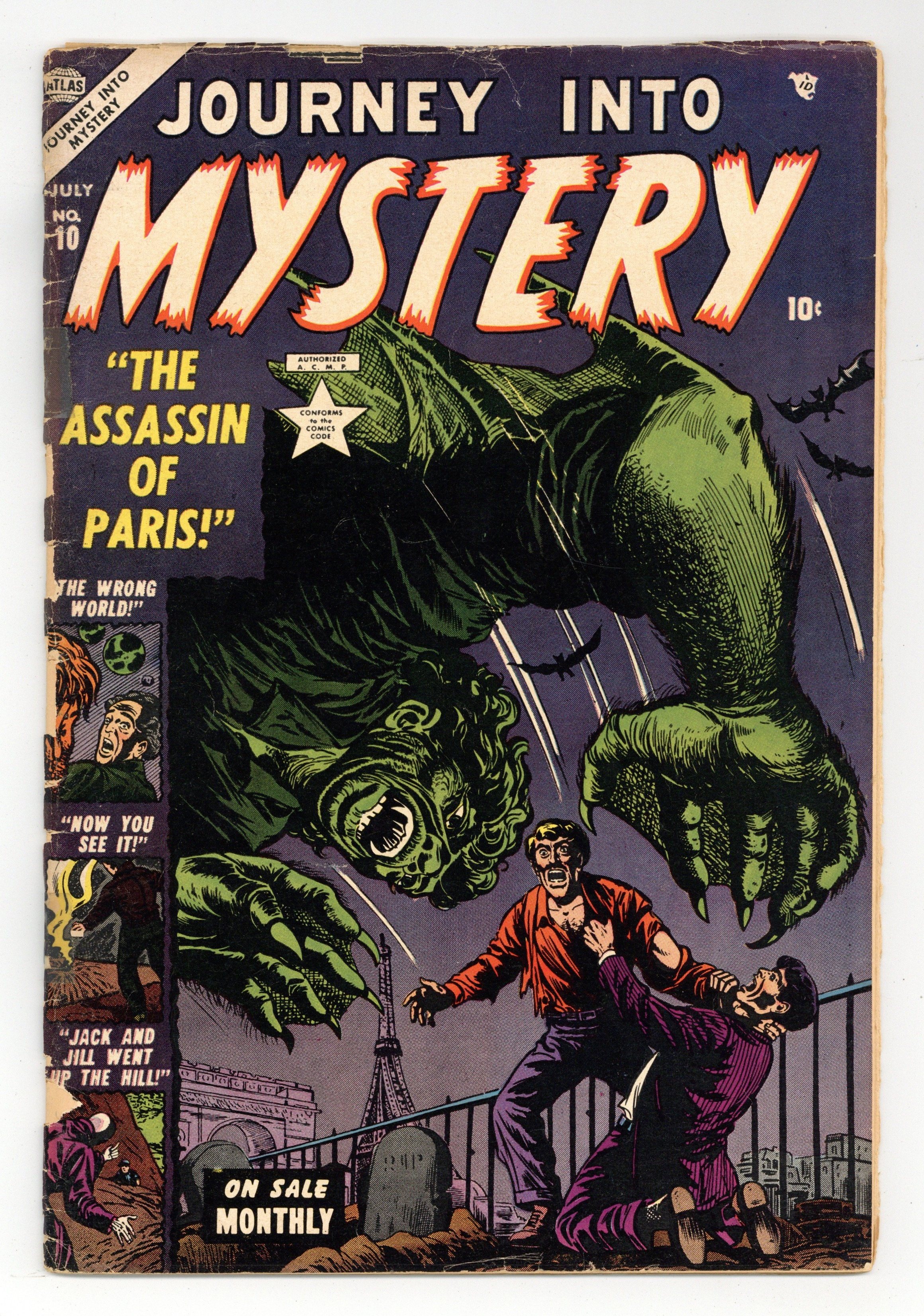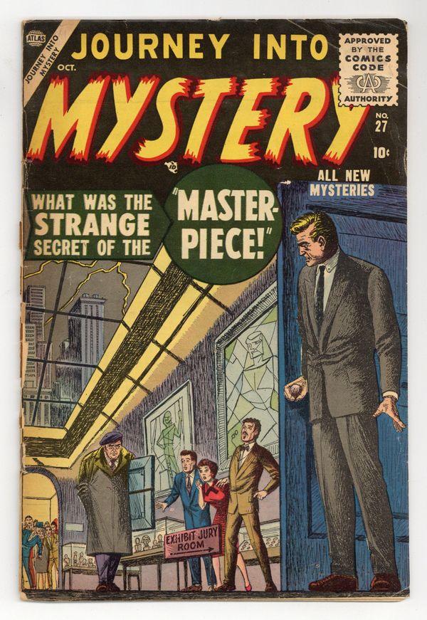 Starts Mar 9 Cover pencils by Jack Kirby. "The Glob," pencils by Jack Kirby, inks by George Klein; A painter is hired to cover a statue with strange paint; The statue comes to life at midnight and goes on a rampage. "The Sorcerer" text story, art by Joe Maneely. "The Patient in Room 3D," art by Paul Reinman; Doctors perform an operation to increase brain power, hoping to find an answer to the world's problems, but the patient is still not intelligent enough to solve them. "Will This Be the End of the World?," art by Steve Ditko; A baseball player's mitt is infested with tiny humans with enough rockets to evacuate their entire world as they see the baseball hurling towards them. 36 pgs., full color. $0.10. Cover price $0.10.