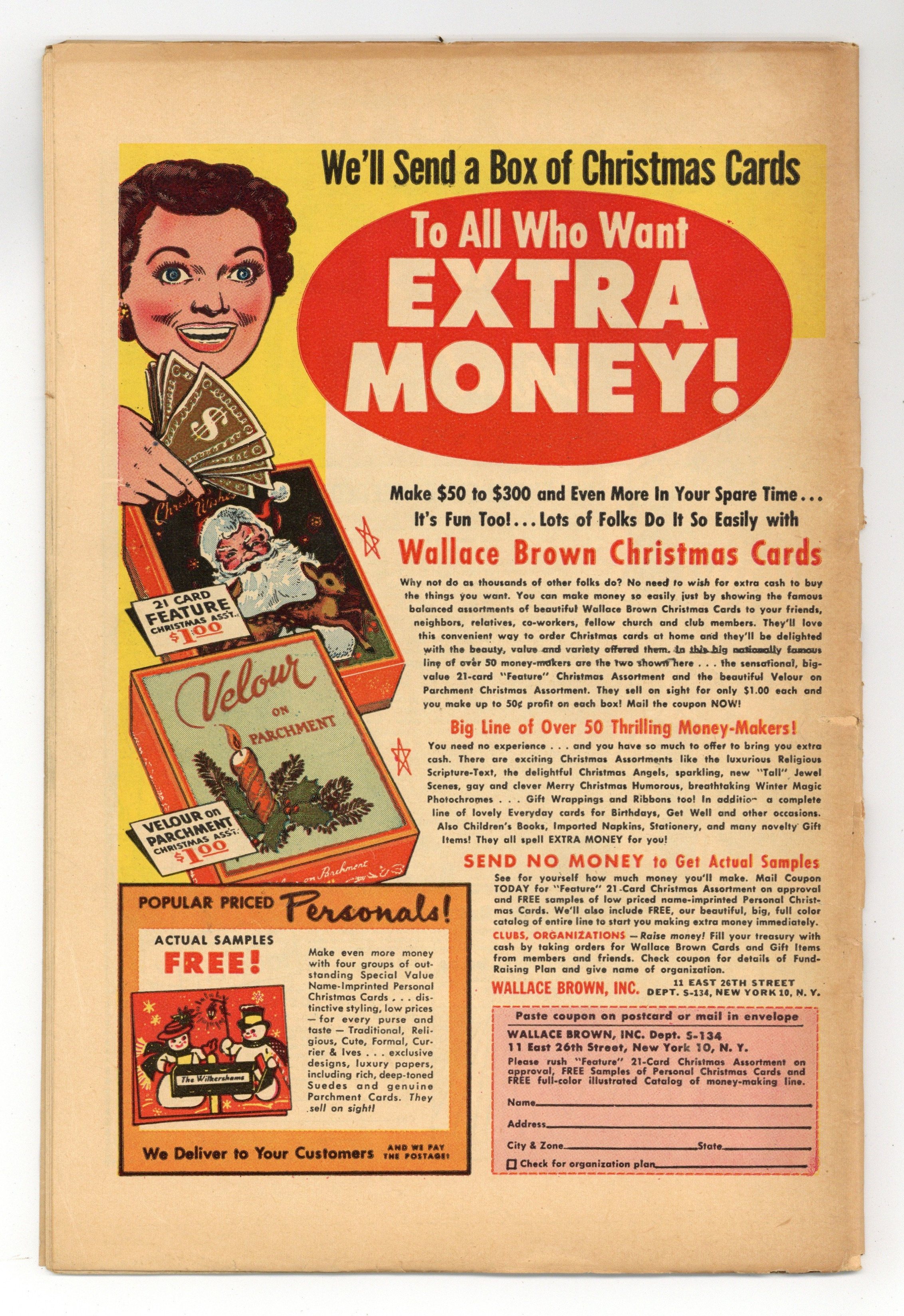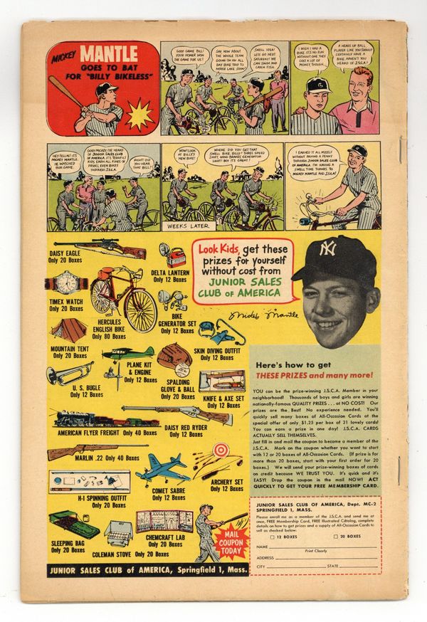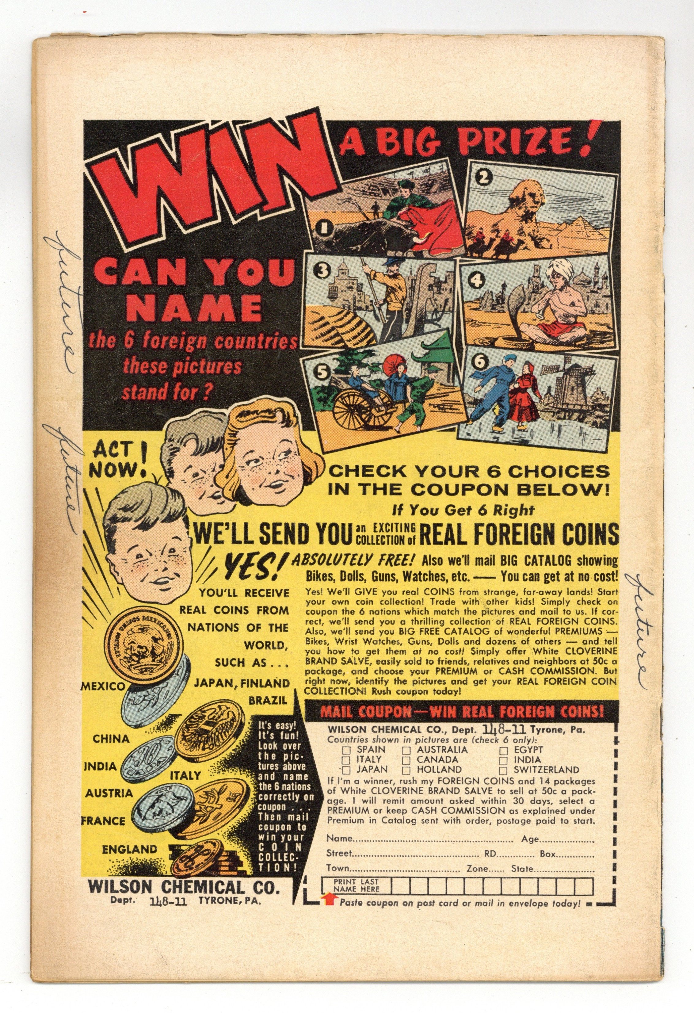 Starts Mar 9 Cover by Bill Everett. "The Deep Freeze," script by Carl Wessler, art by Don Heck; Three crooks place themselves in suspended animation for 200 years after stealing 150,000 dollars. "Volcano!," script by Carl Wessler, art by Jimmy Infantino; A man introduces technology to a primitive people living at the base of a volcano and the volcano becomes angry at their new competitive and mistrustful nature so wipes out their society. "Inside the Whirlpool," art by Ed Winiarski. "The Voice In the Night," art by Robert Q. Sale; When a man slugs an elderly man collecting donations for the poor and steals the poor box, his conscience bothers him so much that he hears a clock accuse him of being a thief. "The Old Shop" text story. "The Sea Serpent!," art by John Fort; A sailor sees a sea serpent arise when there is a disaster to be averted. "The First Man," pencils by George Roussos, inks by John Giunta; The author of this story postulates that a series of satellites will be required to use as refueling stations on the way to the moon. 36 pgs., full color. $0.10. Cover price $0.10.