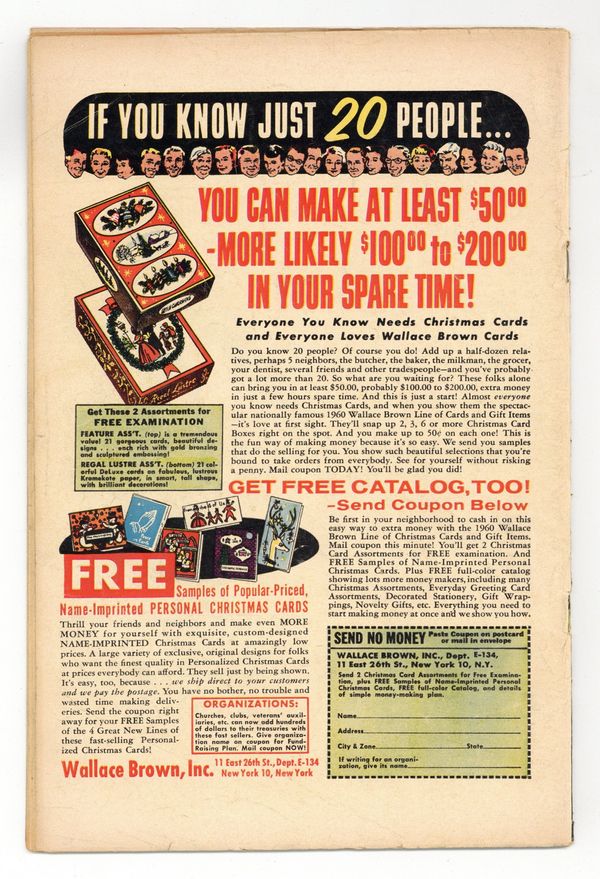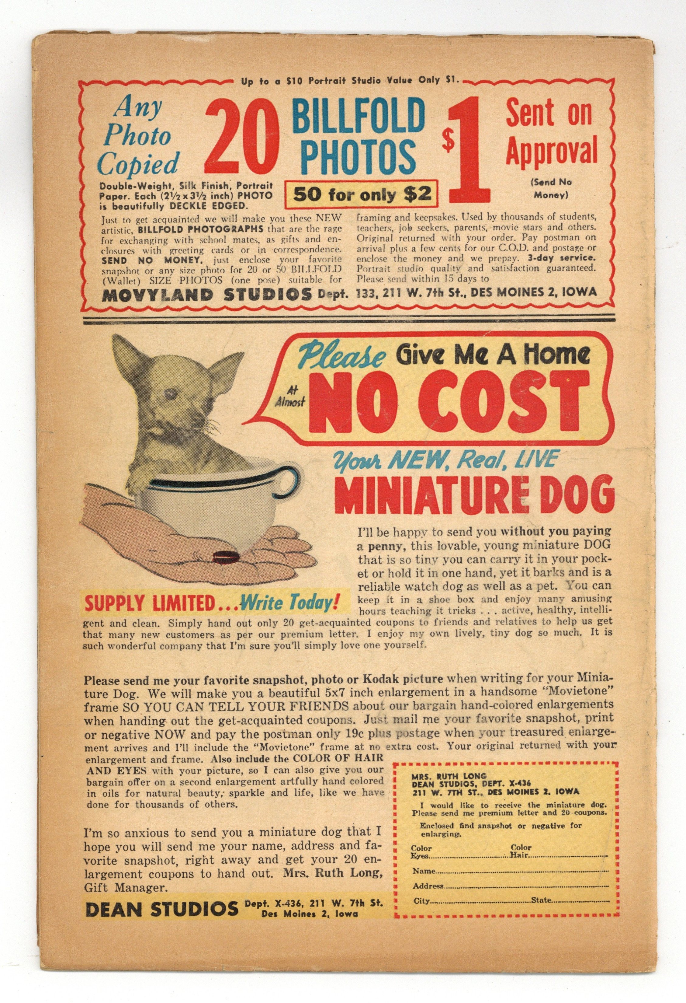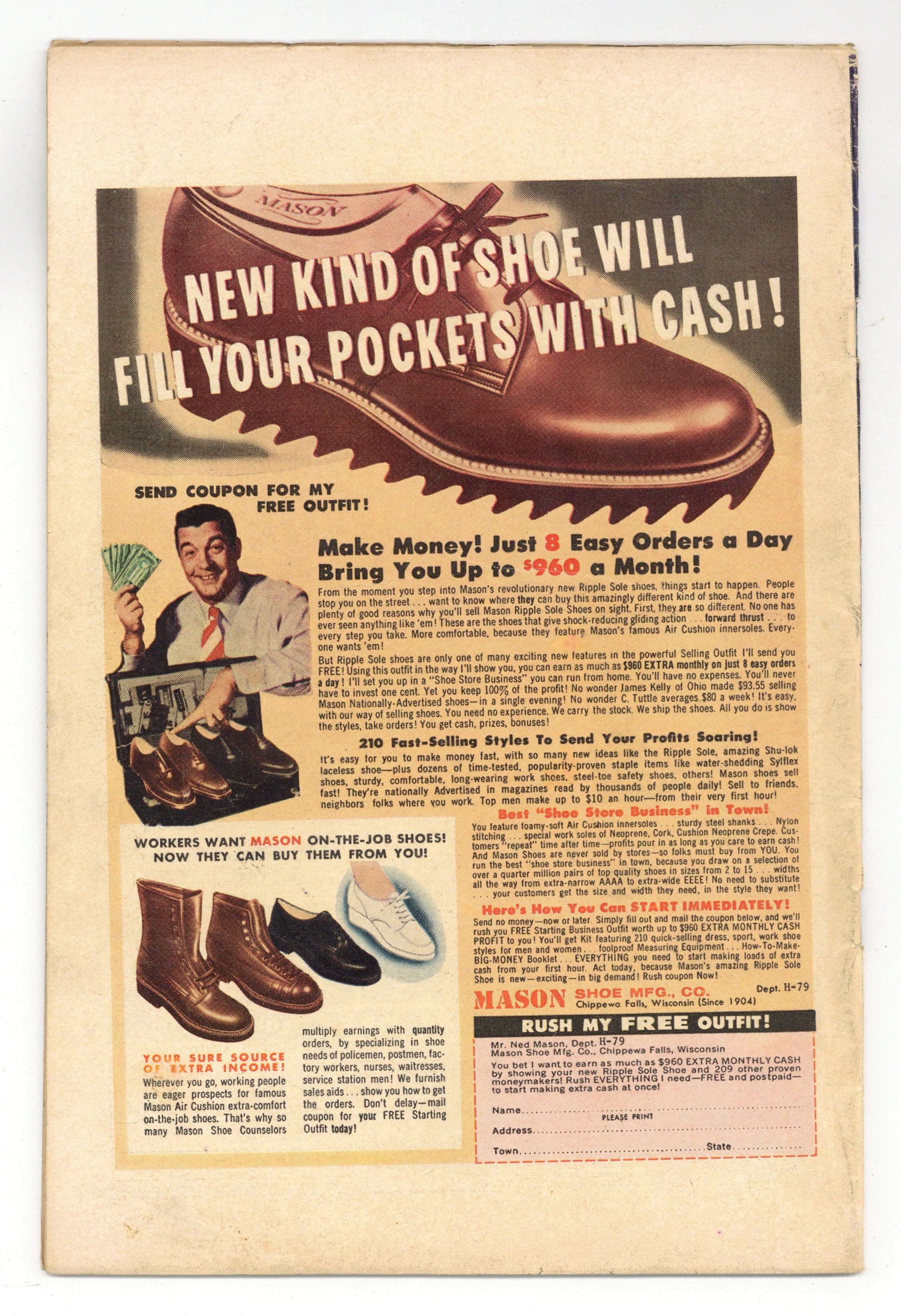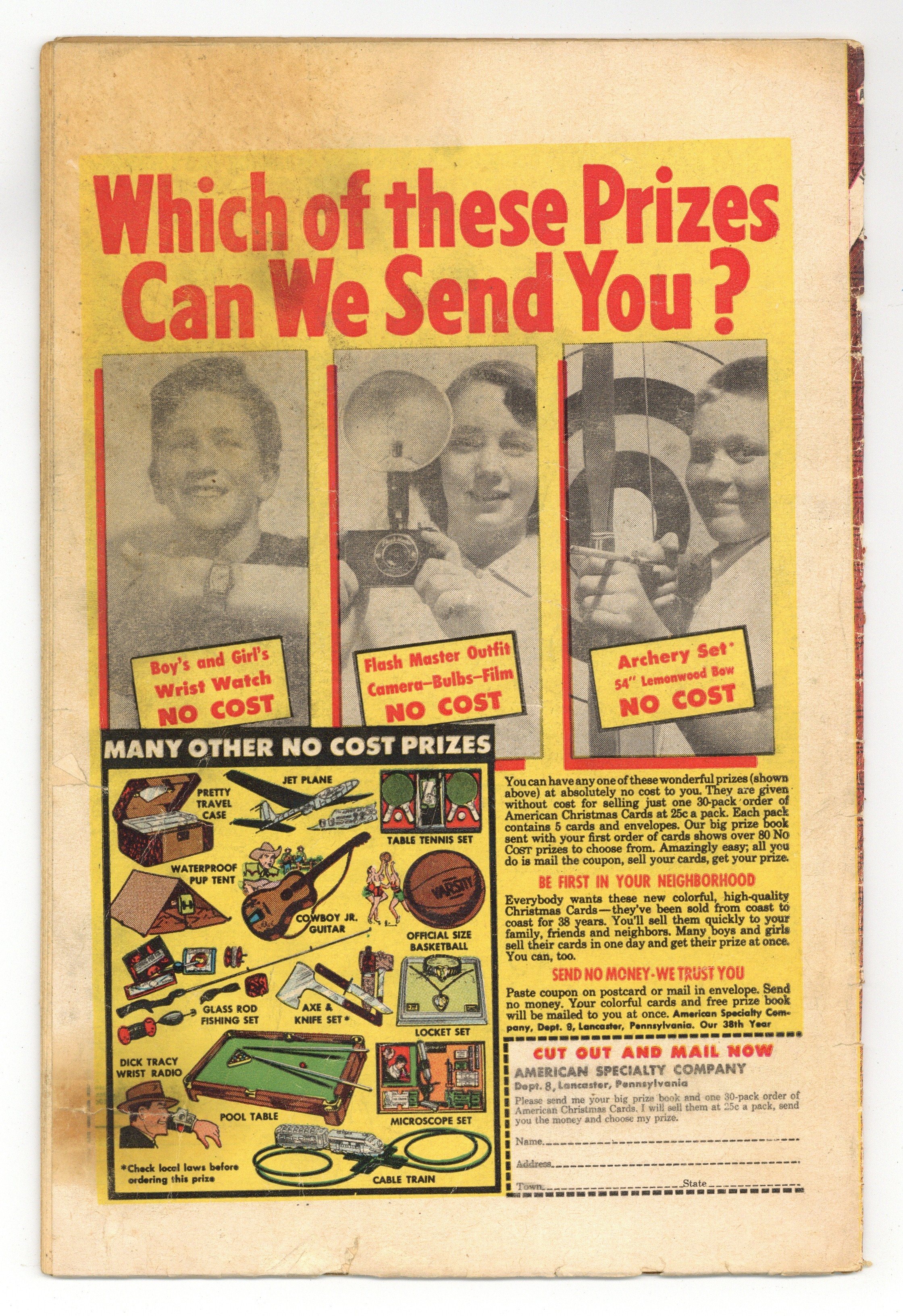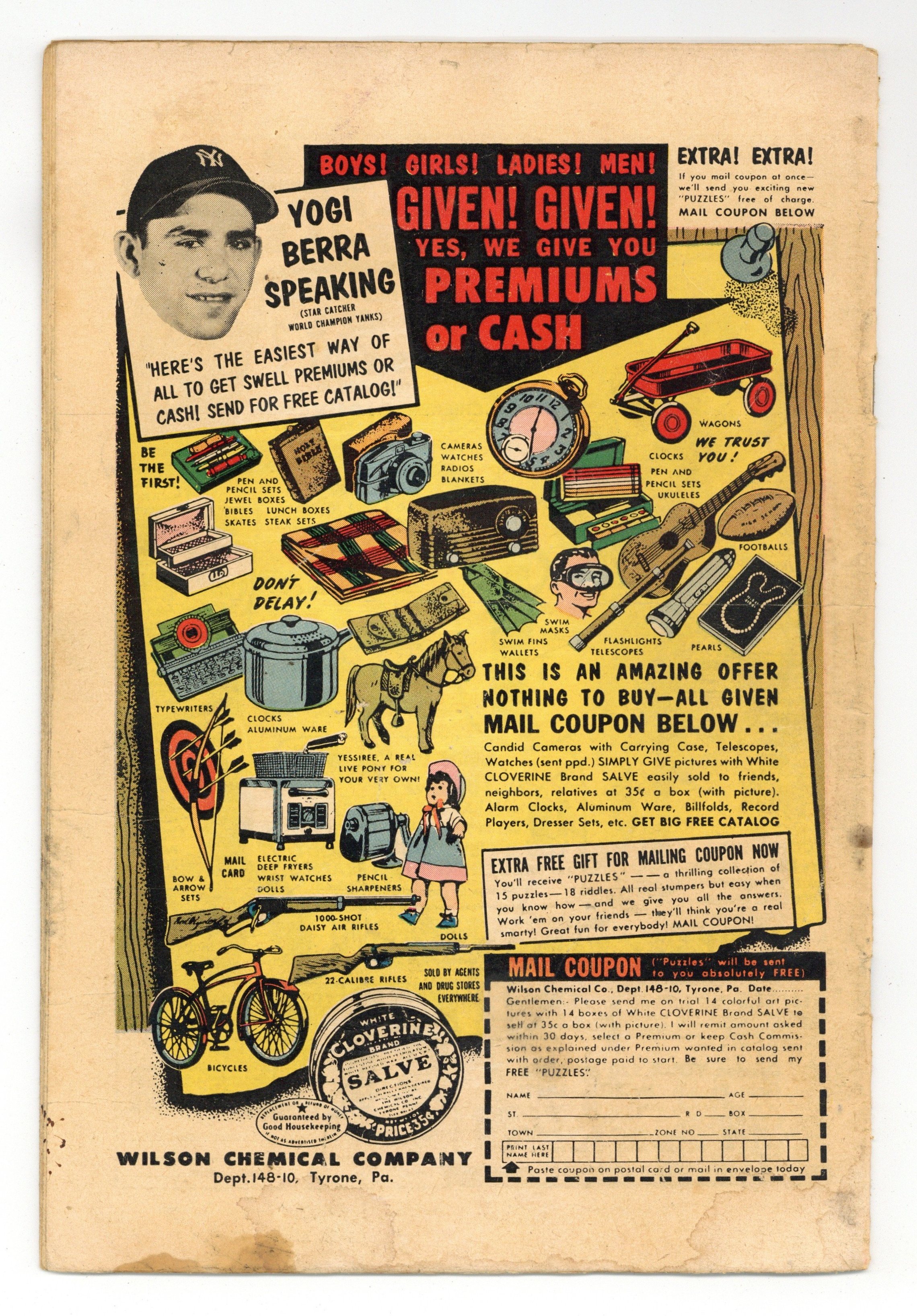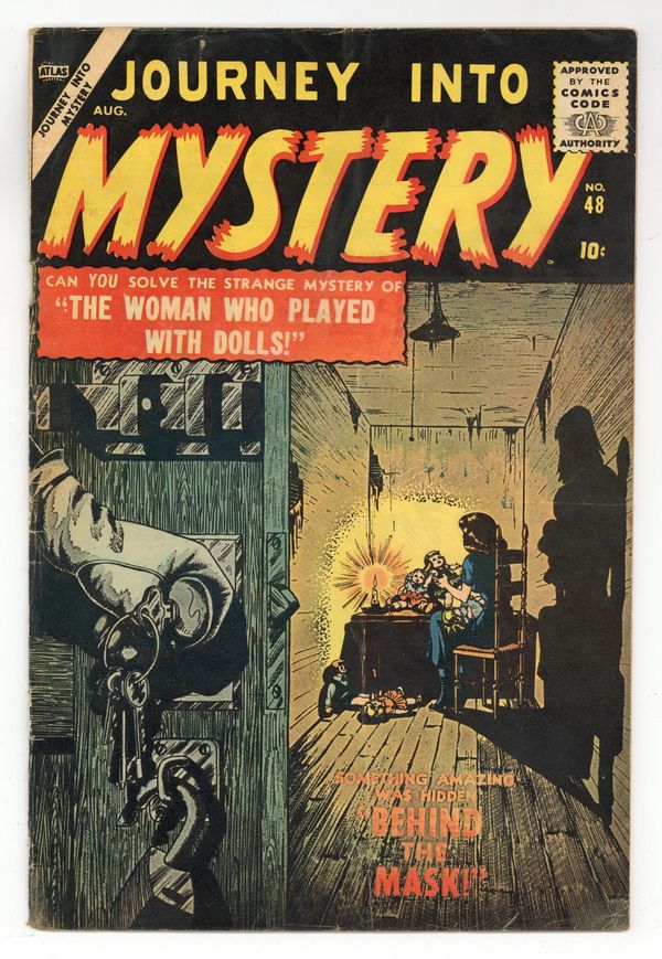 Starts Mar 9 Cover by Bill Everett. "Where There's Smoke…," art by Sam Kweskin; A smoker finds a blend of tobacco that makes his dreams come true, but his wife sells some to a customer who has a nightmare about the tobacco seller being lost in the darkest depths of Africa. "The Woman Who Played with Dolls," script by Carl Wessler, art by Richard Doxsee; A wealthy woman shrinks people who try to rob her and plays with them in a doll house. "The Phony!," art by Marvin Stein; A man who invents fake tales for profit runs into a real adventure that he can't tell because everyone thinks of him as a phony. "Behind the Mask!," script by Carl Wessler, art by Jay Scott Pike; A man in his sixties pays a doctor ten thousand dollars for a mask that will allow him to look younger in order to court a woman in her twenties, but the end of the story reveals that she is also an older person who has paid for such a mask. "The New Pupil" text story, art by Joe Maneely. "Don't Turn Around!," script by Carl Wessler, art by Bill Everett; A man thinks that his invention to bring forth people from the past is a failure, but it actually worked to scare away two crooks who were intent on robbing him while he was knocked out. "The Curiosity of Mr. Catt!," pencils by Angelo Torres. 36 pgs., full color. $0.10. Cover price $0.10.