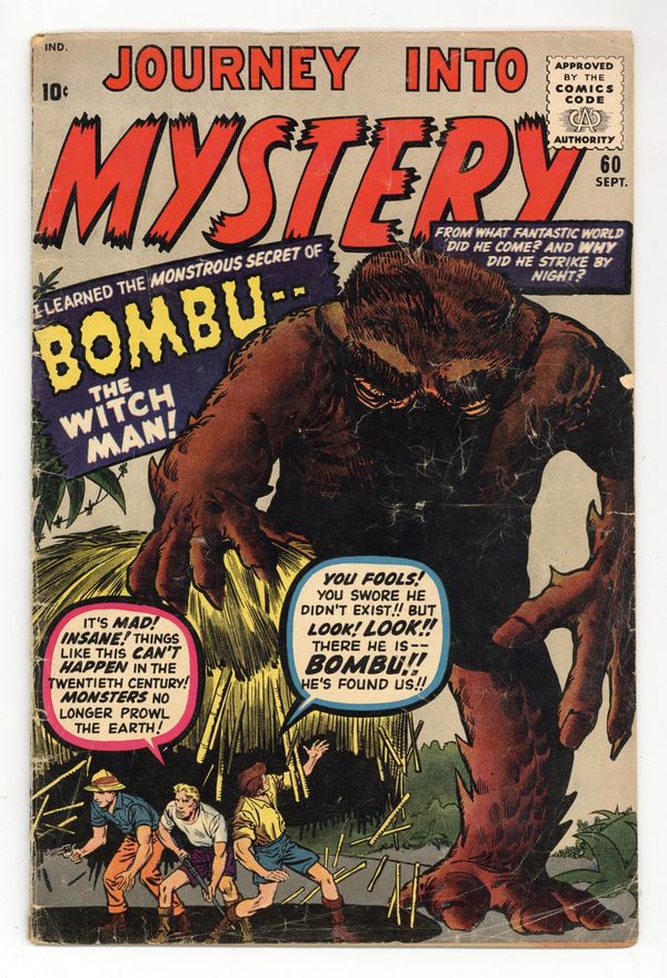 Starts Mar 9 Cover pencils by Jack Kirby, inks by Steve Ditko. "I Learned the Monstrous Secret of Bombu!," pencils by Jack Kirby, inks by Dick Ayers; Explorers meet a witch doctor named Bombu, who seems to possess real power. "We Were Trapped with the Silent Monster!," art by Don Heck; Against expert opinion, an engineer digs a mine to the center of the Earth and finds dragons. "I Found the Things from Nowhere," pencils by Jack Kirby, inks by Steve Ditko; A man messes with his TV and it picks up a battle between alien-looking creatures. "I Turned into a...Martian!," art by Steve Ditko; A man is telepathically controlled by a hostile Martian who returns to Earth with him. 36 pgs., full color. $0.10. Cover price $0.10.