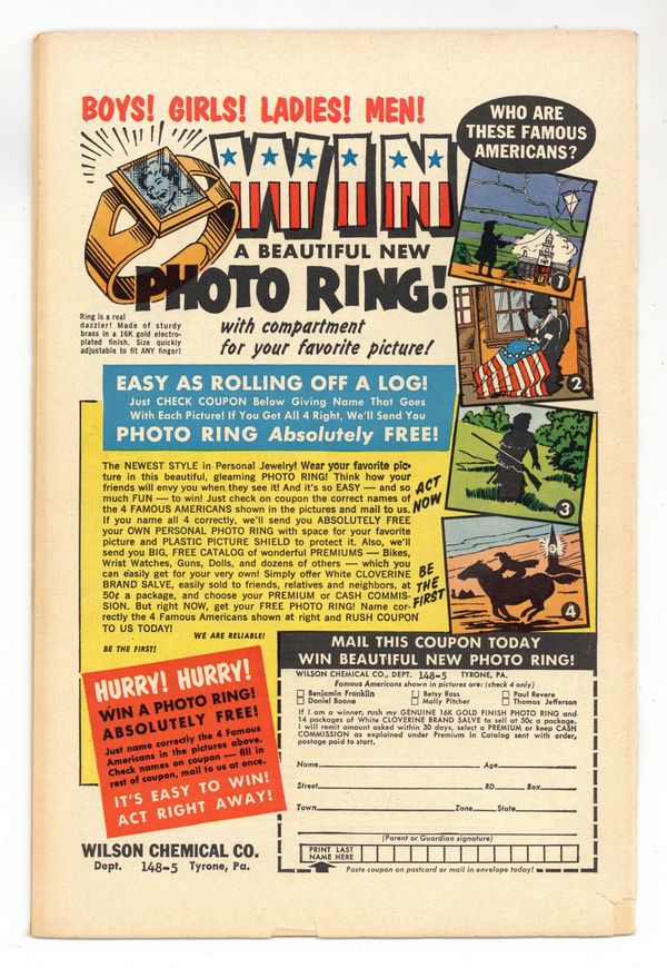 Starts Mar 9 Cover by Bill Everett. "I Saw a Demon!," art by John Giunta; A scientist invents a machine to record sound waves onto solid objects such as rocks and tests the playback on a rock taken from an old temple where the black arts were practiced. "The Silence!," art by Gene Colan; In the year 2076 the first flight to Mars finds that Martians have built a replica of a small town as a welcome. "How Harry Escaped," art by Ed Winiarski. "The Experiment" text story. "The Strange Secret of Henry Hill!," art by Bill Draut; A man jealous of the success of another man learns of an experiment that brought a child from another dimension to live on Earth. "The Victim!," art by Vic Carrabotta; A confidence man becomes the kidnap victim of an alien from Pluto who needs to demonstrate to his people that his transference device works. "The Question That Can't Be Answered!," art by John Forte; A reporter thinks reincarnation a scam and so he plans to expose a hypnotist who has prepared a hoax with his wife to channel a spirit through time. 36 pgs., full color. $0.10. Cover price $0.10.