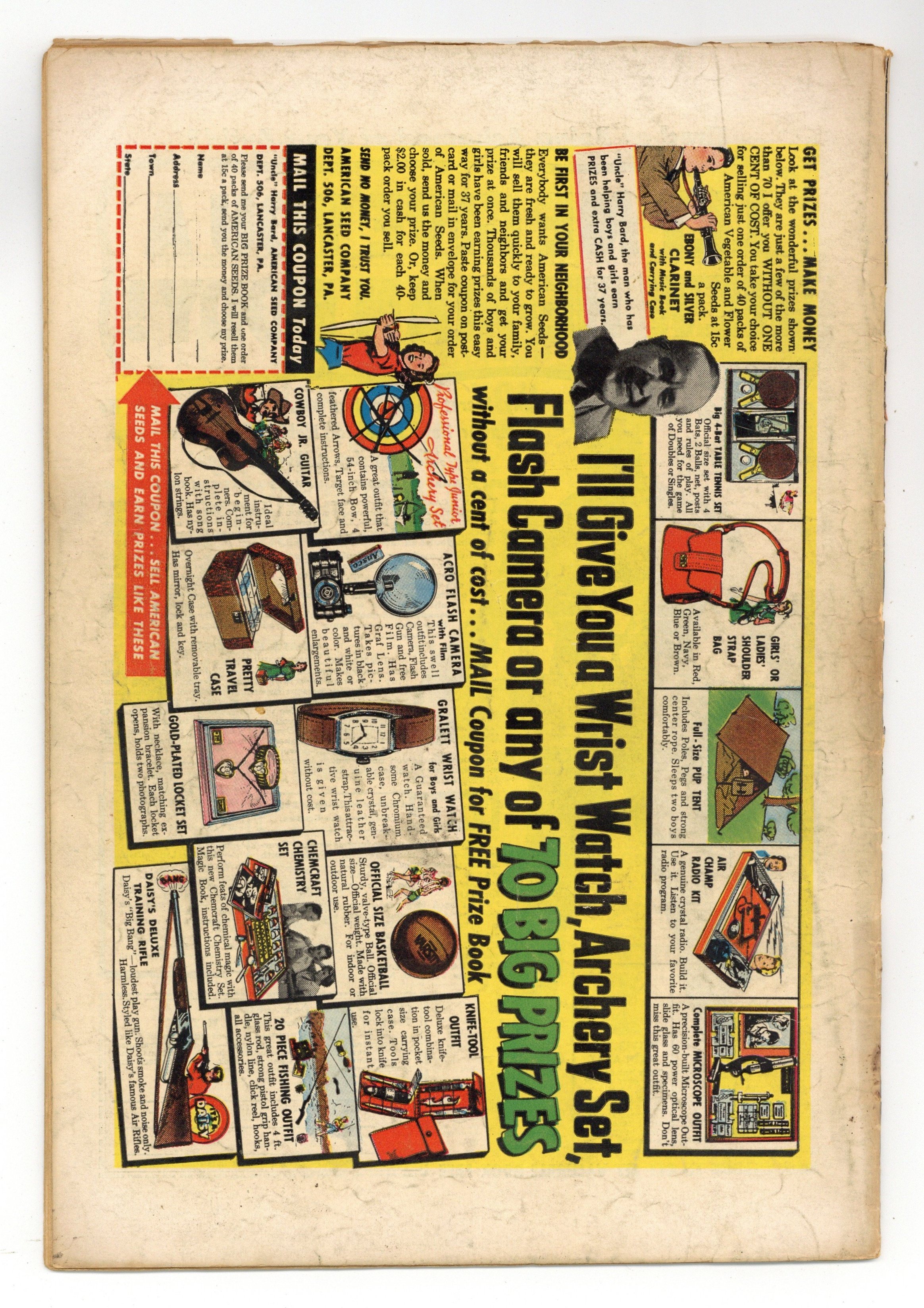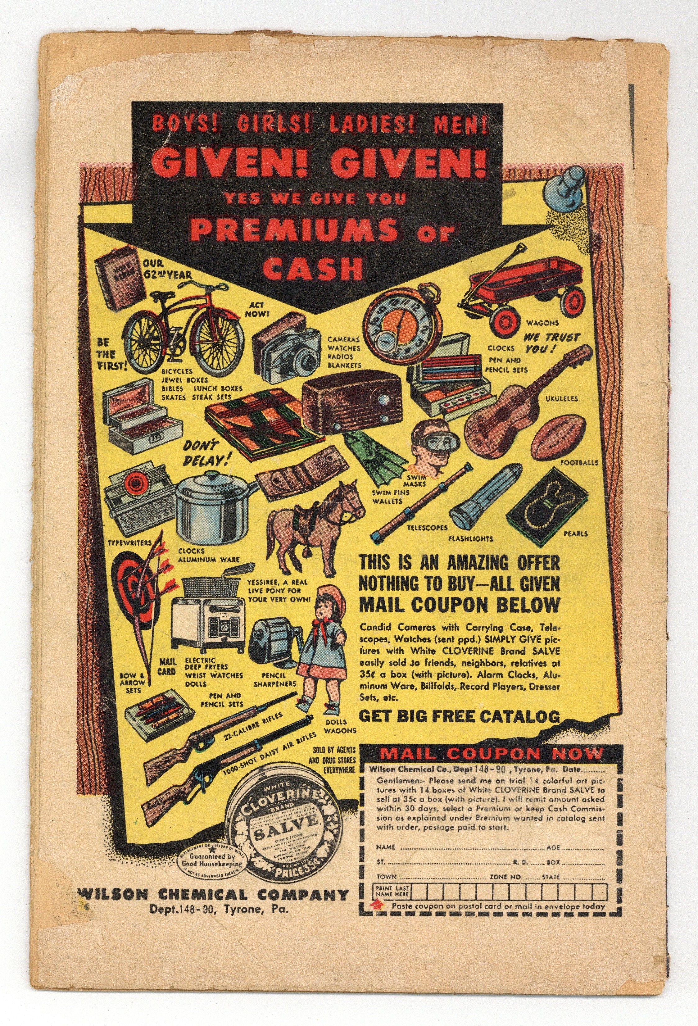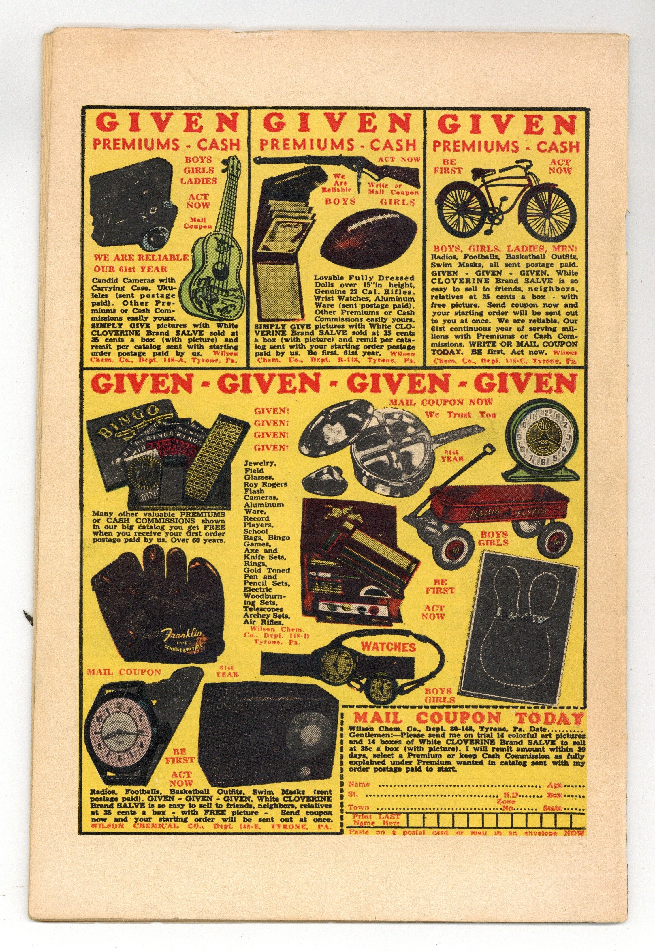 Starts Mar 9 Cover pencils by Bill Everett, inks by Carl Burgos. "Bring Back My Body," pencils by George Woodbridge, inks by Syd Shores; When a man in a trance gets into an astral duel with another, the strain proves too much for his body. "It Hides Under the Ground," script by Carl Wessler, art by Syd Shores; A coward cooks up a scheme to swindle two old men out of paying for a fake chariot of Odin, but when his workers dig in another spot in the cave where he planted the fake chariot, they uncover the real thing and it takes him to Valhalla to fight battles for eternity. "They Can't Find Me," art by Manny Stallman; A scientist invents an invisibility serum that only renders the one who imbibes it invisible to himself. "The Blinding Flash," script by Carl Wessler, art by Robert Q. Sale; When a scientist invents a device that allows an image to be projected into the past that can retrieve objects, a crook uses it to pick up a lighter with his initials that he dropped at the scene of his robbery. "The Face in the Darkness," art by Howard O'Donnell; A man who goes to mediums looking to speak to a non-living relative thinks the swami who conjures a spirit is fake because the spirit can answer none of his questions. 36 pgs., full color. $0.10. Cover price $0.10.