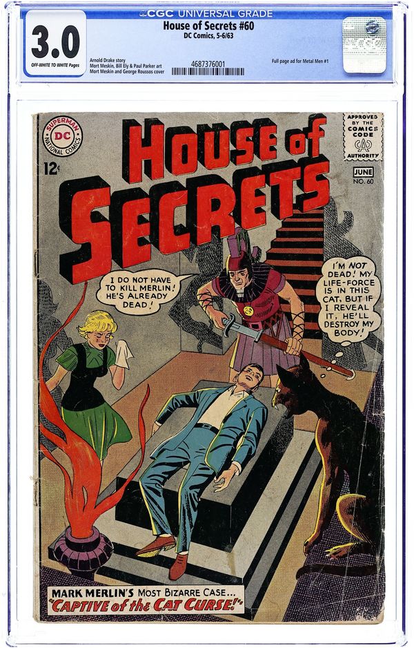 Starts May 4 Cover pencils by Mort Meskin, inks by George Roussos. "Countdown on Excellence" public service announcement, script by Jack Schiff, art by Sheldon Moldoff; Jerry's dad explains what would happen if people had sloppy work habits. "Captive of the Cat Curse," script by Arnold Drake, pencils by Mort Meskin, inks by George Roussos; Mark Merlin accidentally uses a mystical charm to transfer his consciousness into the body of a black cat, which helps him expose a sinister plot. Strange Sports Stories ad. "The Box of Four Fears," art by Bill Ely; Four tourists pool their funds to buy a strange sealed box, but it turns out to be a plan to trap one of them into a murder confession. Metal Men ad. "The Terrible Prophecies of the Tattooed Man," art by Paul Parker; A circus performer's tattoos seem to change shape and predict catastrophe. 36 Pages, Full Color. Cover price $0.12.