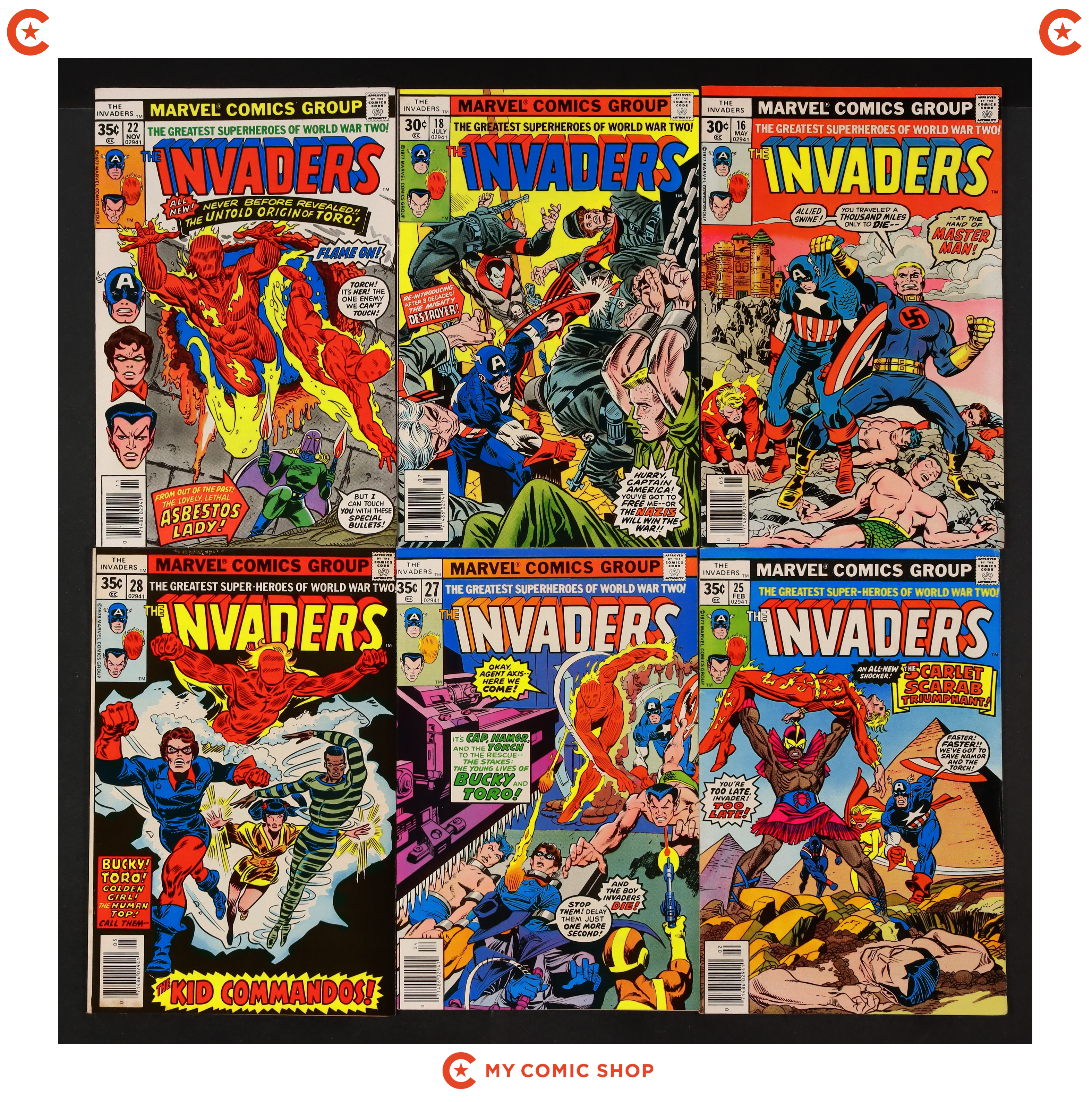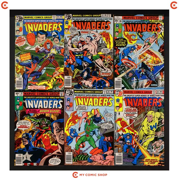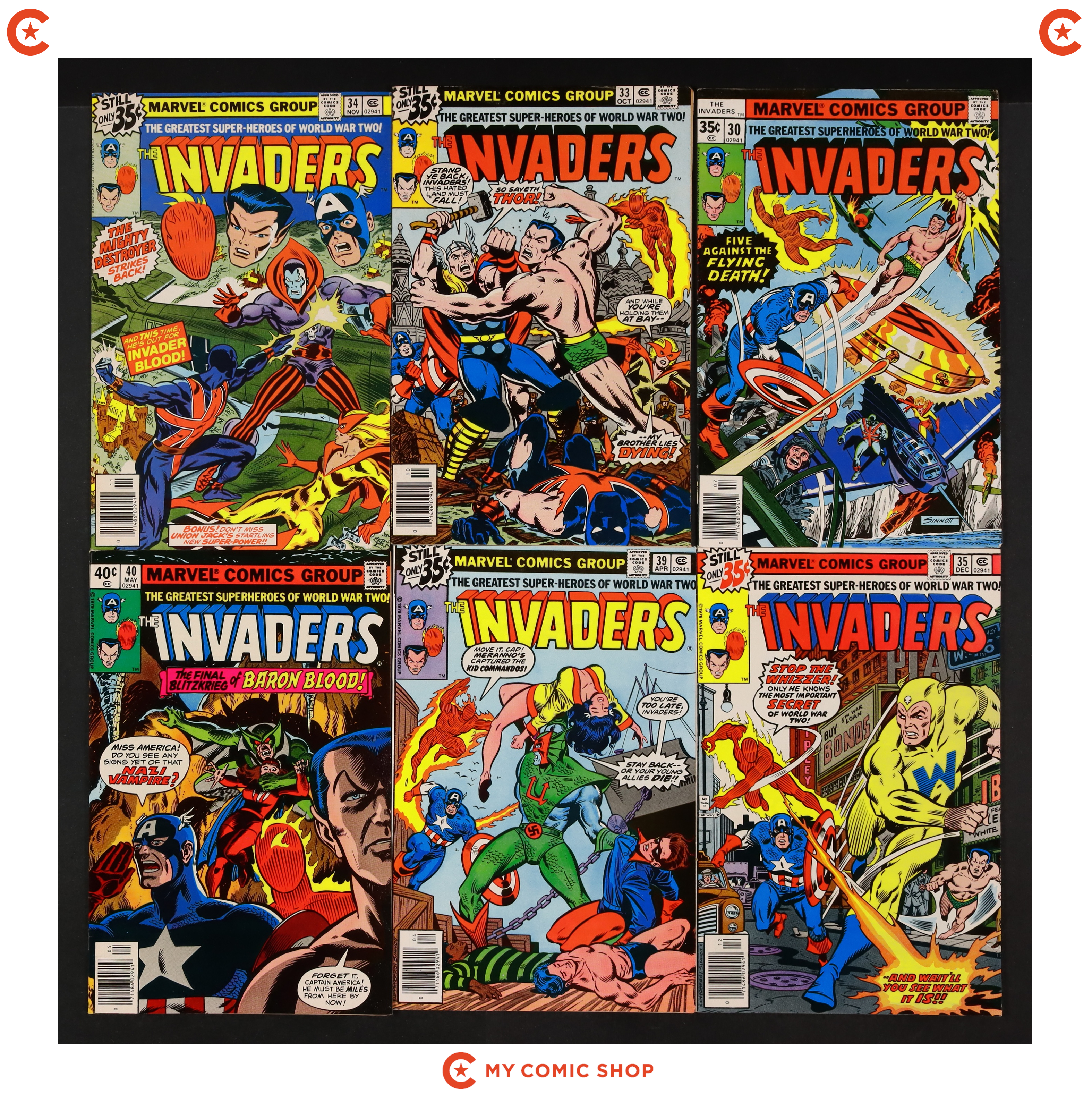 Issues 18, 22, 24, 25, 27, 28, 30, 33, 34, 35, 39, 40 of Invaders (1975 Marvel 1st Series). Most will grade in the VG to FN range.