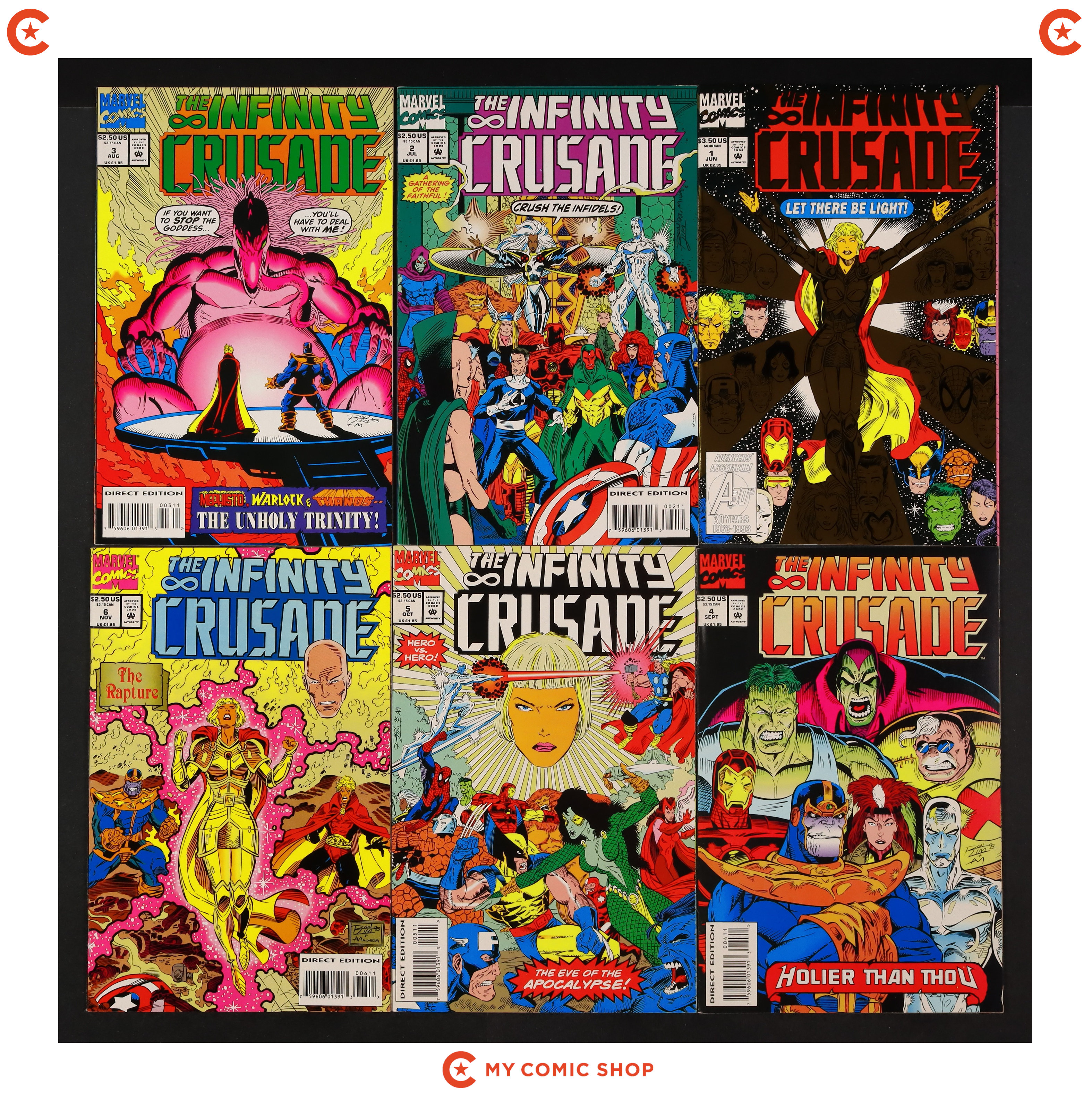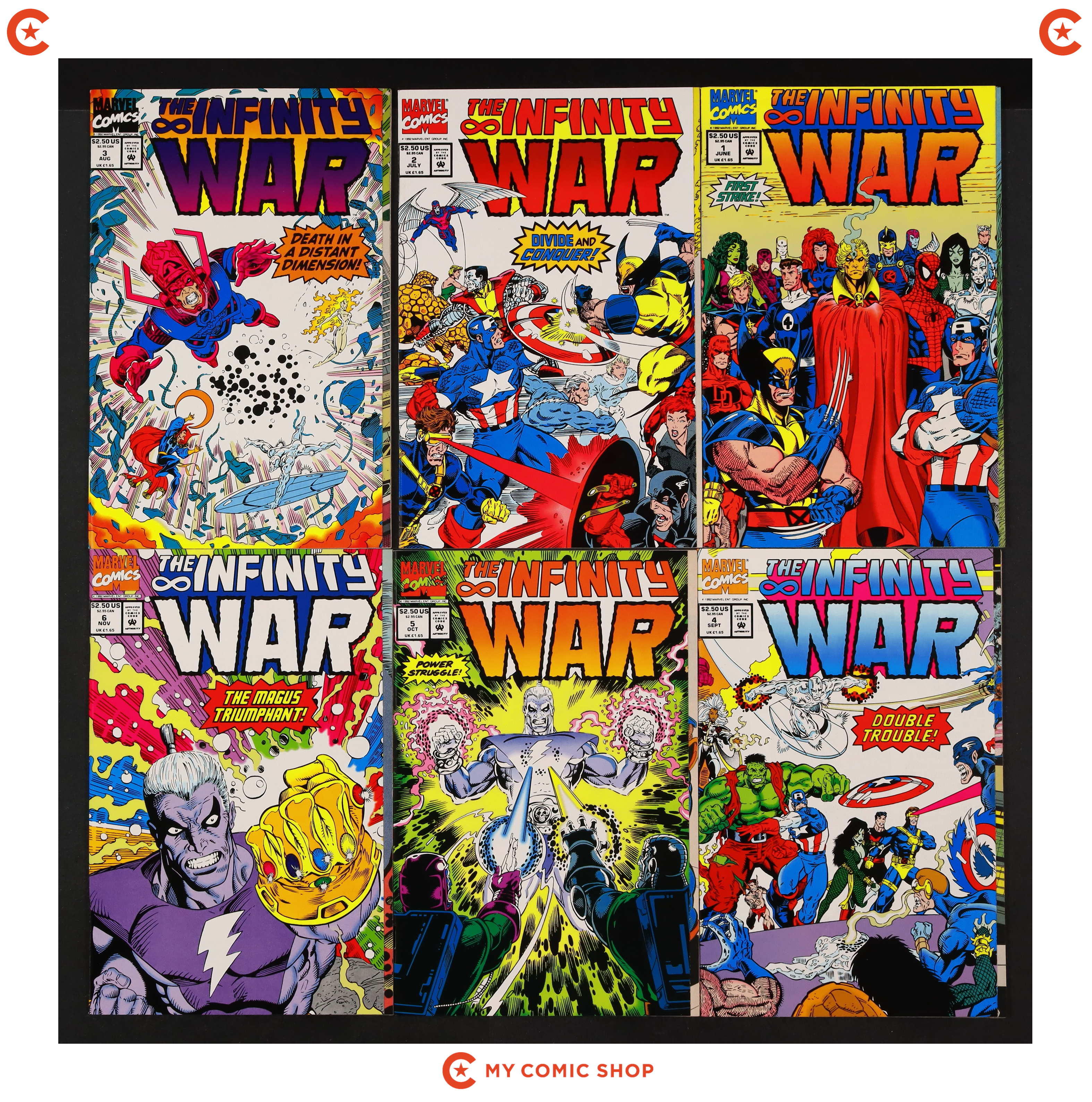 Issues 2D, 3D, 6 of Infinity Gauntlet (1991); 1-6 of Infinity War (1992); and Infinity Crusade (1993 Marvel) 1A. Most will grade in the VG/FN to FN/VF range, with Infinity War (1992) 4 grading at FR/GD.