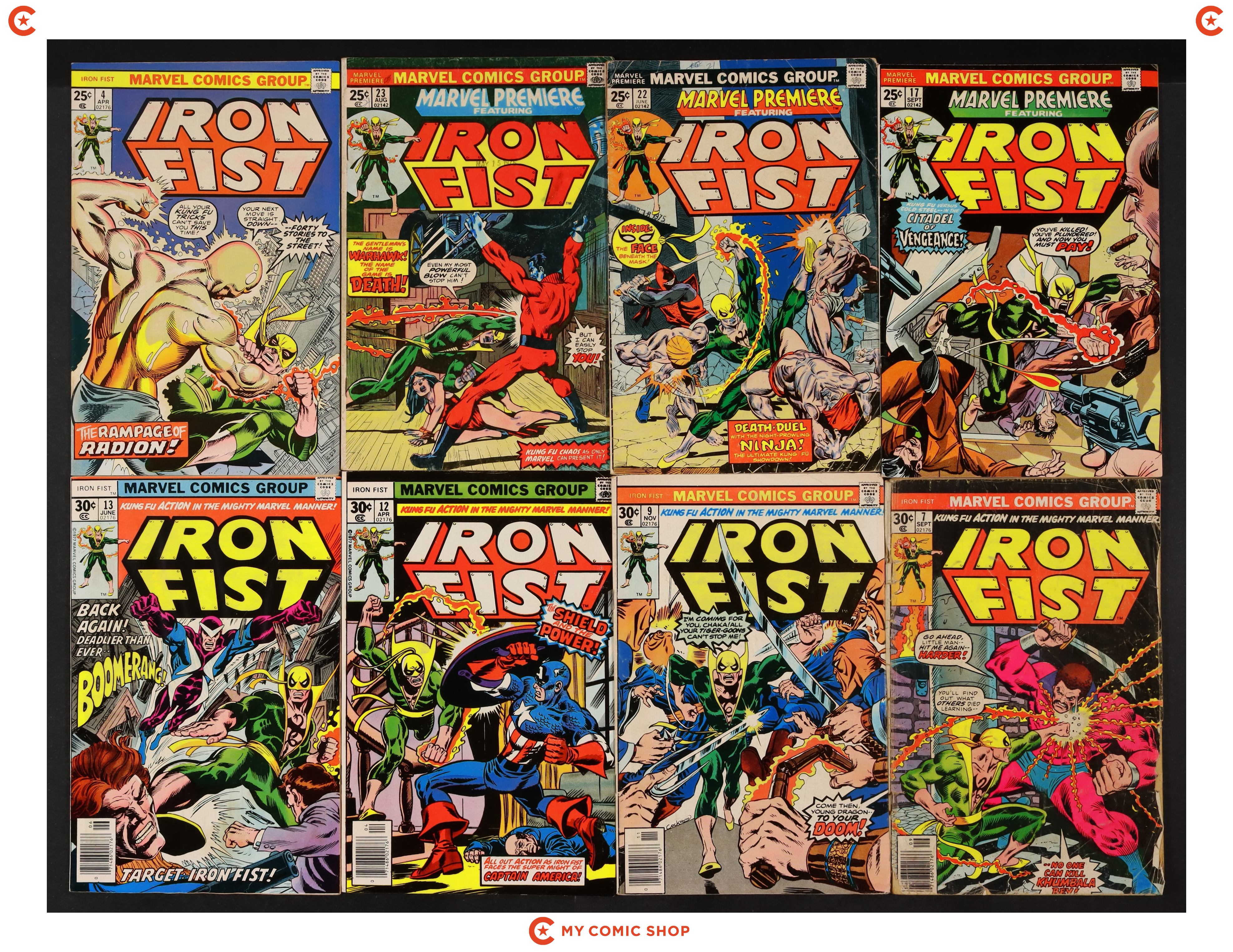 Issues 17, 22, and 23 of Marvel Premiere (1972); and 4, 7, 9, 12, and 13 of Iron Fist (1975 1st Series). Most will grade in the VG to GD.