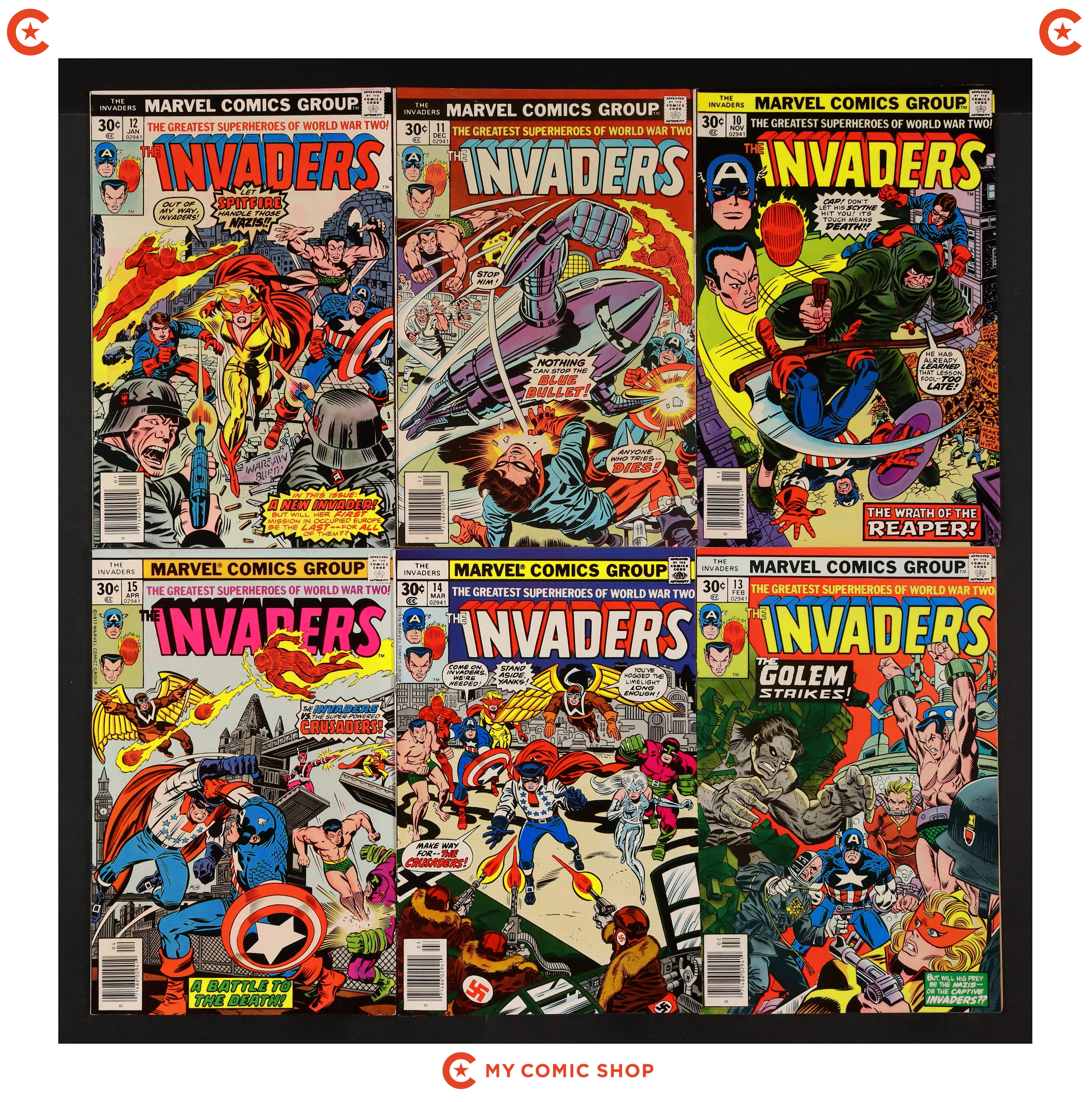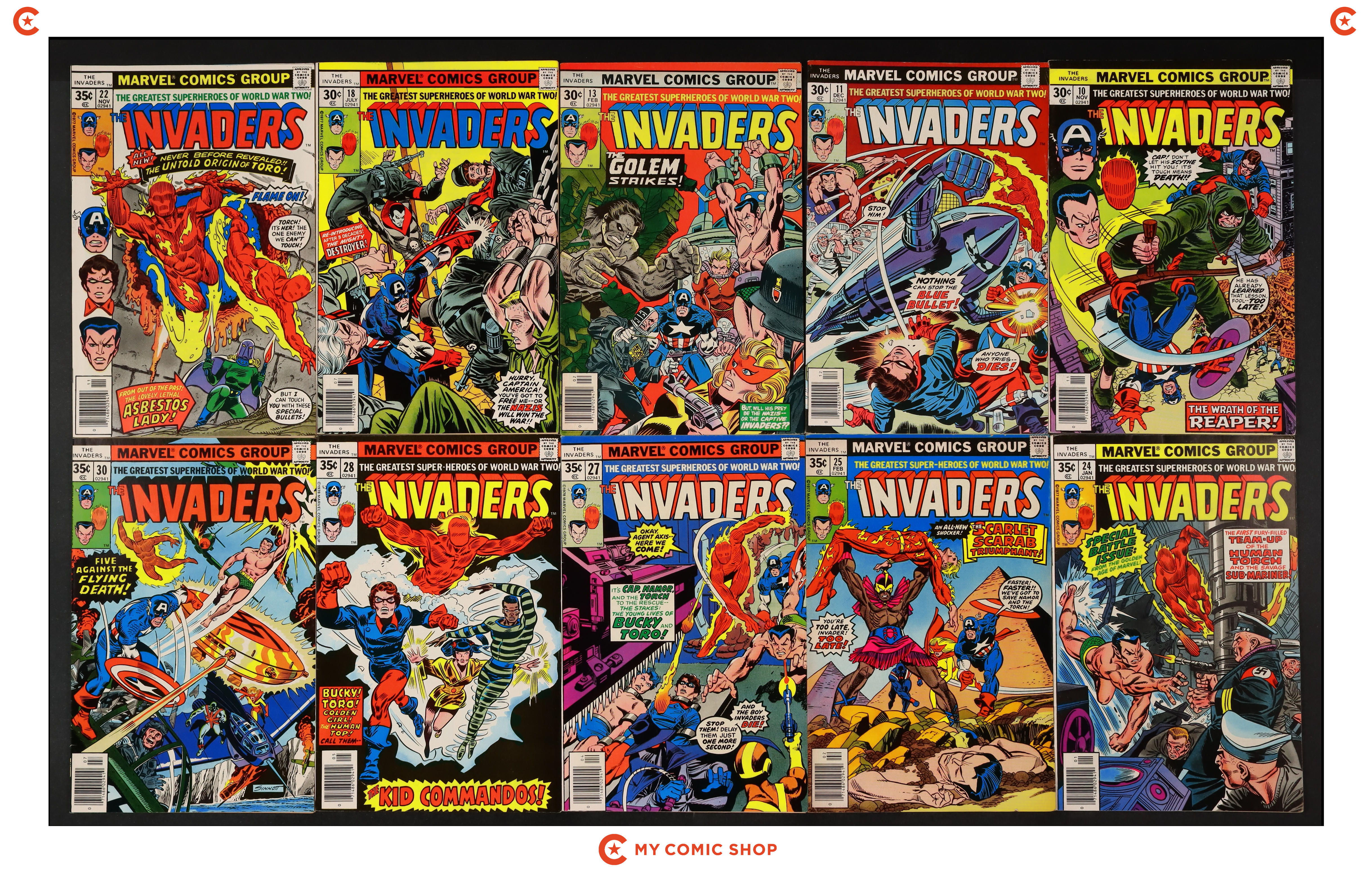 Issues 10, 11, 13, 18, 22, 24, 25, 27, 28, & 30 of Invaders (1975 Marvel 1st Series). Most will grade in the VG to FN range.