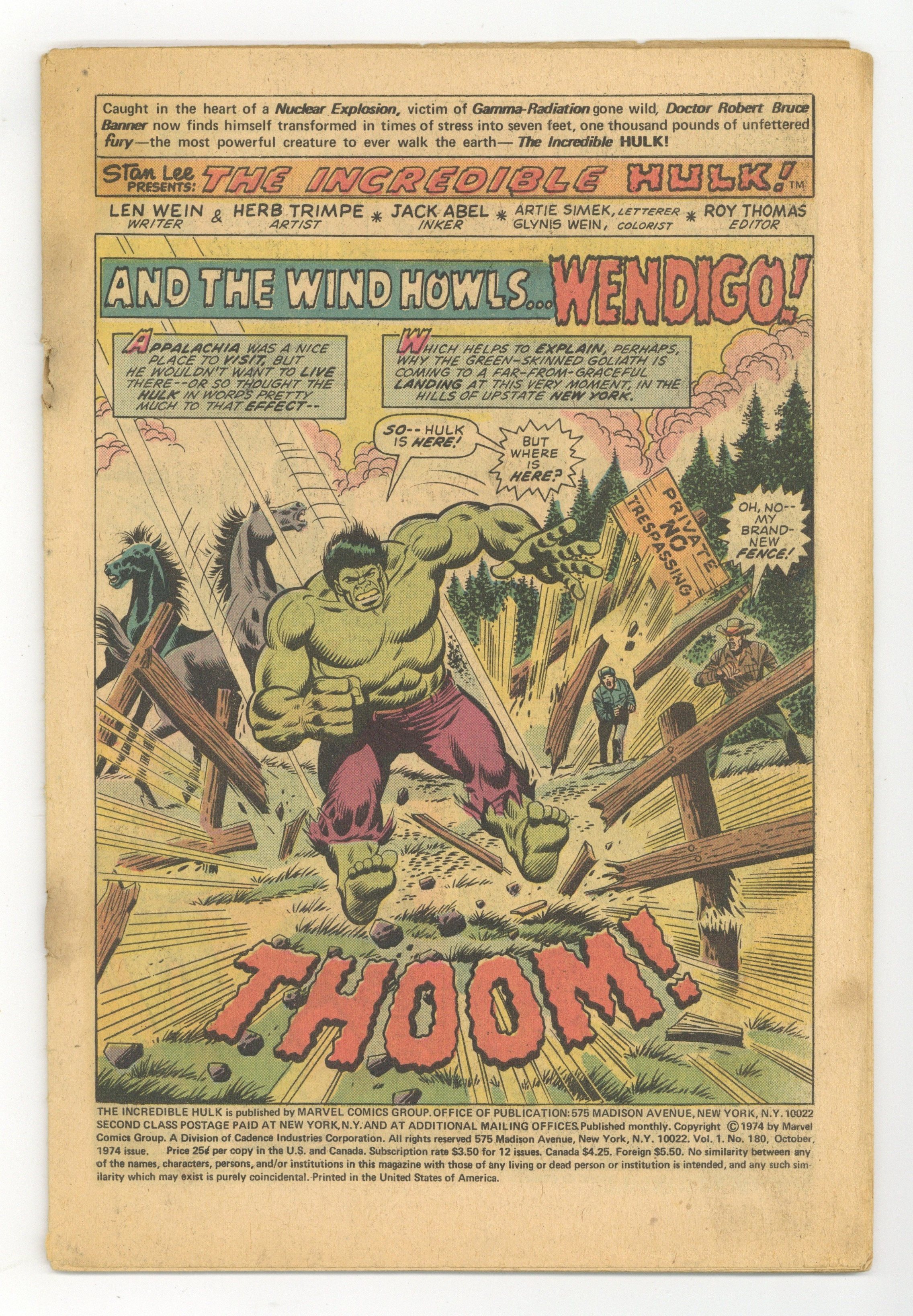Starts Apr 4 First appearance of Wolverine (cameo last panel). Cover art by Herb Trimpe. And the Wind Howls...Wendigo!, script by Len Wein, pencils by Herb Trimpe, inks by Jack Abel; Hulk is in Canada looking for some peace and quiet when he is mysteriously drawn to a cave inhabited by the sister of the man who became the Wendigo; Marie and Georges plan on transferring the power of the Wendigo to the Hulk, thus restorin Paul Cartier to his normal life; Marie's magic isn't strong enough, however, and just as Wendigo shows up, the Hulk wakes up from his magical slumber and the two battle; The Canadian government gets involved and sends in their own agent to take care of a recent Hulk sighting, the mutant known as Wolverine. Marvel Value Stamp Series A (Cyclops). 36 pgs. $0.25. Cover price $0.25.