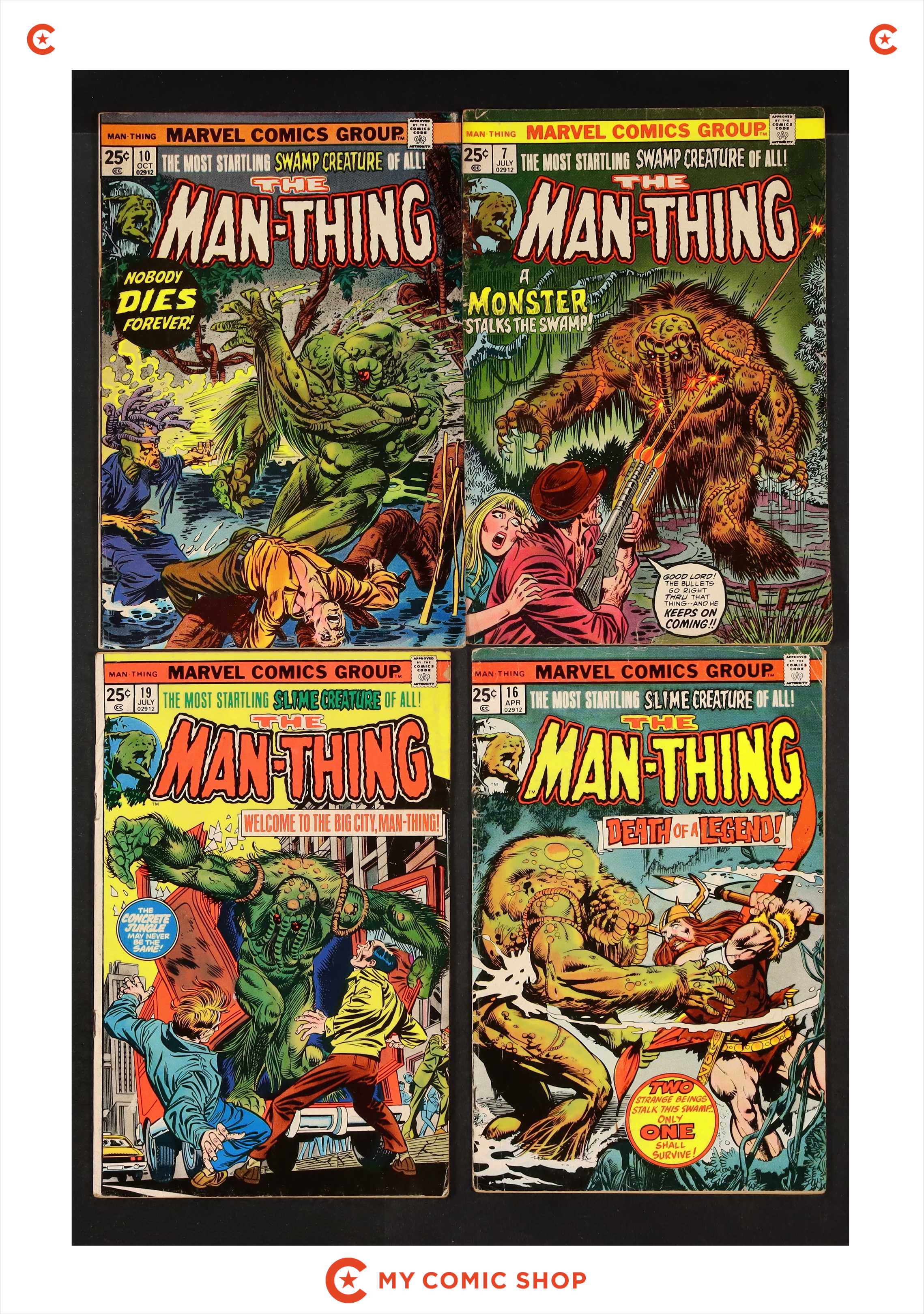 issues 7, 10, 16, 19, 22 of Man-Thing (1974 1st Series), and issues 2, 10 of Man-Thing (1979 2nd Series). Most will grade in the VG to FN range with #19 grading GD.