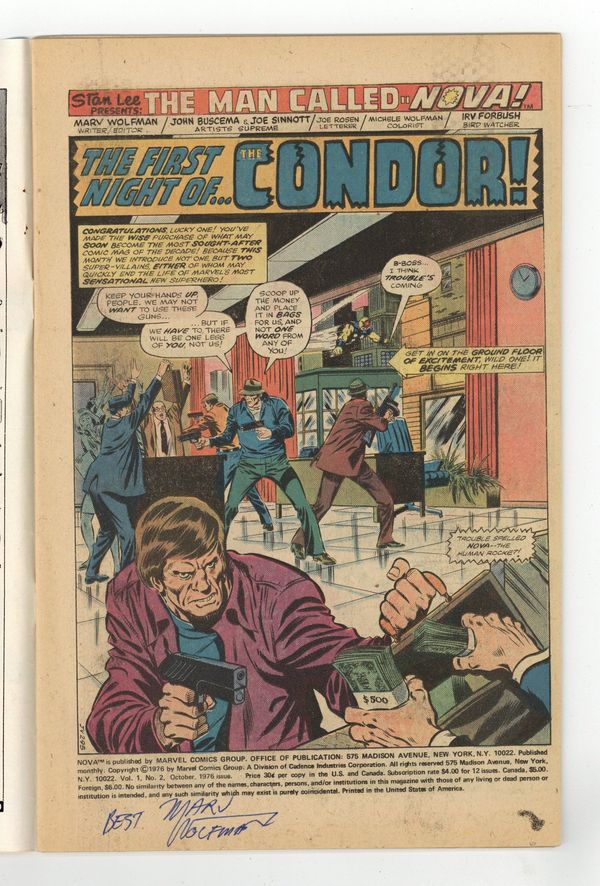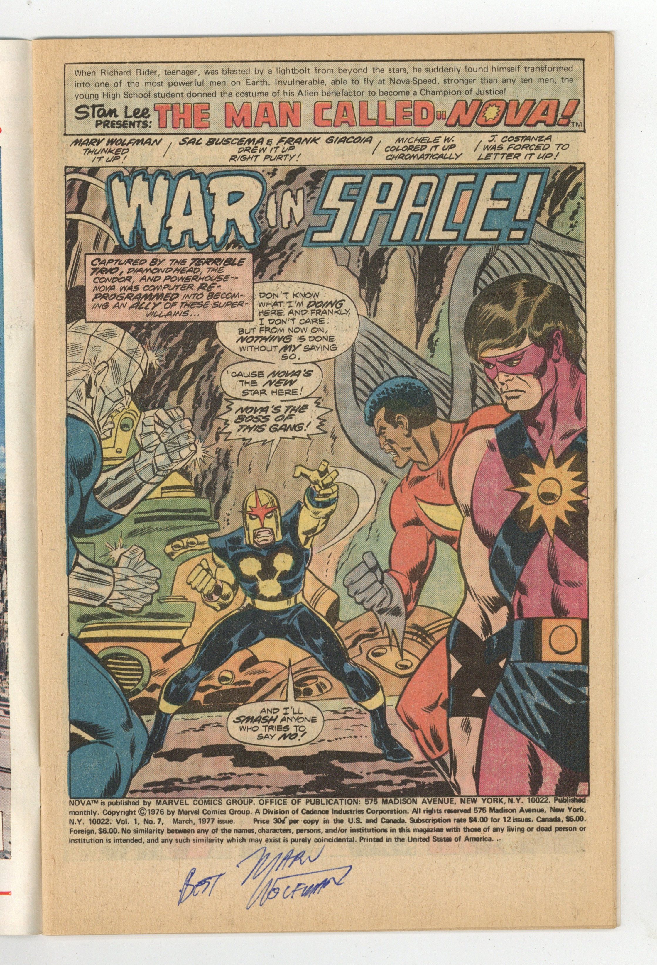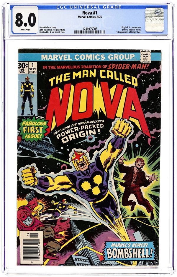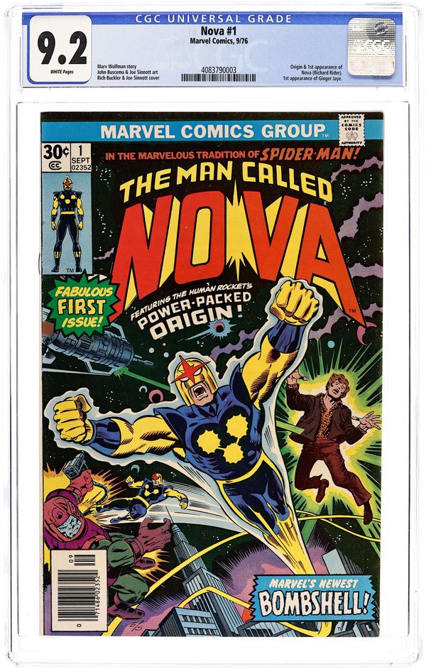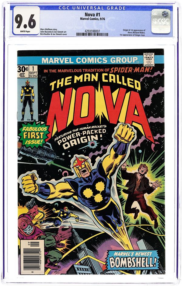 Ends Mar 23 9:06 PM CST Bid History 9 bids Current Bid $105 Your Secret Max Bid If you'd like to bid, please log in or register. Written by Marv Wolfman. Pencils by John Buscema. Inks Joe Sinnott. When a dying alien passes on his super-powers to Earth teenager Richard Rider, Rider becomes the man called Nova, the human rocket! In the marvelous tradition of Spider-man, Nova must now stop the murderous alien known as Zorr, or Earth is doomed! Note: First appearance of Nova. 36 pages, full color. Cover price $0.30.