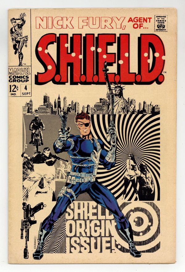 Starts Apr 4 Cover by Jim Steranko. SHIELD origin retold in "And Now It Begins...', script by Roy Thomas (plot, dialogue) and Frank Springer (plot), art by Frank Springer; HYDRA repeatedly tries to murder Nick Fury before he can recruited to head SHIELD; The agent in charge of the operation, Agent L, is executed for his failure by Agent H; After reminiscing about his days in WW2, Fury meets Tony Stark, who introduces him to the SHIELD board of directors, then shows him a film detailing HYDRA's operations; After Fury uncovers a bomb in the room and dispatches it, along with the spy who planted it, he realizes the danger facing the free world and takes the job. Frank Springer's 1st Marvel work. 36 pgs., full color. $0.12. Cover price $0.12.