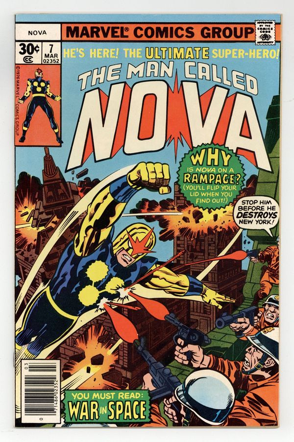 Starts Jul 4 Written by Marv Wolfman. Pencils by John Buscema. Inks Joe Sinnott. When a dying alien passes on his super-powers to Earth teenager Richard Rider, Rider becomes the man called Nova, the human rocket! In the marvelous tradition of Spider-man, Nova must now stop the murderous alien known as Zorr, or Earth is doomed! Note: First appearance of Nova. 36 pages, full color. Cover price $0.30.