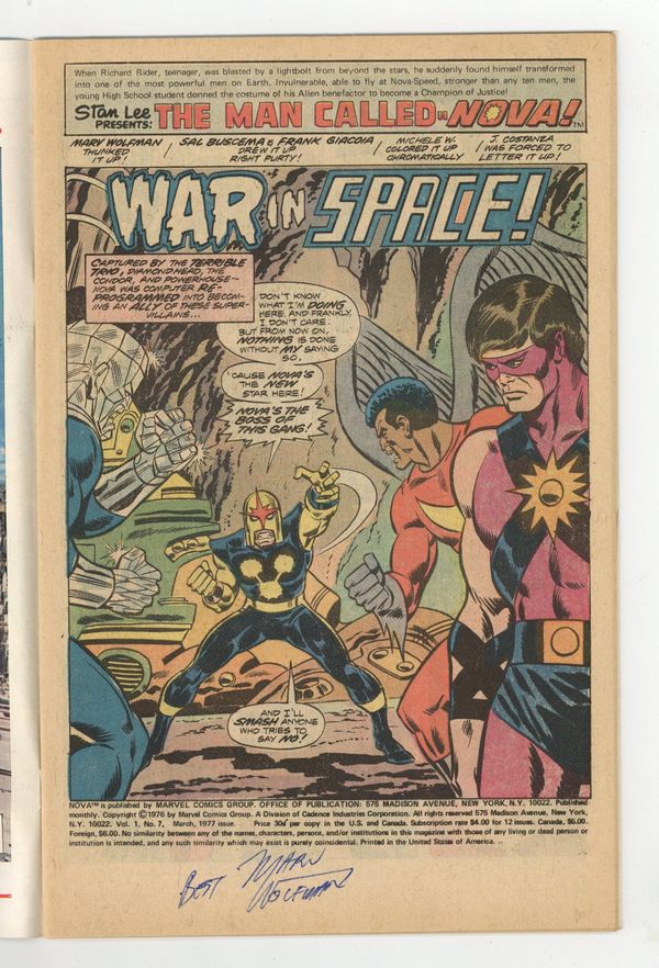 Starts Apr 4 Written by Marv Wolfman. Pencils by John Buscema. Inks Joe Sinnott. When a dying alien passes on his super-powers to Earth teenager Richard Rider, Rider becomes the man called Nova, the human rocket! In the marvelous tradition of Spider-man, Nova must now stop the murderous alien known as Zorr, or Earth is doomed! Note: First appearance of Nova. 36 pages, full color. Cover price $0.30.