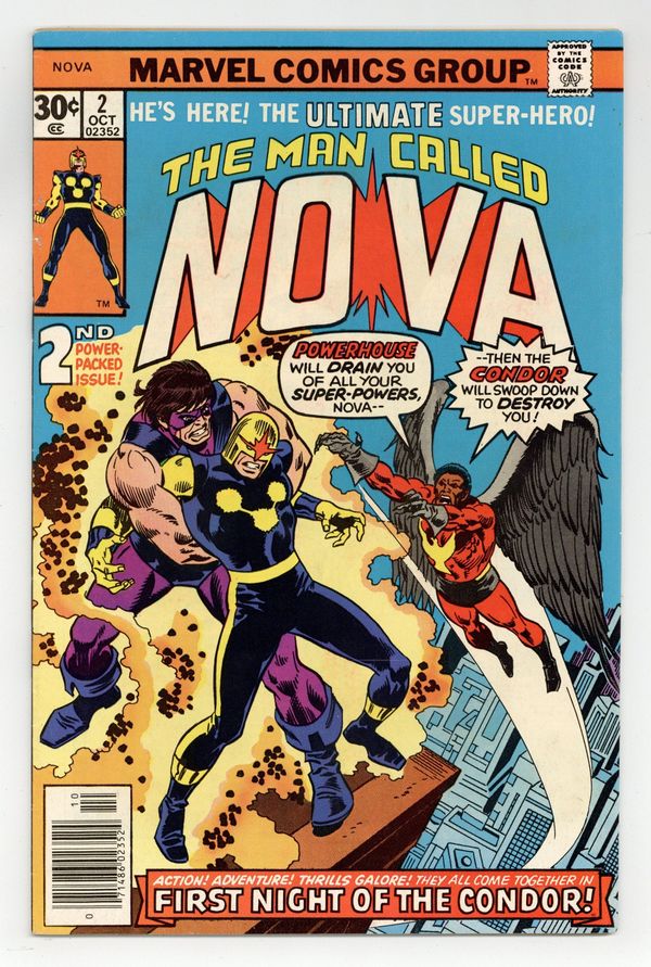 Starts Mar 23 "The First Night of the Condor!" Story by Marv Wolfman. Art by John Buscema and Joe Sinnott. Richard Rider has been granted all the powers of Nova Prime. Strength, speed, durability, and flight are now his and he plans to honor this gift by smiting evil doers everywhere. However, even with his new found abilities can Nova hope to defeat the energy draining Powerhouse and his accomplice the bird of prey known as the Condor. 32 pages. Cover price $0.30.