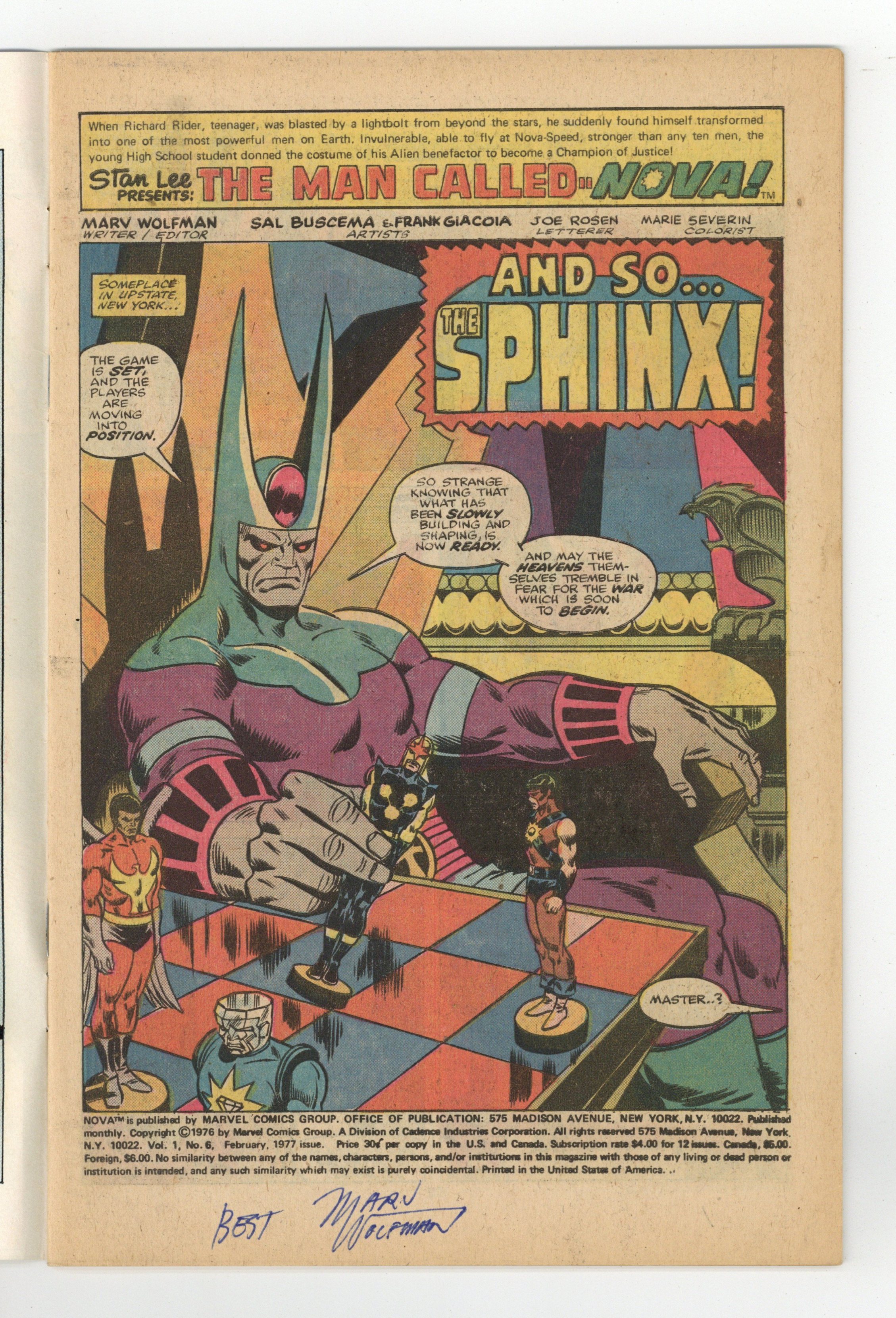 Starts Mar 23 "War in Space!" Story by Marv Wolfman. Art by Sal Buscema and Frank Giacoia. Jack Kirby cover. Can it be? Is Nova now working for the bad guys? This can't be good. Plus, learn the epic origin of the enigmatic Sphinx. 32 pages. Cover price $0.30.