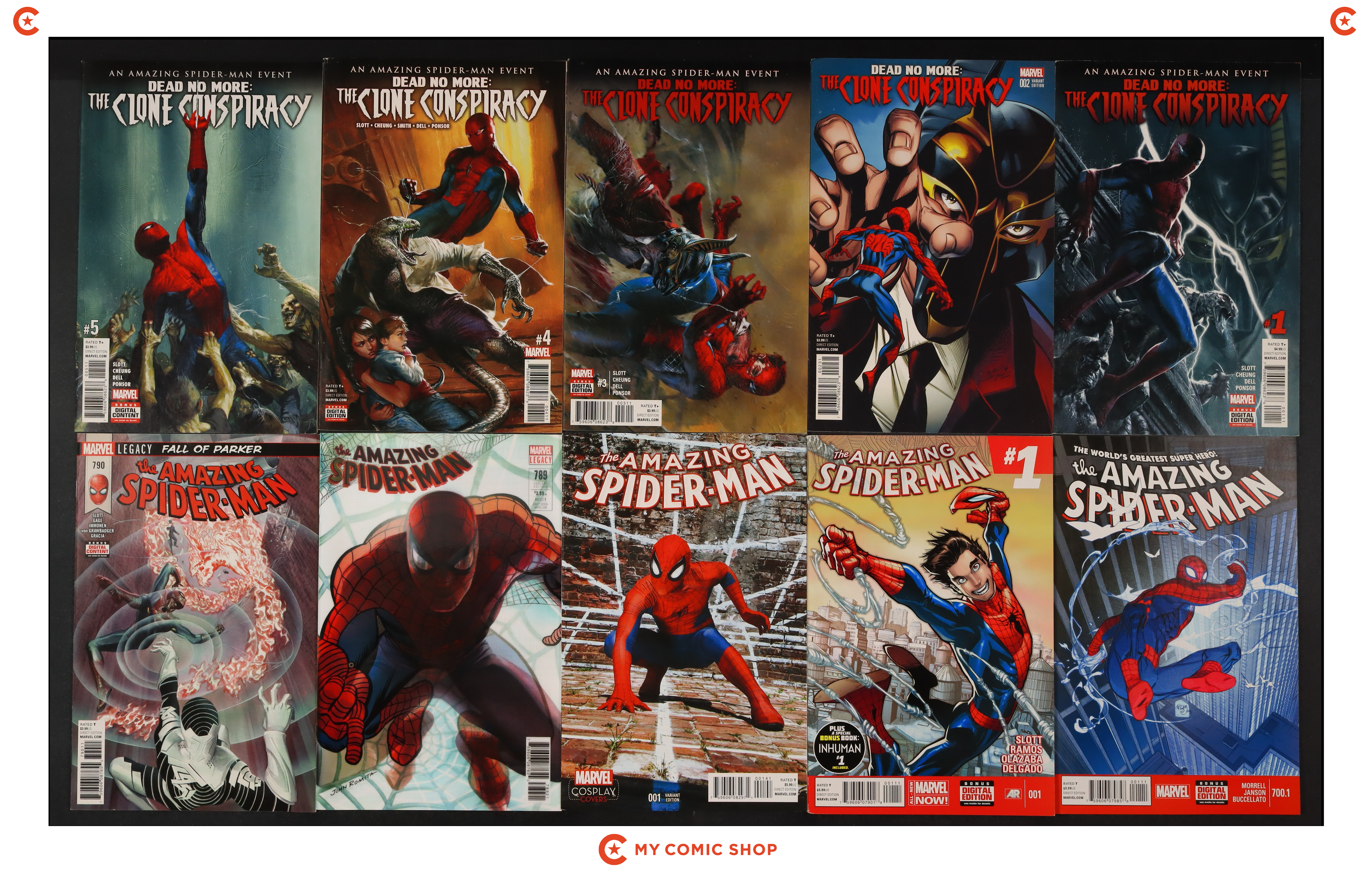 Issues 1A, 2B, 3A, 4A, 5A of Clone Conspiracy (2016 Marvel) Spider-Man, issue 700.1A of Amazing Spider-Man (1998 2nd Series), issue 1A of Amazing Spider-Man (2014 3rd Series), and issue 1C of Amazing Spider-Man (2015 4th Series). issues 789B, 790 of Amazing Spider-Man (2017 5th Series). Most will grade in the FN+ to NM range.