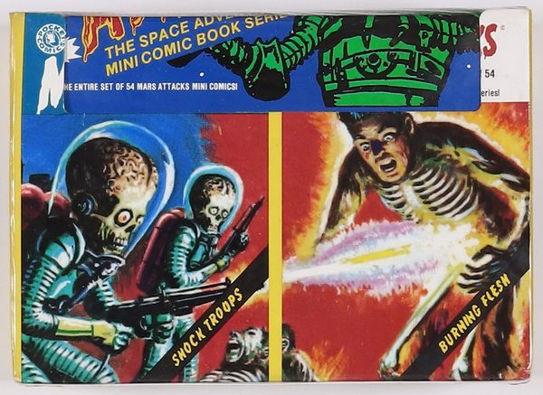 Includes 25 copies each of issues 3 and 4 of the Mars Attacks Mini Comics from 1988 produced by Pocket Comics. 6 1/2" x 2 1/2" x 4 1/2".