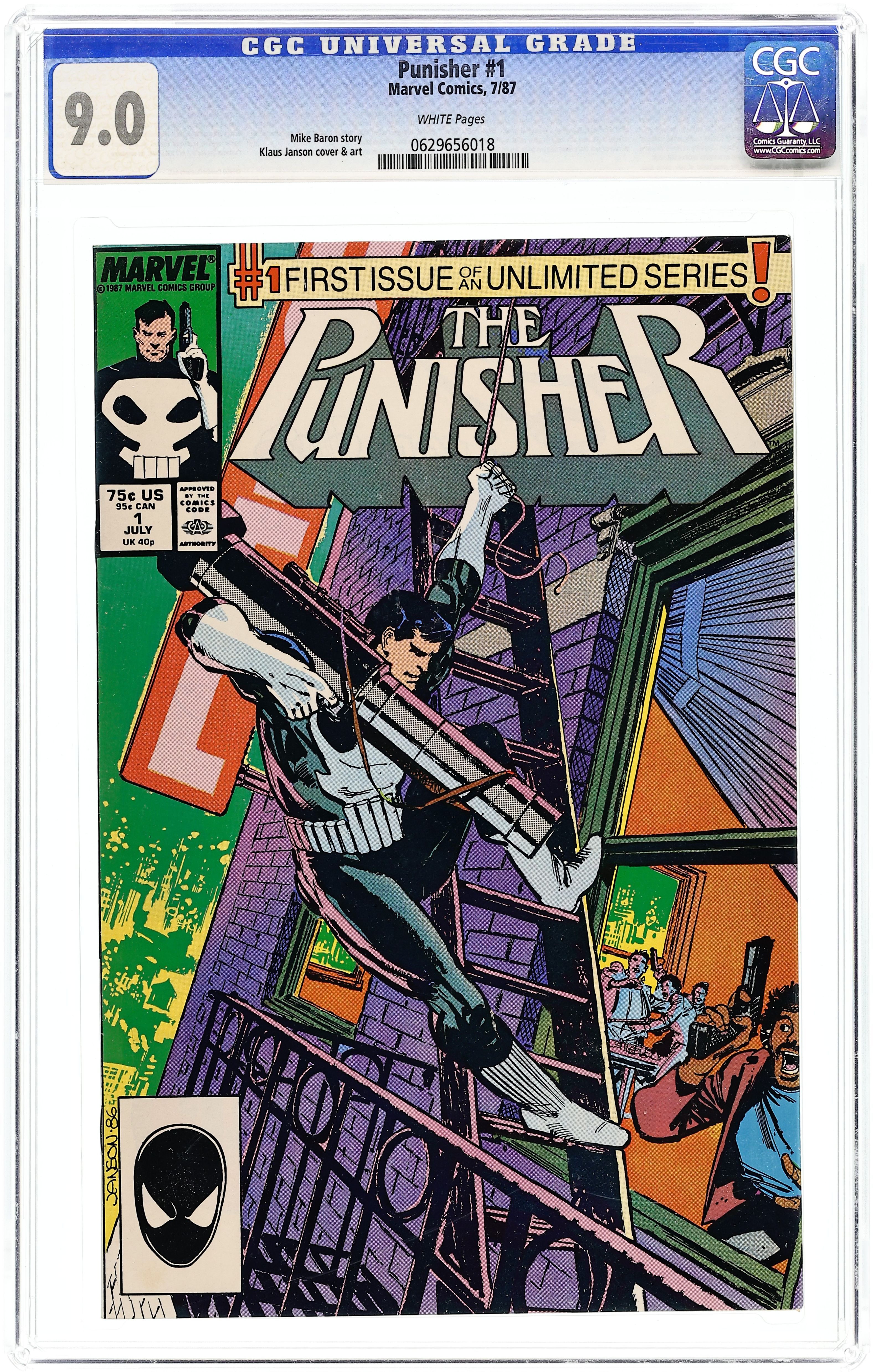 Direct Edition. Story by Mike Baron. Art by Klaus Janson. Vietnam vet Frank Castle's wife and children were caught in the crossfire of warring crime families. Now, he's back and they're all going to pay. All of them. Those that visit harm on others will come to know him as the Punisher. Frank starts up his first ongoing series with guns blazing. His first target, a drug dealer who thinks he's above the law. Well, he's not above Punishment. Cover price $0.75.