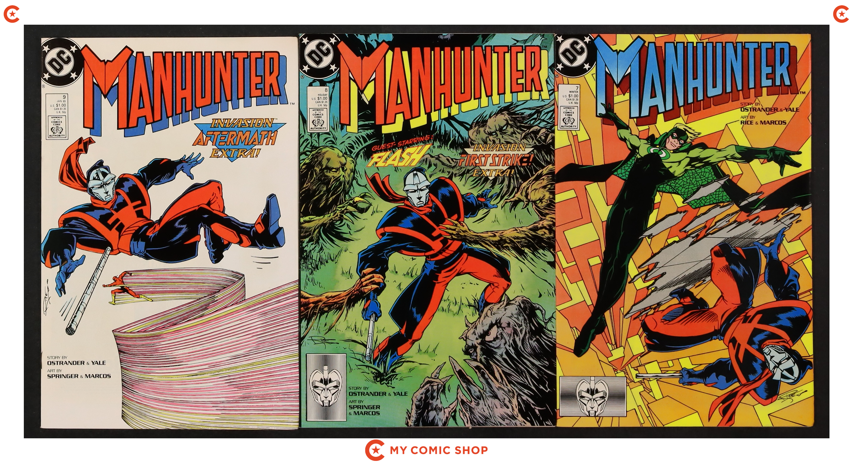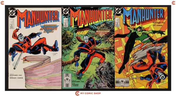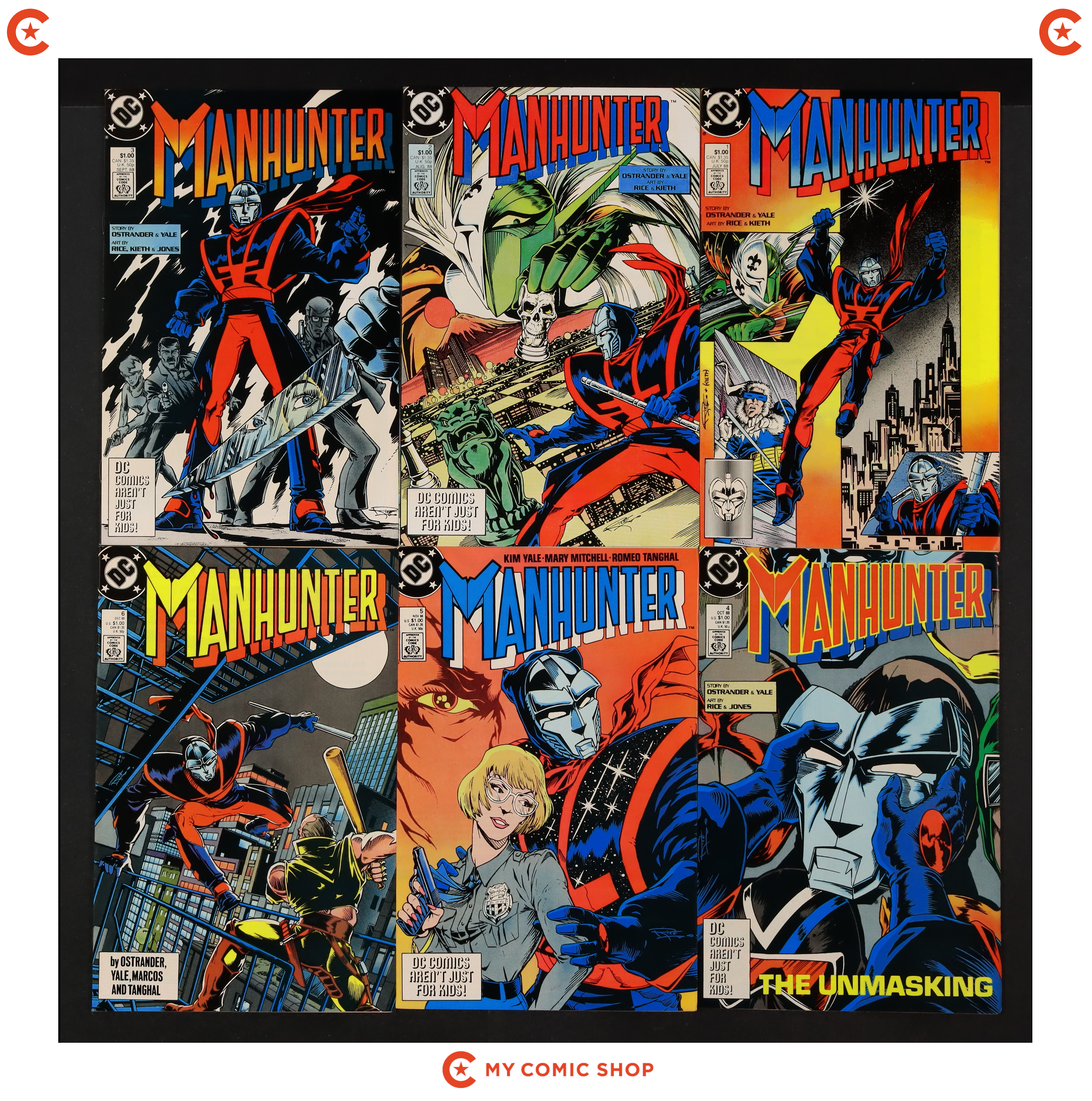 Issues 1-9 of Manhunter (1988 1st Series) and Manhunter Cardboard foldout mask. Issues 1 and 2 signed by John Ostrander, Kim Yale, and Sam Kieth. Issue 3 signed by Kelley Jones, Ostrander, Yale, Kieth. Issue 4 signed by Ostrander, Yale, Jones. Issues 5-9 signed by Ostrander and Yale. No autograph certification is included. Most will grade in the VG to FN range.