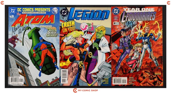 Issue 2 of Legionnaires (1993) Annual, issue 70 of Legion of Super-Heroes (1989 4th Series), and issue 1 of DC Comics Presents The Atom (2004) all signed by Mark Waid. No autograph certification is included. Most will grade in the FN to VF range.