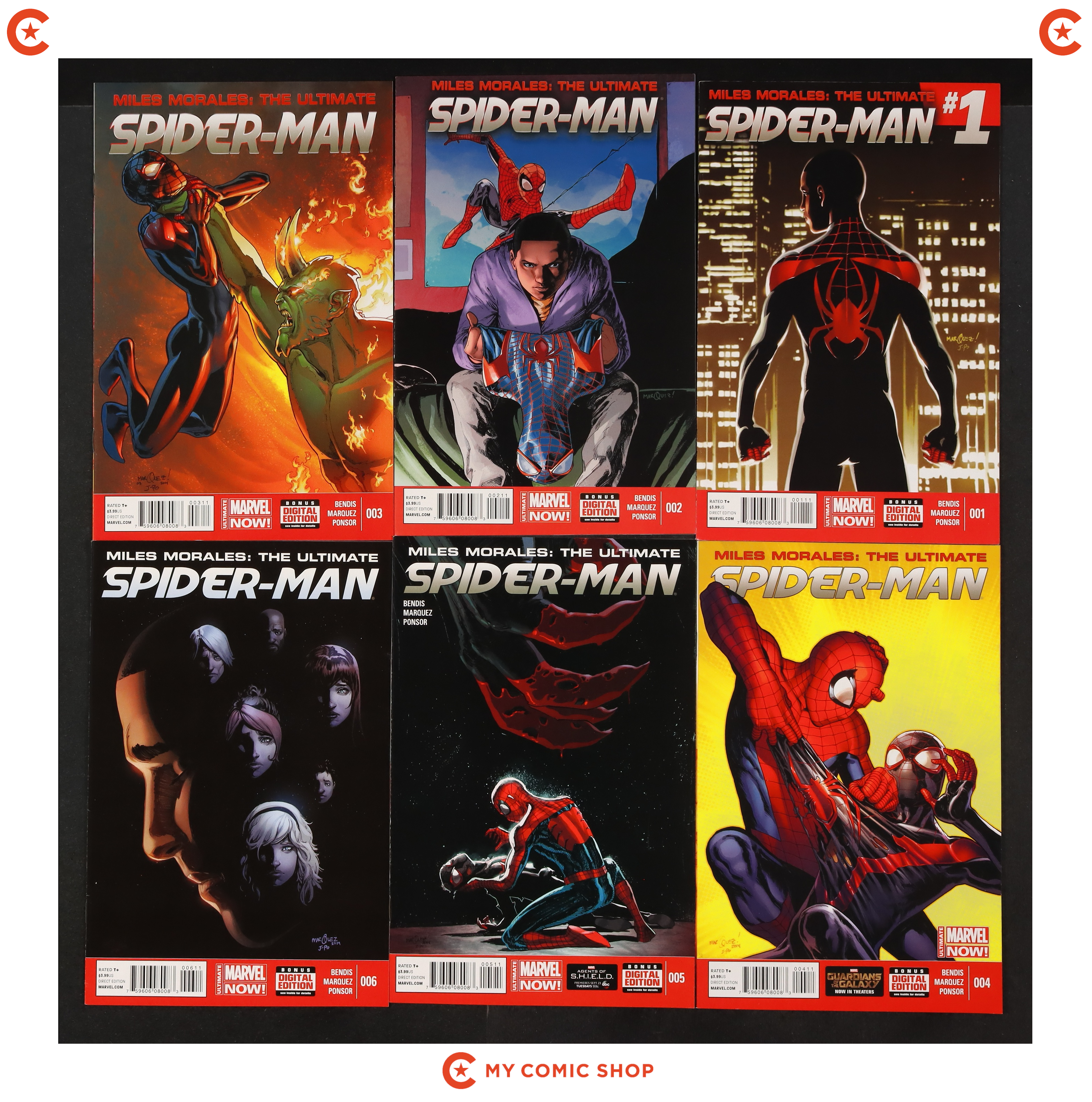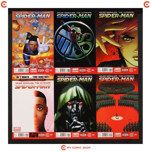 Issues 1A, 2A, 3A, 4-12 of Miles Morales Ultimate Spider-Man (2014). Most will grade in the VF to NM range with #9 grading FN