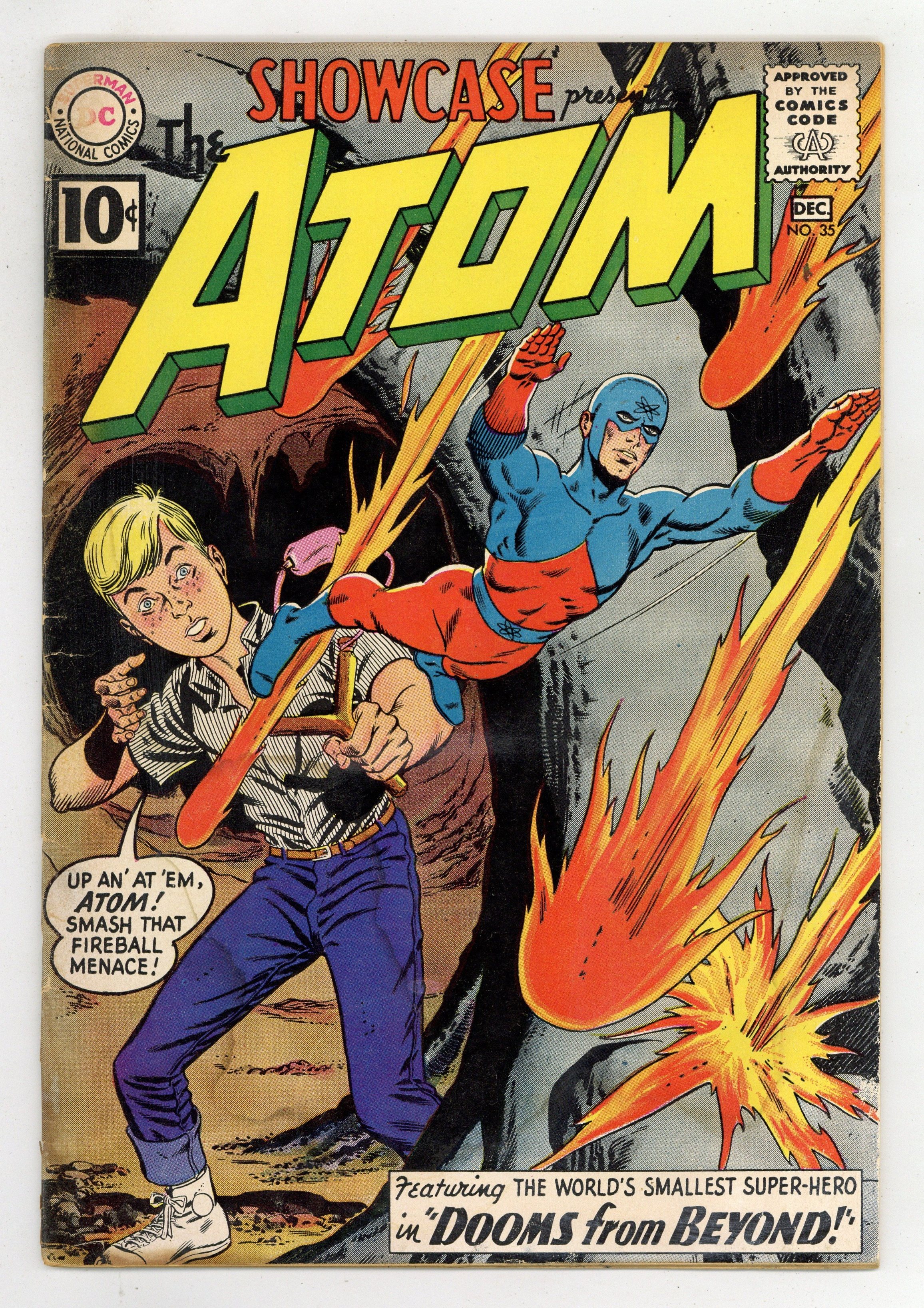 Starts Dec 22 Cover pencils by Gil Kane, inks by Murphy Anderson. 2nd Silver Age Atom appearance in "The Dooms from Beyond!", script by Gardner Fox, pencils by Gil Kane, inks by Murphy Anderson; When Dr. Gordon Doolin is preparing to look for funding to build a hospital in a third world country, he learns that he's really the heir to the Heath fortune; In spite of the fact that there is a family curse, Doolin legally changes his name back to Heath to collect the fortune before the deadline; Taking up residence in his grandfather's old home, Doolin apparently becomes a target of the ancient curse; Ray Palmer gets involved because Jean is the lawyer in charge of executing the will; As the Atom, Ray manages to protect Doolin from the various apparent curses comprised of the various elements. 2-page text feature with autobiographies of Fox, Kane, and Anderson. 36 Pages, Full Color. Cover price $0.10.