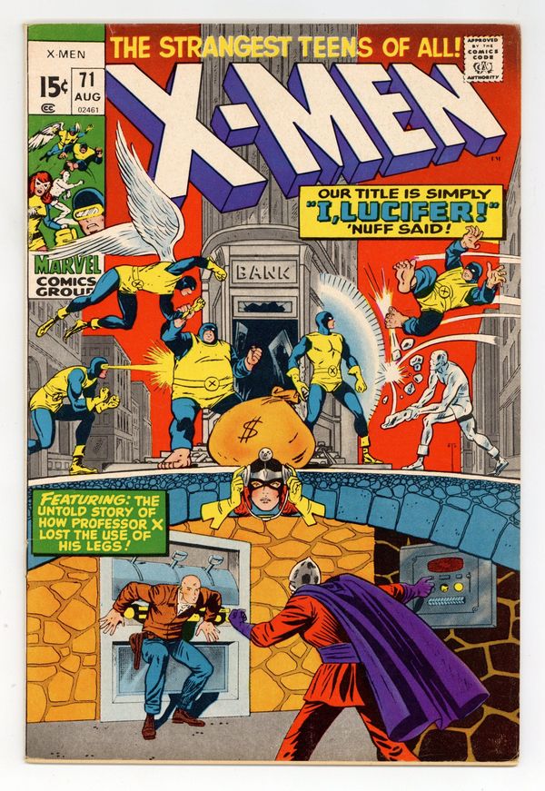 Starts Jan 19 15-cent regular-sized issue. Cover pencils by Werner Roth, inks by Dick Ayers. I, Lucifer..., script by Roy Thomas, pencils by Werner Roth [as Jay Gavin], inks by Dick Ayers; ; story of how Prof. X lost use of legs; reprinted from issue 20. 36 pages, full color. Cover price $0.15.