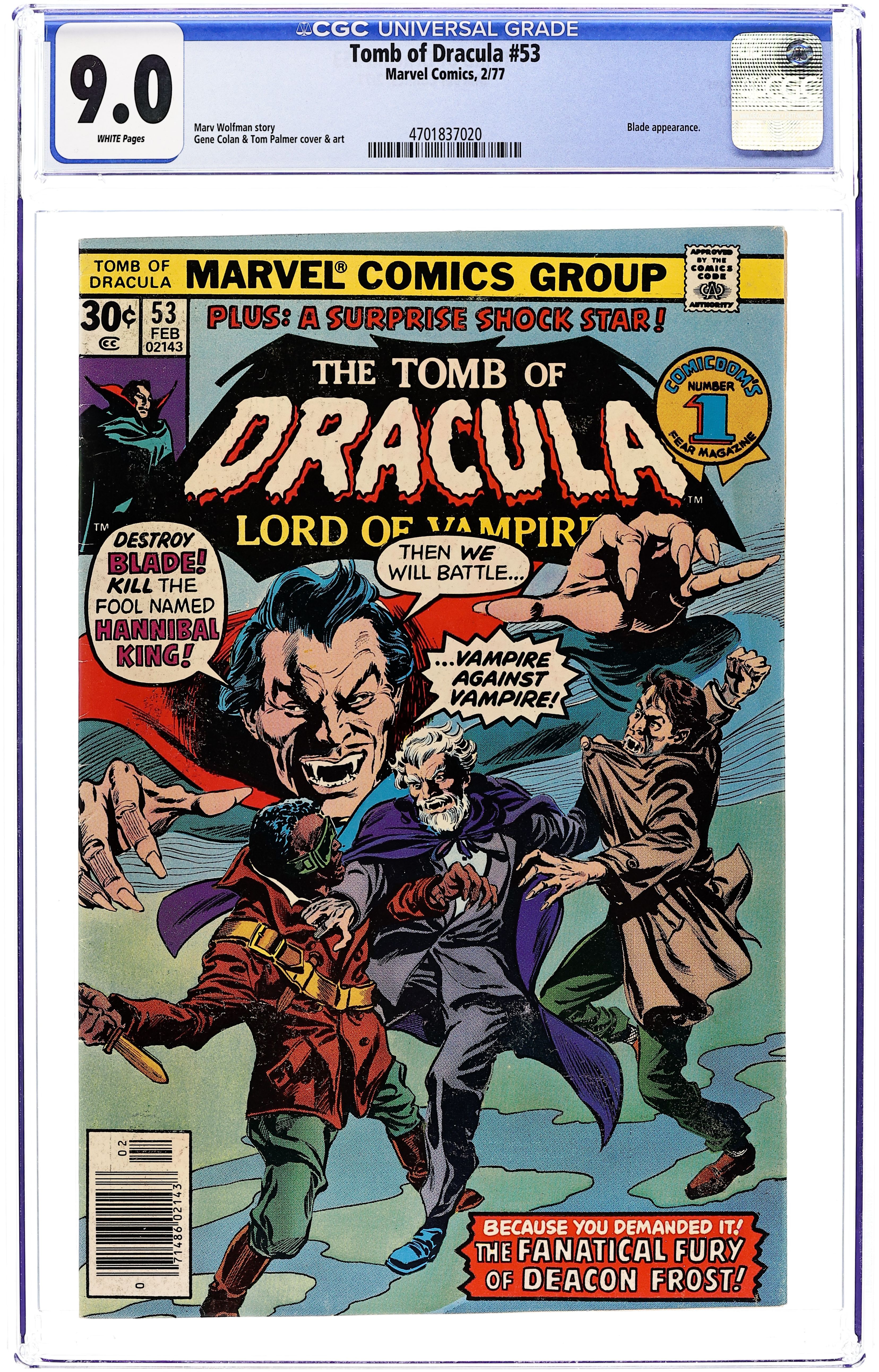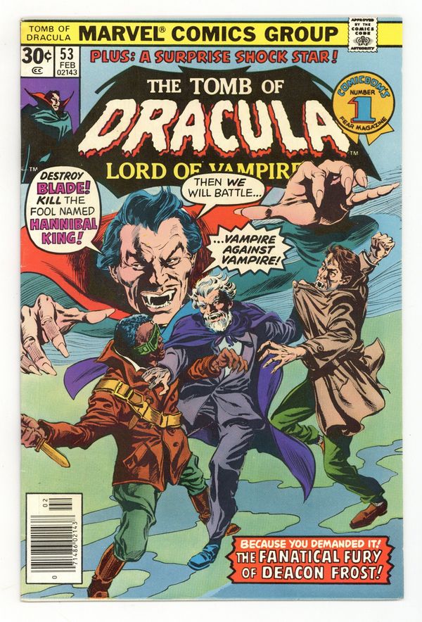 Starts Apr 20 Blade and Hannibal King guest star in "The Final Glory of Deacon Frost." Script by Marv Wolfman, pencils by Gene Colan, inks by Tom Palmer. Brief Son of Satan appearance. Letter to the editor from comics writer Peter Sanderson. Colan/Palmer cover. Cover price $0.30.