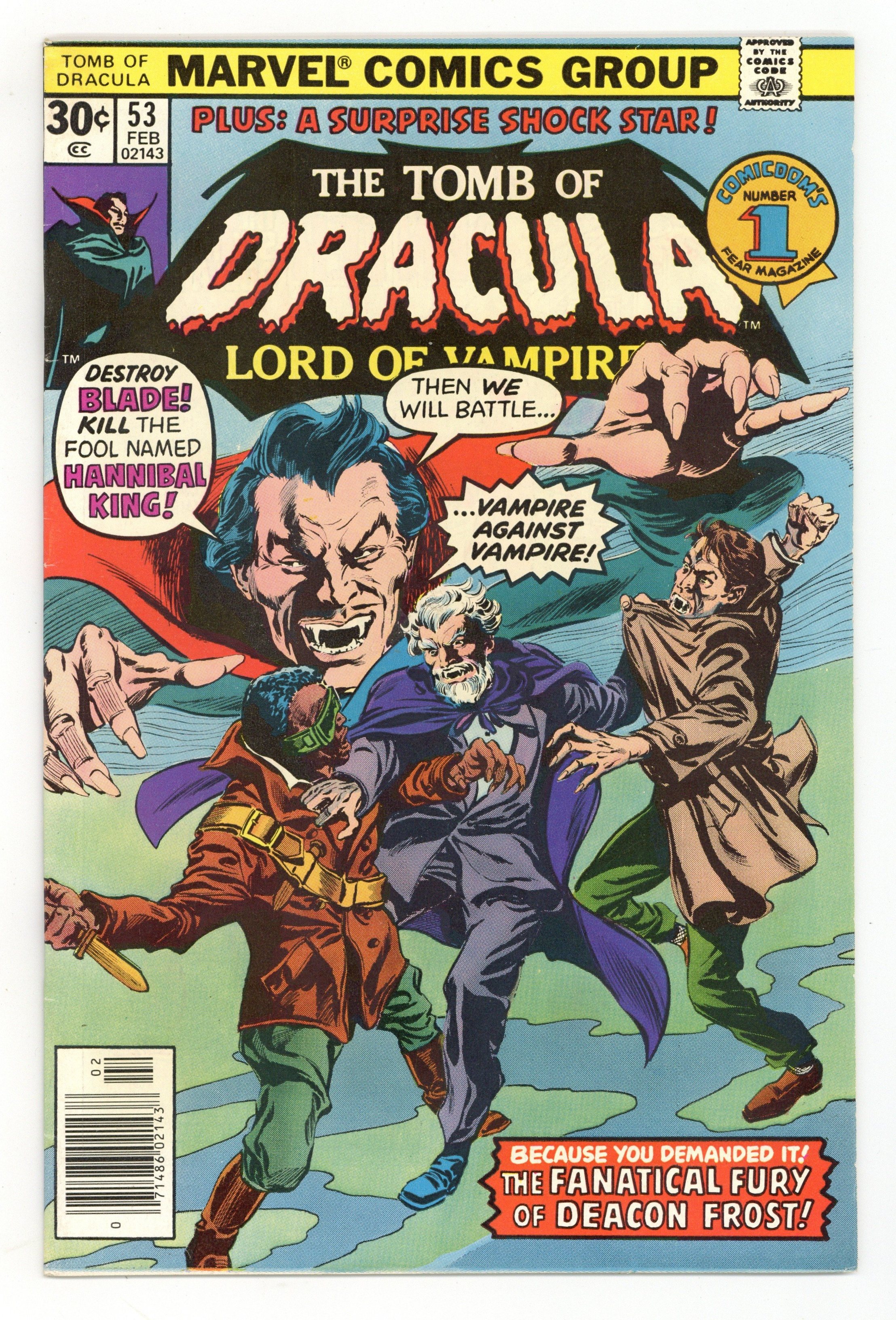 Starts May 4 Blade battles Hannibal King in "Crossfire!" Story introduces Deacon Frost, the vampire who bit Blade's mother. Script by Marv Wolfman, pencils by Gene Colan, inks by Tom Palmer. The letters page contains Marvel Value Stamp series B # 92 (Stan Lee). Colan/Palmer cover. Cover price $0.25.