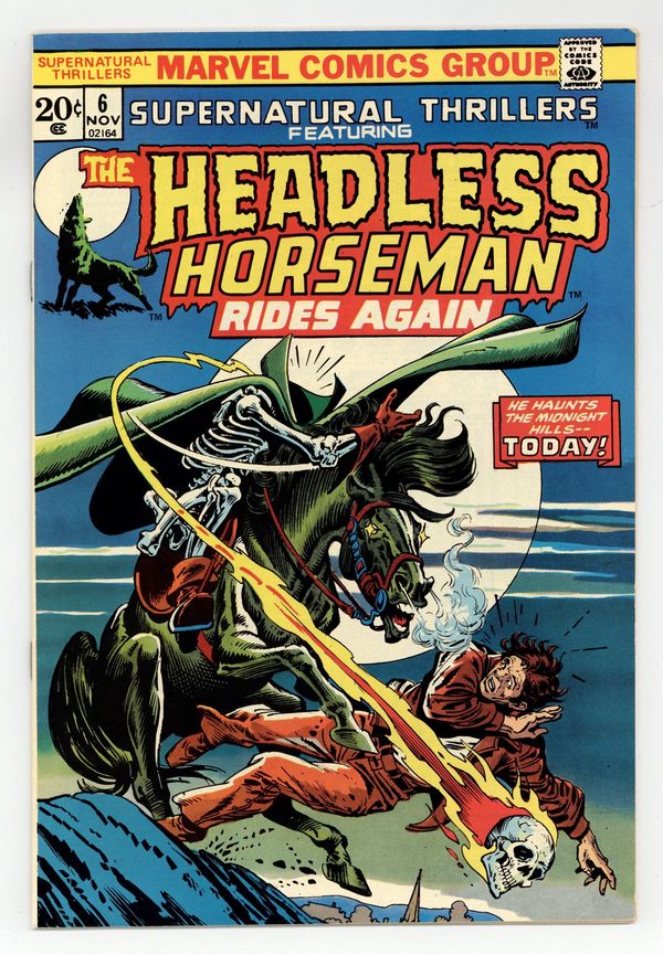 Starts Mar 23 Cover pencils by Gil Kane, inks by Ernie Chan. The Headless Horseman Rides Again!, script by Gary Friedrich, pencils by George Tuska, inks by Jack Abel; Duke Durbano discovers who killed his friend Matt Carter, and tracks down Bones Bullinger; But who is posing as the Headless Horseman? Information on how to join FOOM. 36 pgs. $0.20. Cover price $0.20.