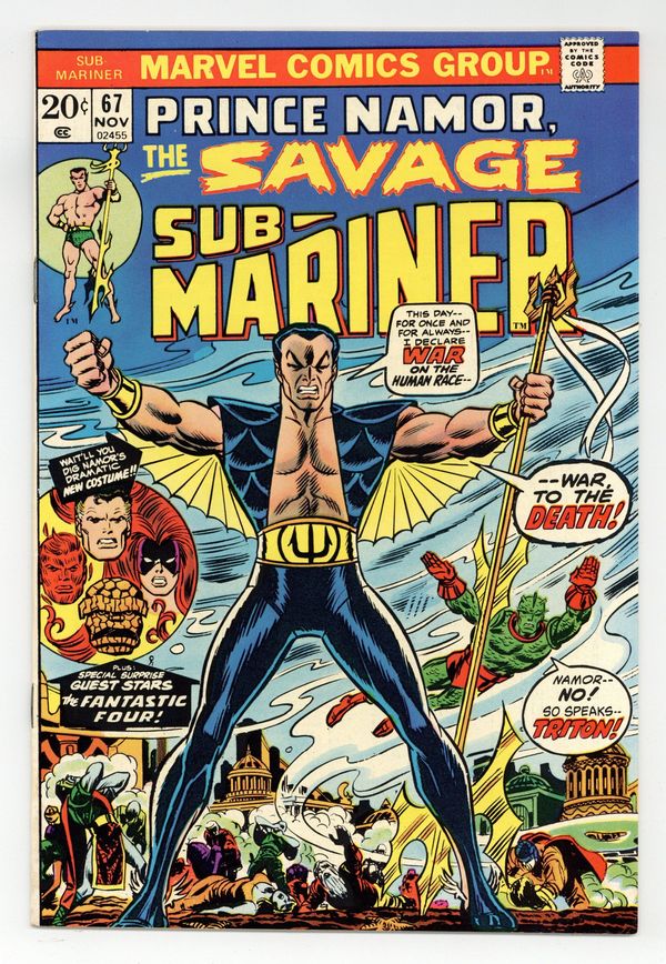 Starts Mar 23 Cover by Sal Buscema. "What the Gods Have Joined Together," script by Roy Thomas, pencils by Sal Buscema, inks by Bernie Wrightson; Namor seeks out Proteus to preside over his marriage to Lady Dorma; They return to Atlantis to face an invasion force of Attuma's barbarians. Namor and his forces drive them off with some help from Lemurian forces who have come to Atlantis to attend the wedding; Namor destroys Attuma's supreme weapon and defeats Attuma in combat; Namor then turns his attention to his wedding and awaits Lady Dorma at the altar; They are married, but as it turns out, Llyra was posing as Lady Dorma and announces herself as queen of Atlantis. 36 pgs., full color. $0.15. Cover price $0.15.