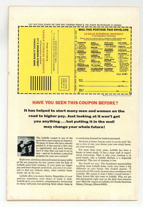 Starts Mar 23 Cover pencils by Jack Kirby, inks by John Romita. "Here Lies Hiddenโฆ the Unspeakable Ultimo!", script by Stan Lee, pencils by Gene Colan (as Adam Austin), inks by Jack Abel (as Gary Michaels); While being arrested for the use of the Enervation Intensifier, Tony Stark is suddenly transported through time and space; But where will he end up?; The Freak turns back into Happy, but then the Mandarin attacks. "The Gladiator, the Girl, and the Glory!", script by Stan Lee, art by John Romita; Batroc and Captain America duke it out over the vial of Inferno 42. Statement of Ownership: Average no. copies each issue during preceding 12 months: 367,728. 36 pages, full color. Cover price $0.12.